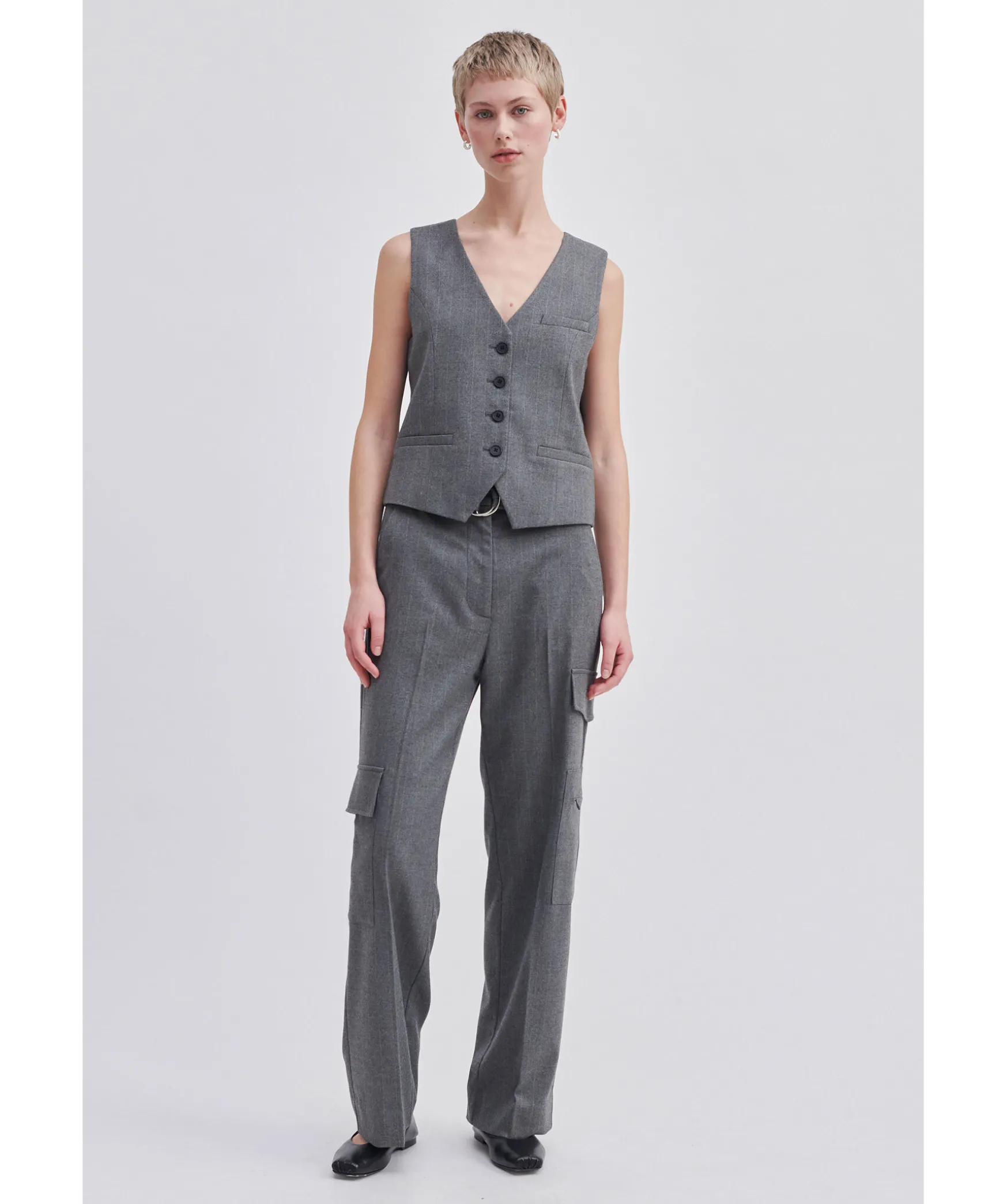 Graa Kostymbyxor Fran Second Female Med Kritstrecksrander. Stangs Med En Dold Dragkedja Och Hakstangning I Midjan. Resar Baktill I Midjan Och Hallor For Balte. Tva Snedstallda Fickor Fram, Tva Dekorativa Passpoalfickor Bak. Mellanhog Midja Och Breda, Raka Ben.