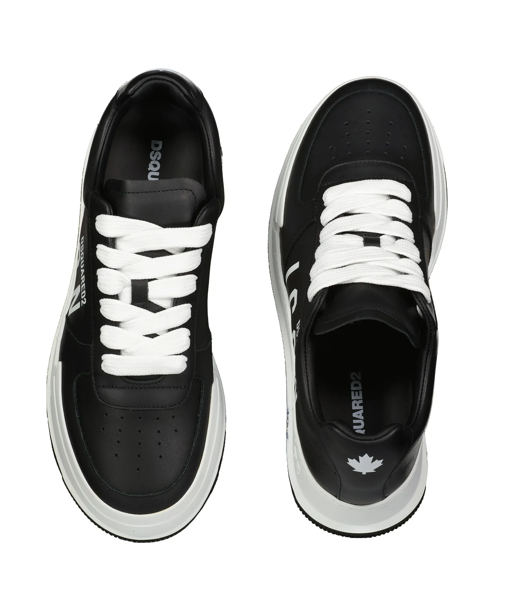 Svarta Sneakers Fran Dsquared2. Vit Nederdel Av Skon Med Liten Praglad ”D2” Logotyp, Svart Sula. Tryckt, Vit Logotyp Pa Skons Utsida Samt Pa Halen. Vita, Breda Och Platta Skosnoren.