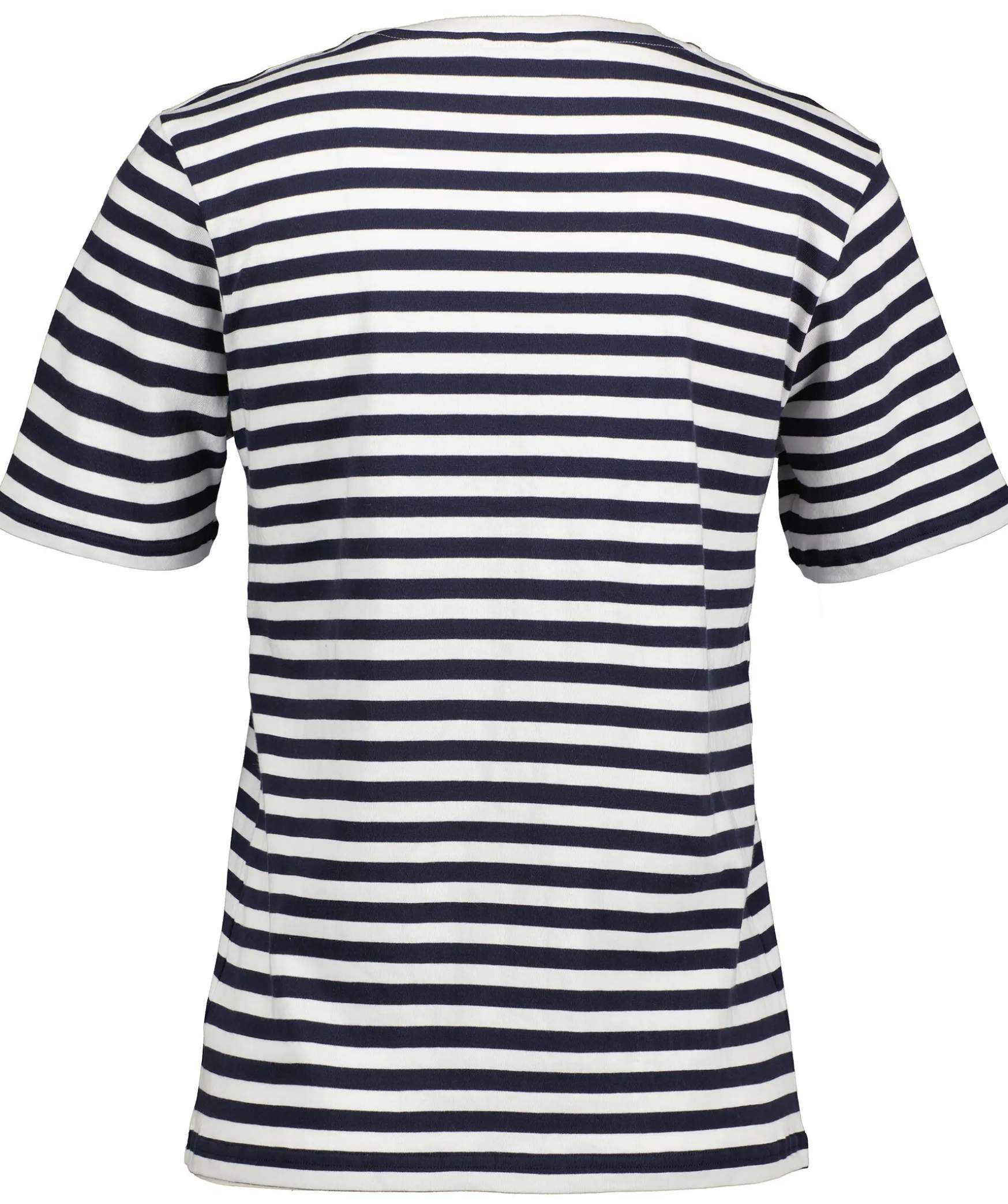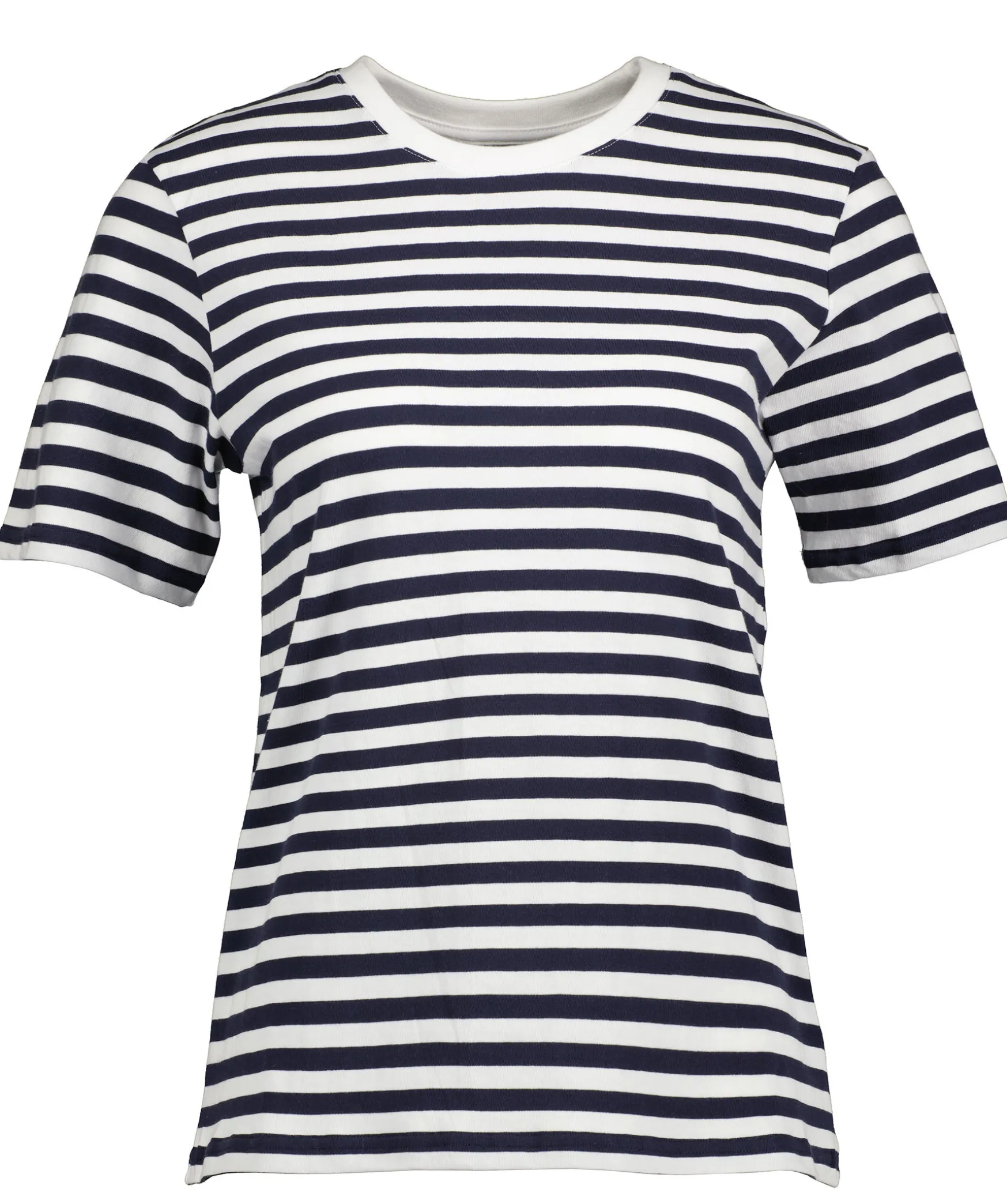 Klassisk Morkbla Och Vit Randig T-Shirt Fran Boomerang. Tillverkad I 100% Ekologisk Bomull Av Hog Kvalitet Och Darmed Ocksa Densitet. Halsringningen Har En Bredare Ribbning Och Pa Hoger Axel Finns En Boomerang-Logga Broderad. Normal Passform.
