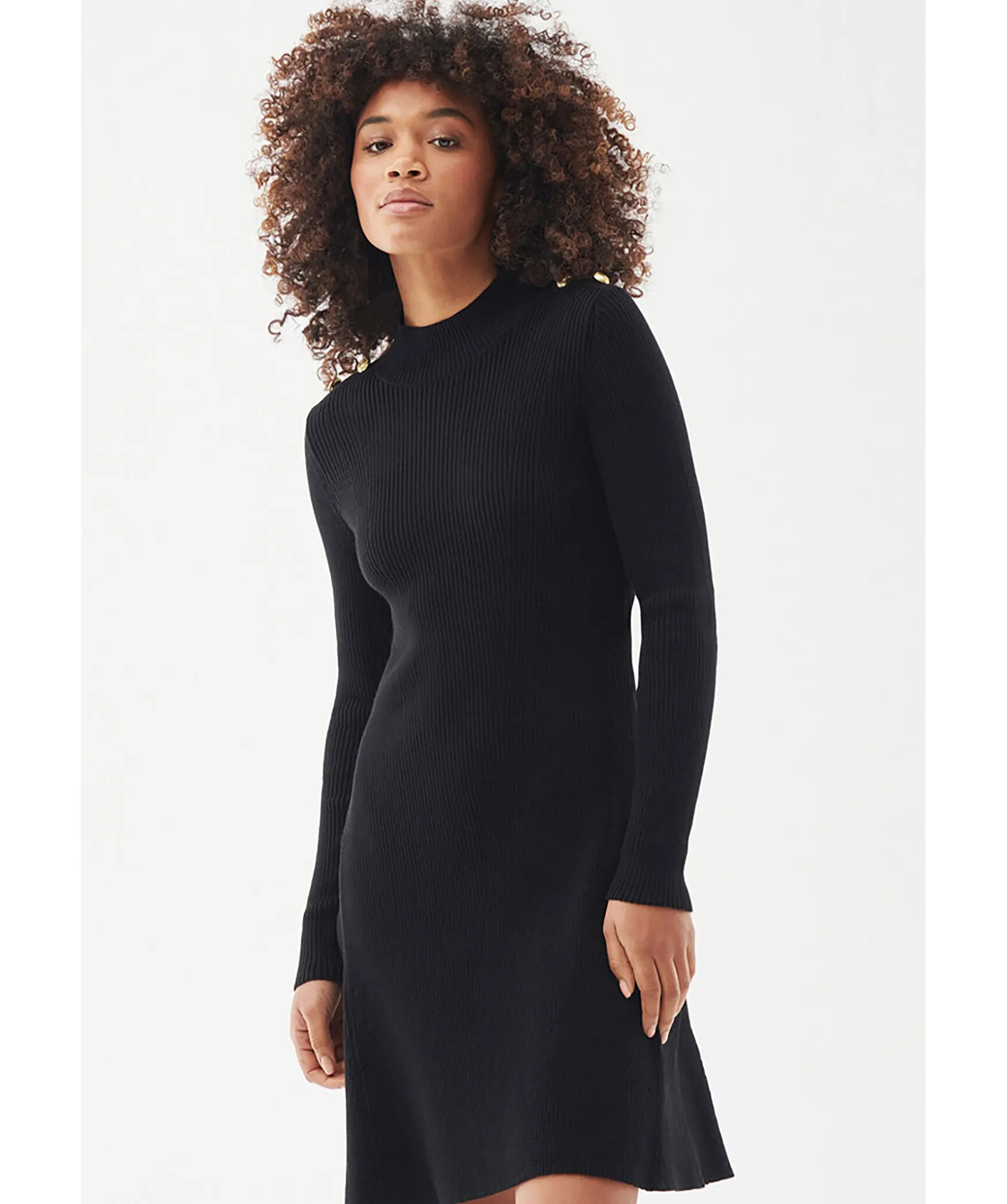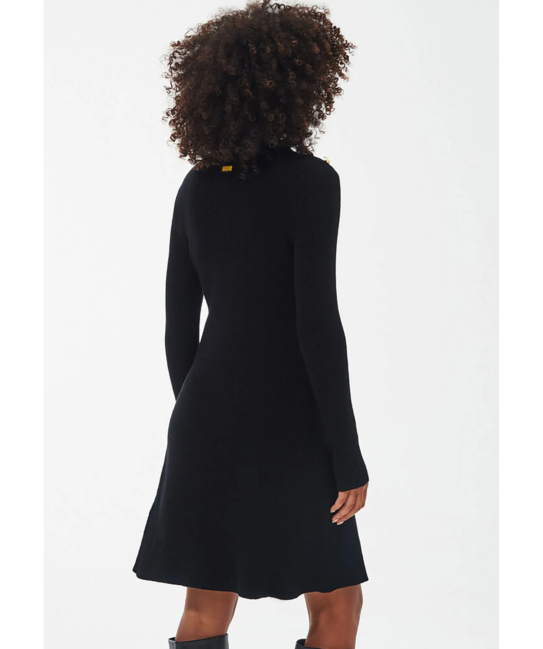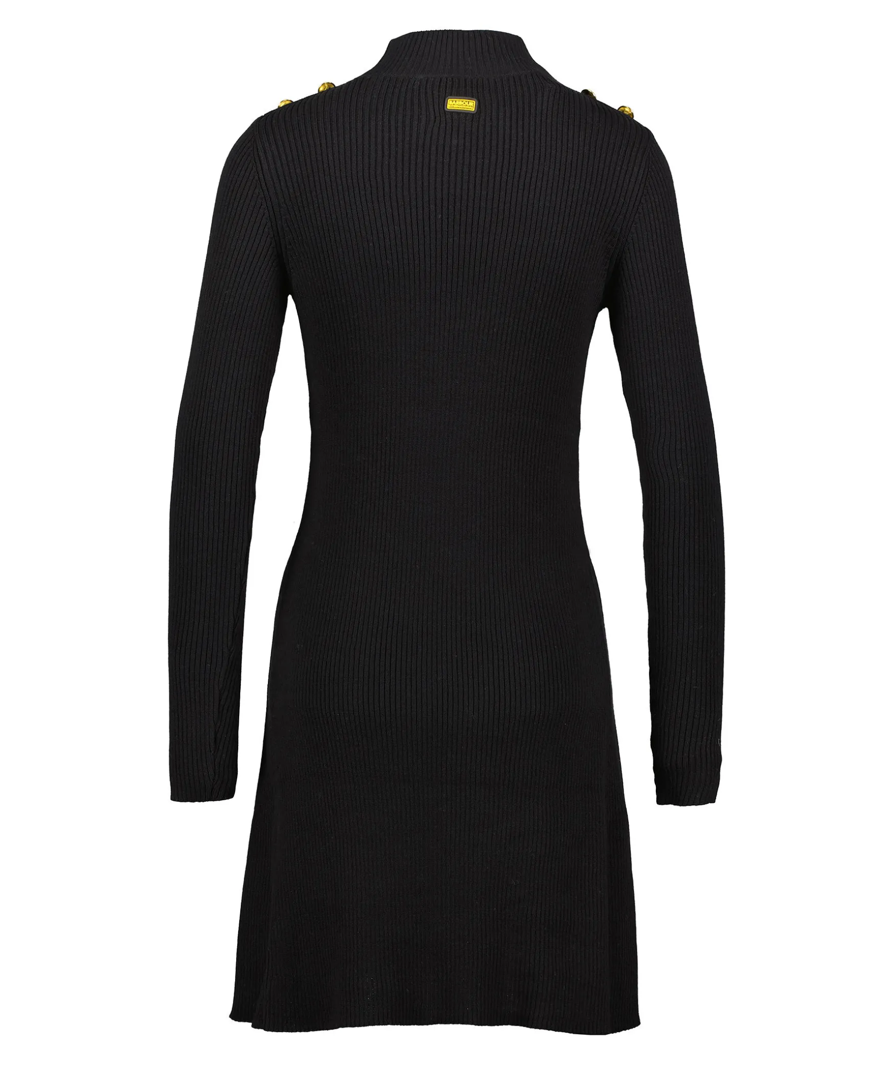 Svart Ribbstickad Klanning Med Langa Armar Fran Barbour. Tillverkad Av Bomull. Klanningen Har Deras Guldfargade Signaturknappar Pa Axlarna Och Nagot Hogre Hals. Gummerad Logotyp I Nacken. Slim Passform.