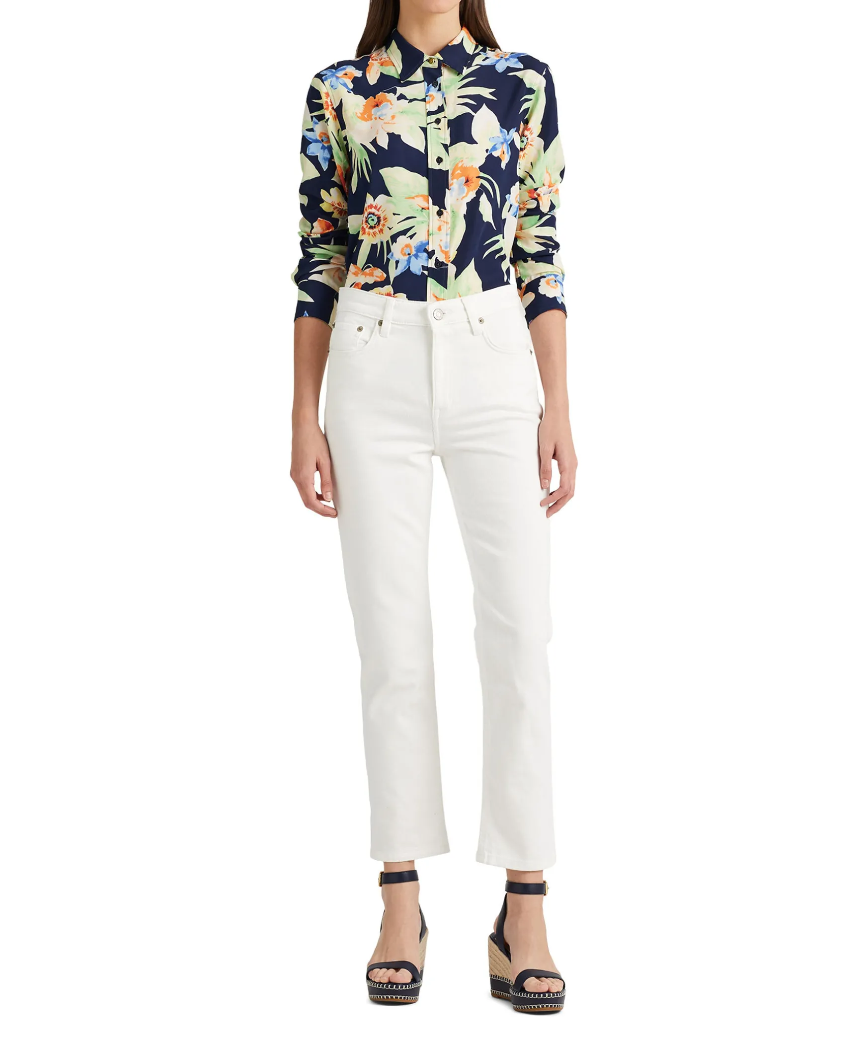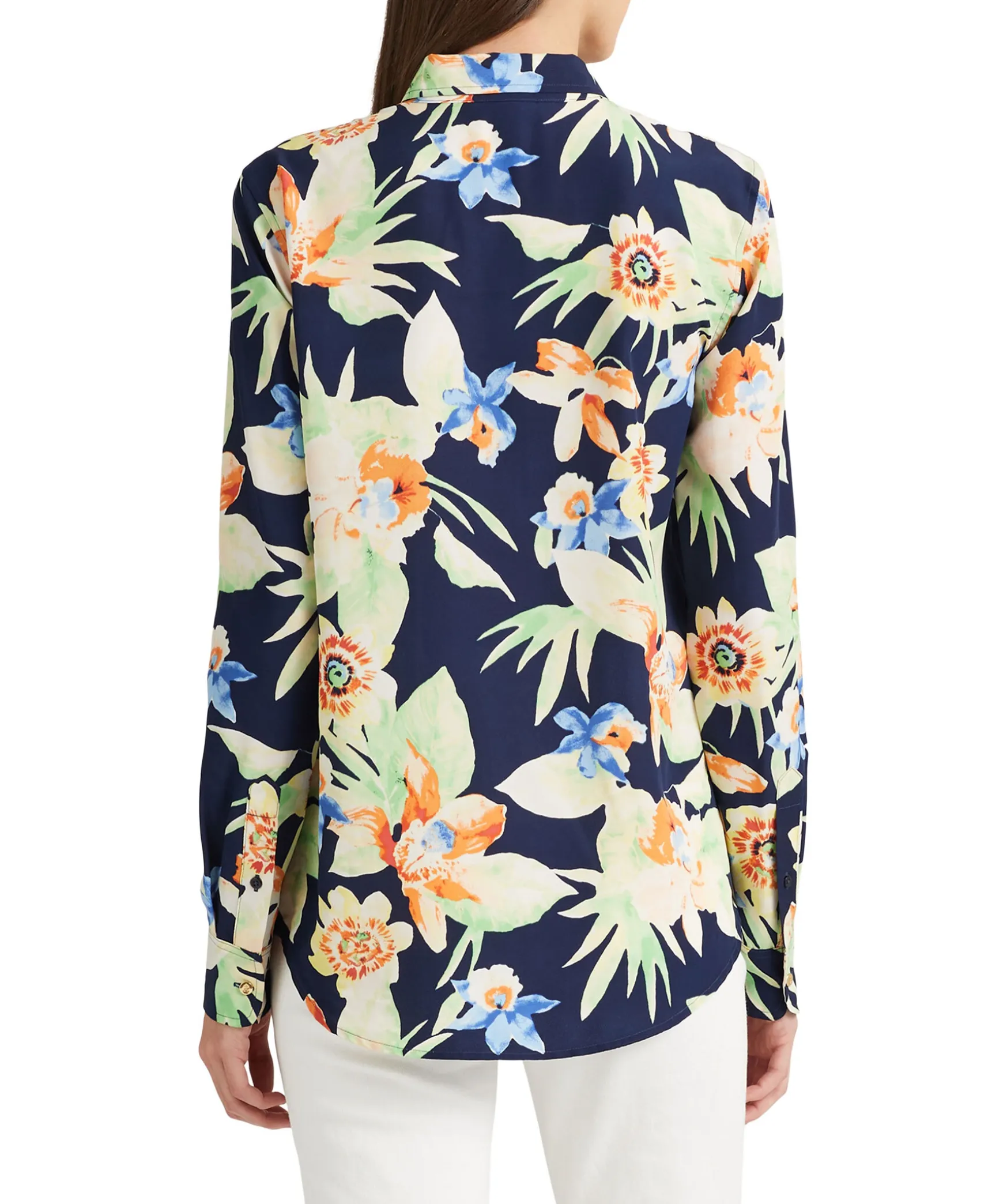 Morkbla, Multifargad Monstrad Skjorta Fran Lauren Ralph Lauren. Spetsig Krage Och Enkla Manschetter Vid Armslut Med Guldfargade Knappar Med Monogram.