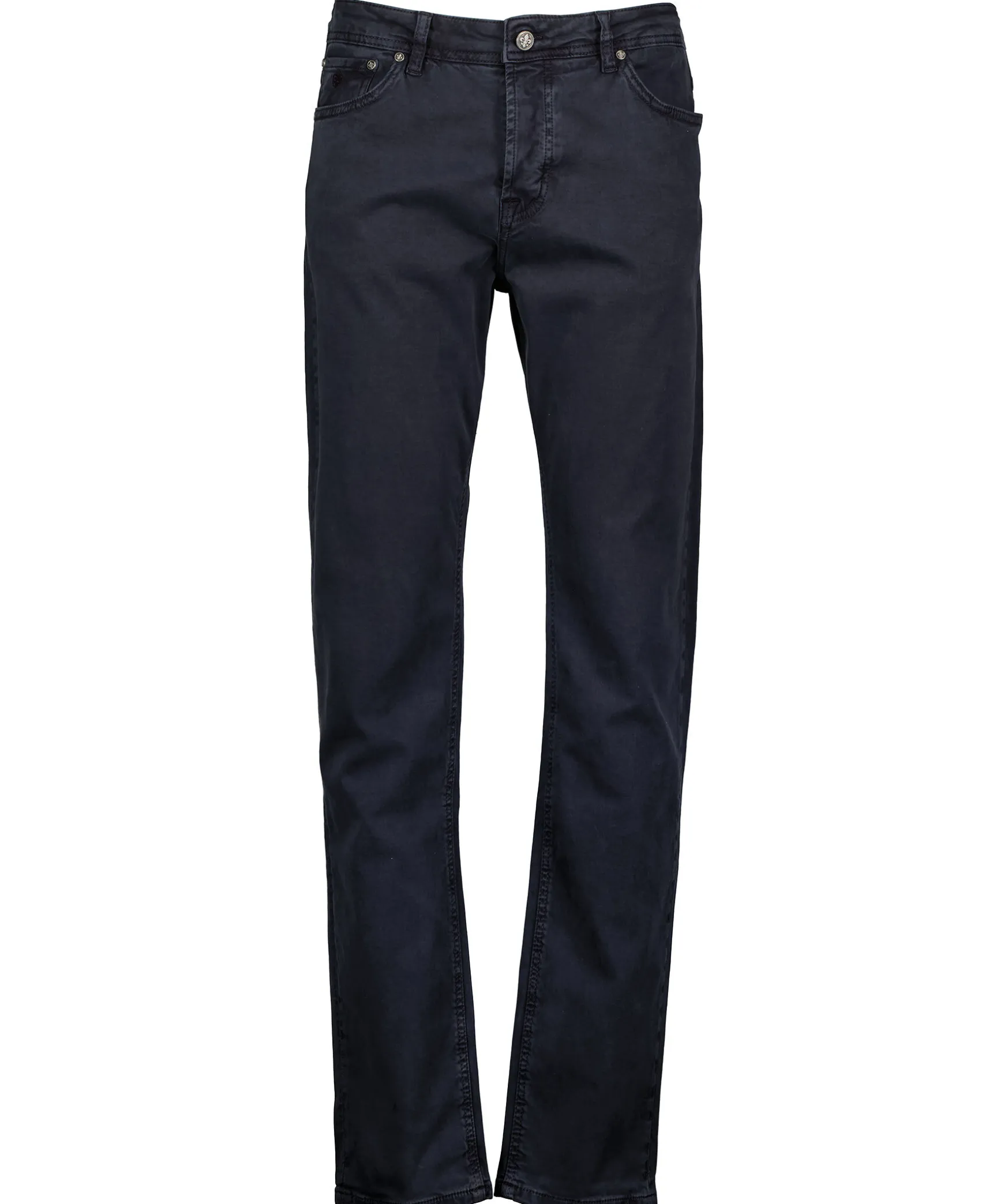 Blaa Jeans Fran Morris. Broderad Logotyp Pa Myntfickan, Fem-Ficksmodell, Slim Fit Modell Med Nagot Vidare Benslut Samt Lader Etikett Baktill.