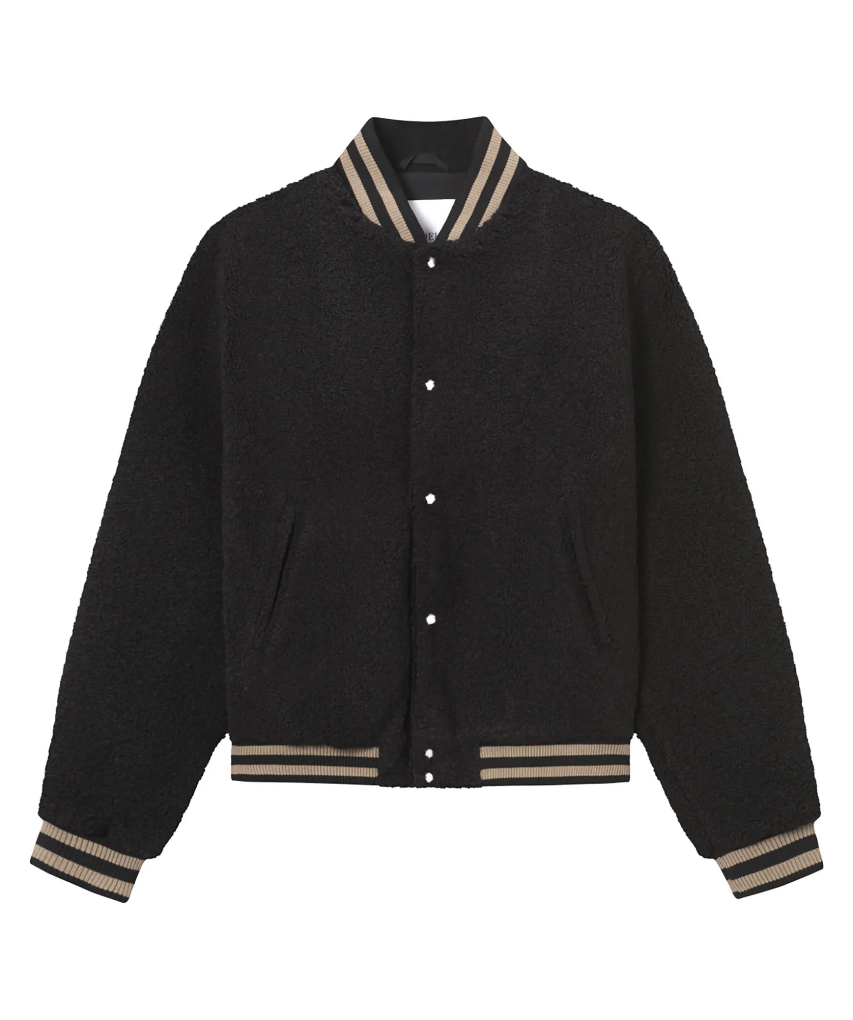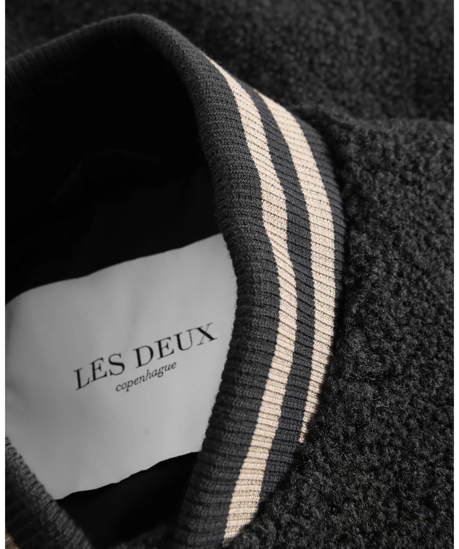 Svart Collegejacka I En Mjuk Fleecefinish Fran Les Deux. Jackan Har Traditionell Rander I Brunt Langs Armarna, Kragen Och Fallen. Tva Sidfickor, En Innerficka, Ribbstickade Fallar Och Armar, Catalina Krage Och Stangs Med Tryckknappar Fram.