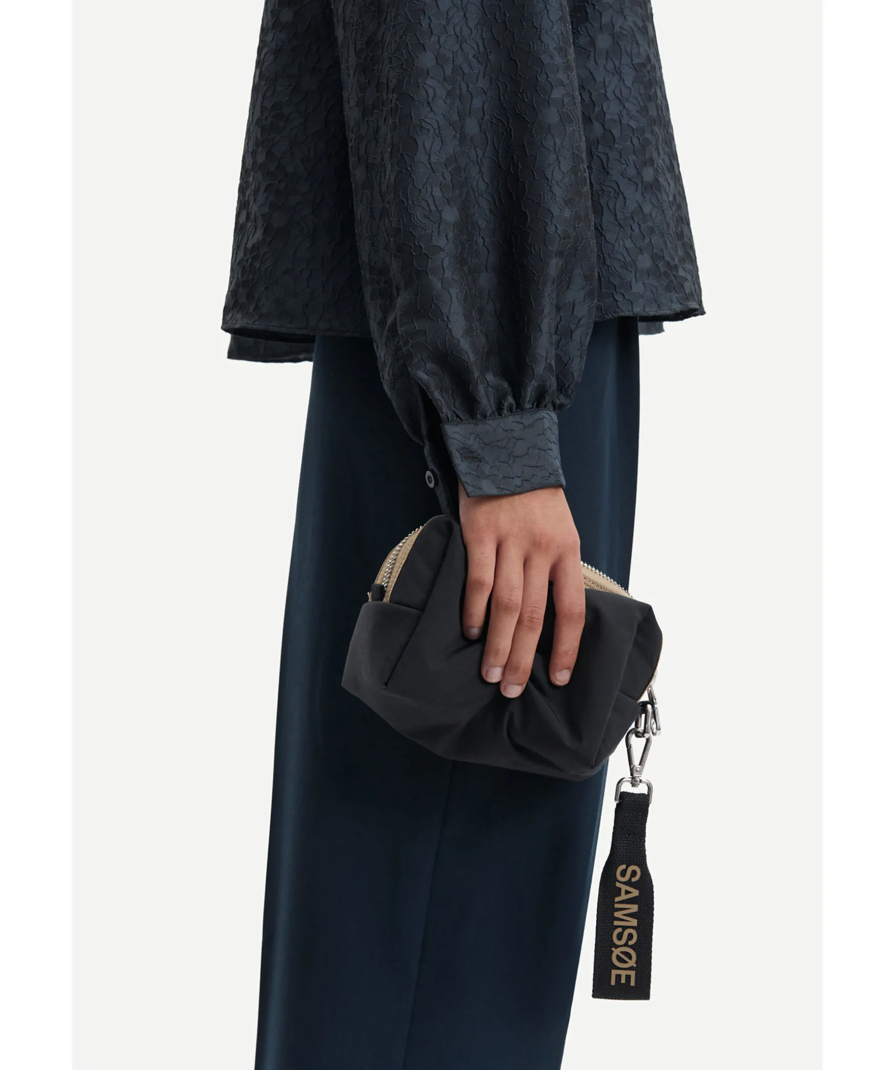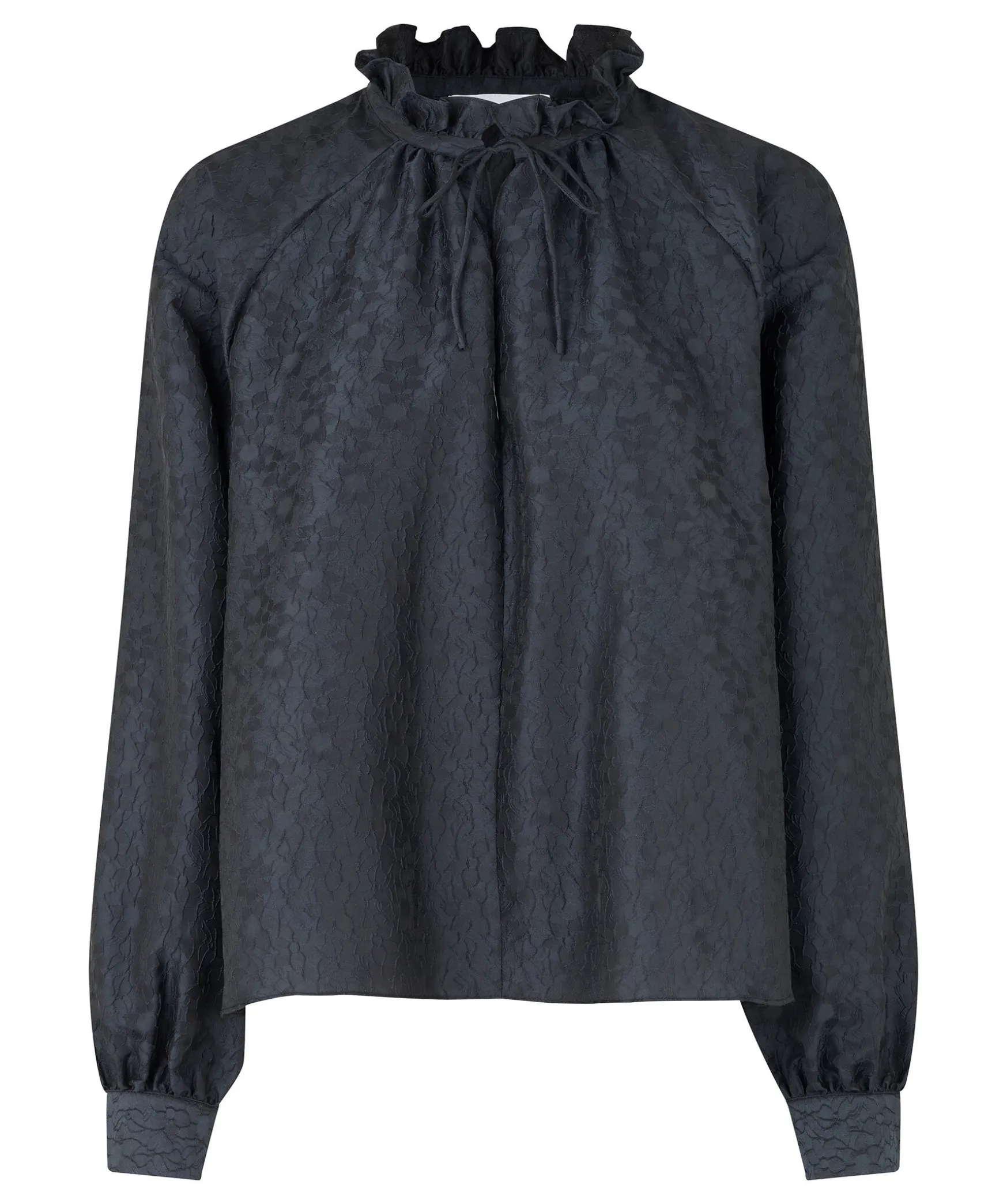 Svart Blus I Avslappnad Passform Fran Samsoe Samose. Langa Puffade Raglanarmar, V-Ringad Oppning Med Knytdetalj Och Rynkad Halsringning Med Volangkrage. Tillverkad I Atervunnet Polyesterblandningstyg Med Ett Tonalt Texturerat Jacquardmonster. Denna Produkt Ar Grs-Certifierad. Varje Steg I Leveranskedjan Har Uppfyllt Stranga Sociala, Miljomassiga Och Kemiska Krav.