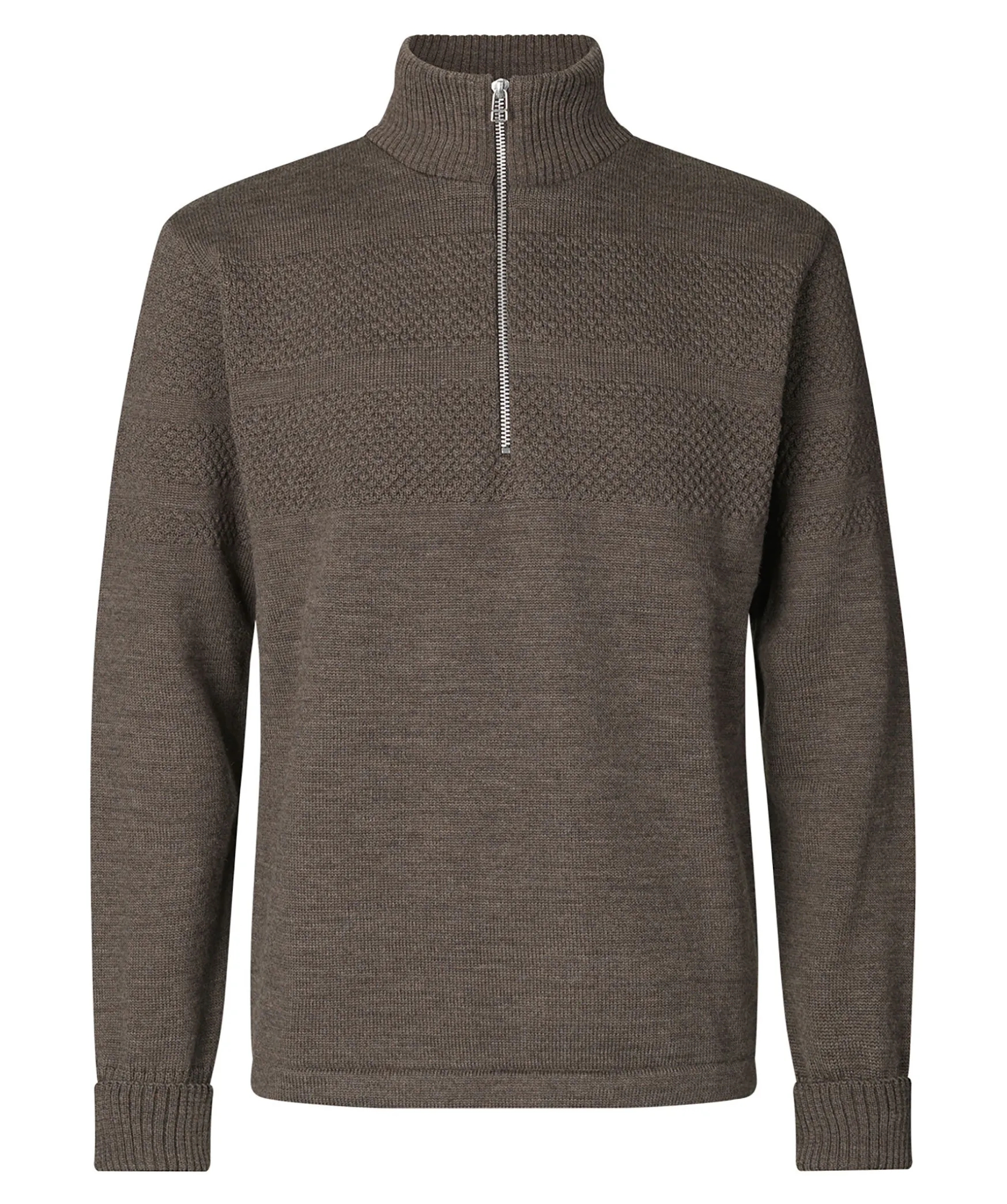 Brun, Stickad Half Zip Troja Fran Mads Norgaard. Deras Troja Wool Klemens Half Zip Knit Ar Gjord Av 100 % Ull. Den Ar Tatstickad, Den Ar Tung Och Den Ar Riktigt Varm. Kanterna Ar Ribbstickade, Halsen Ar Lang Med Dragkedja, Passformen Ar Tight Och Stilen Ar Sailor.