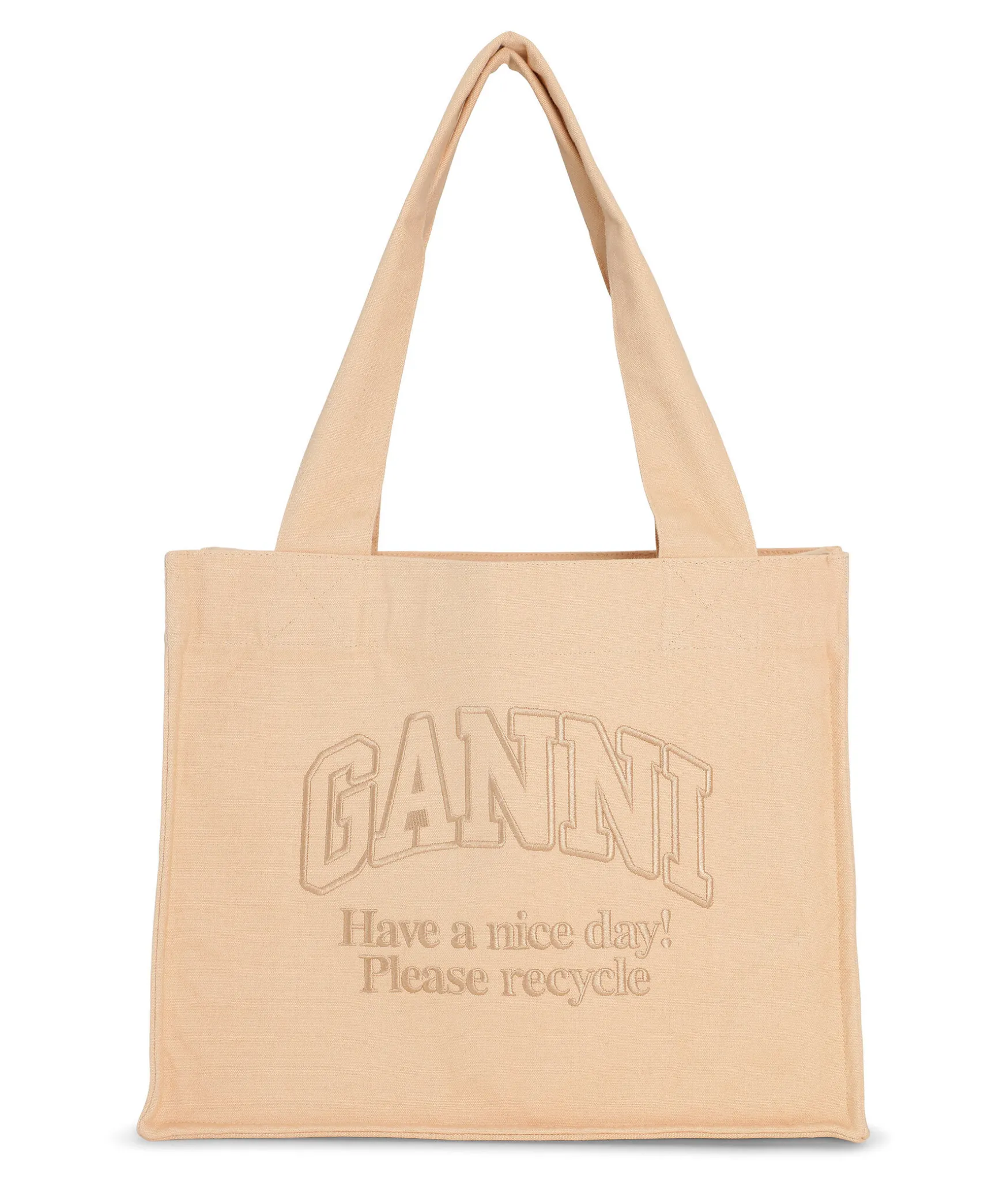 Beige Totebag Fran Ganni. Broderad Ton-I-Ton Logotyp Pa Framsidan. Tillverkad I 100% Atervunnen Bomull. Matt: H31, B38, D17.