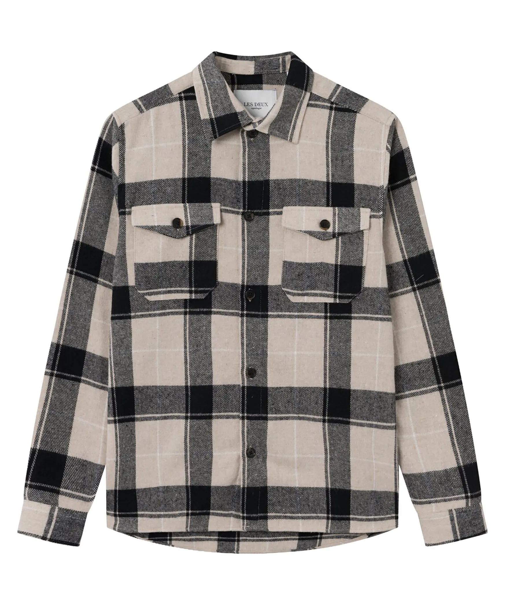 Rutig Skjorta Fran Les Deux I Svart Och Beiget, Gjort I Ett Mjukt Material. Tillverkad I En Bomulls- Och Polyesterblandning. Button Down Krage, Tva Brostfickor Med Knapp.