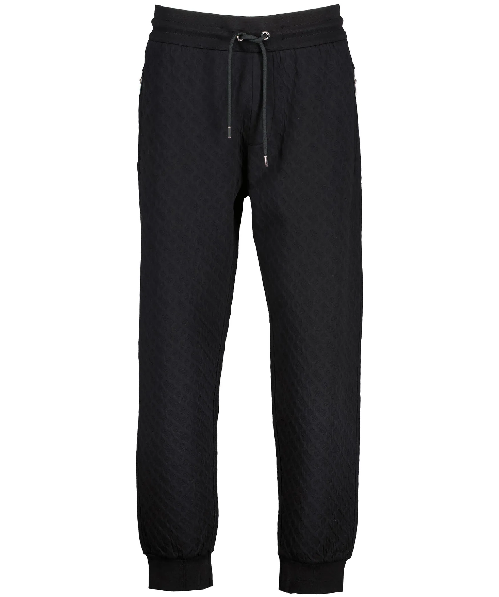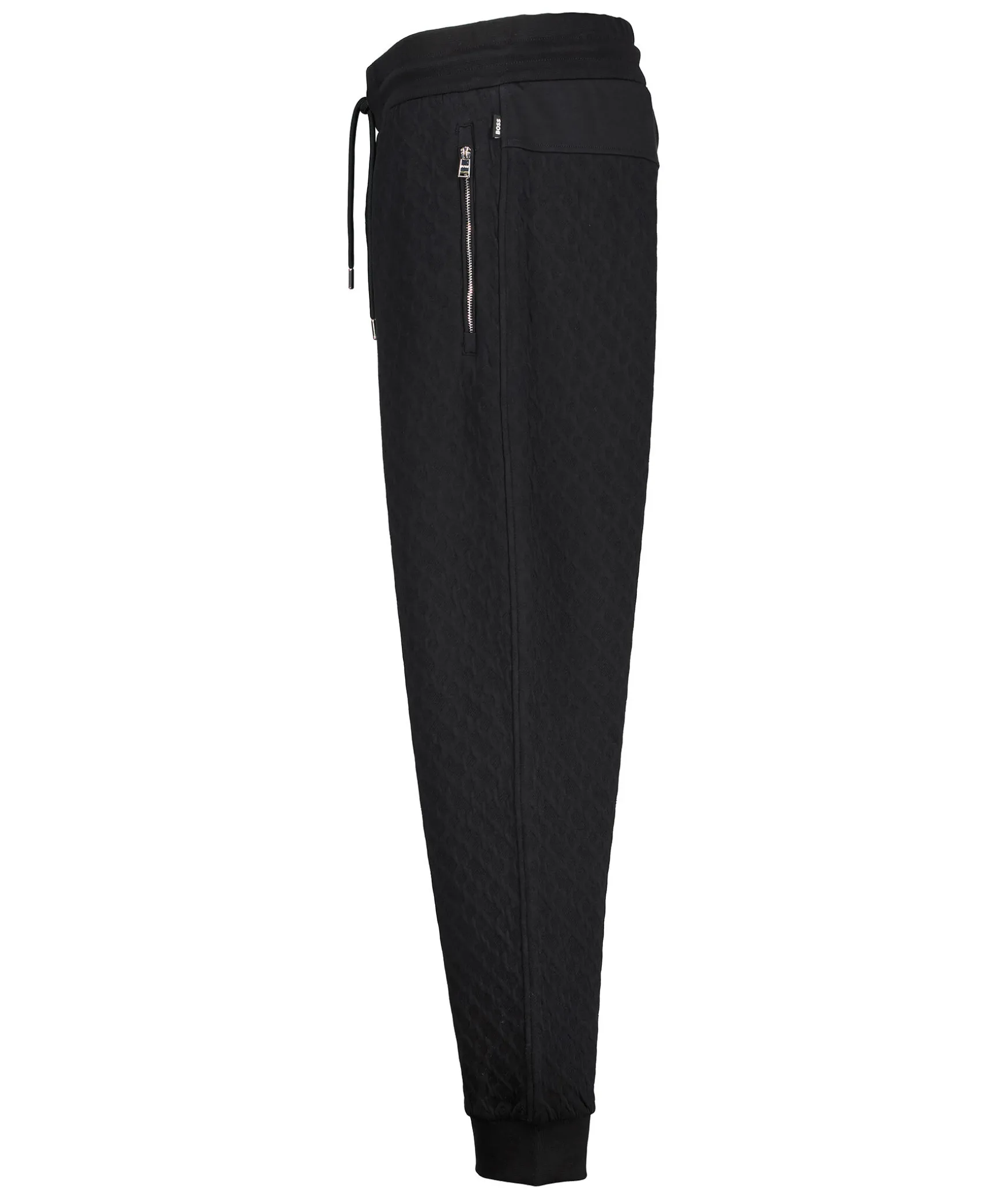 Svarta Mjukisbyxor Fran Boss Black Med Tonalt Monster. Tva Sidfickor Med Dragkedja, Snorning I Midjan Och Ribbstickade Muddar Vid Benslut. Tillverkade I En Bomullsblandning.