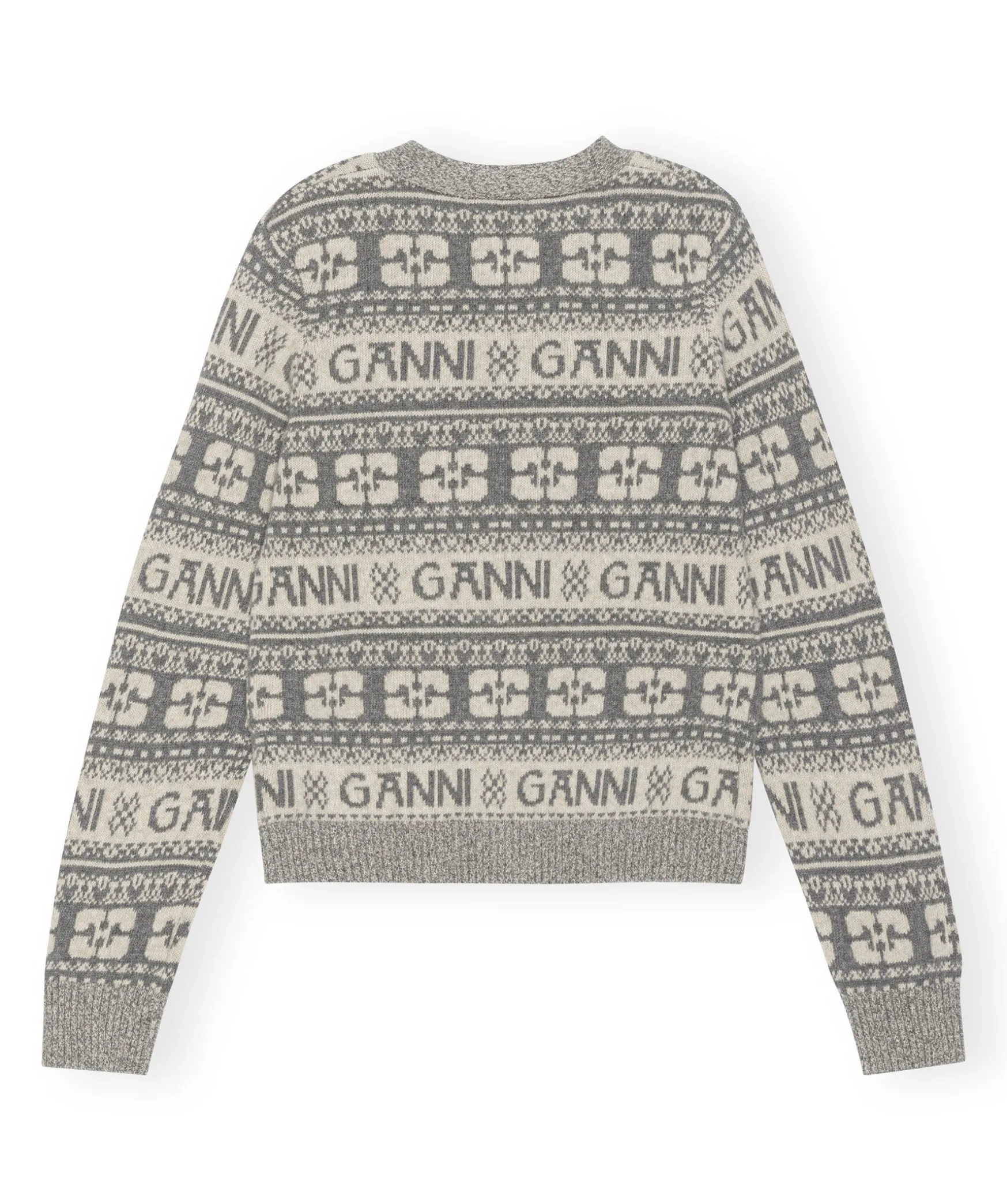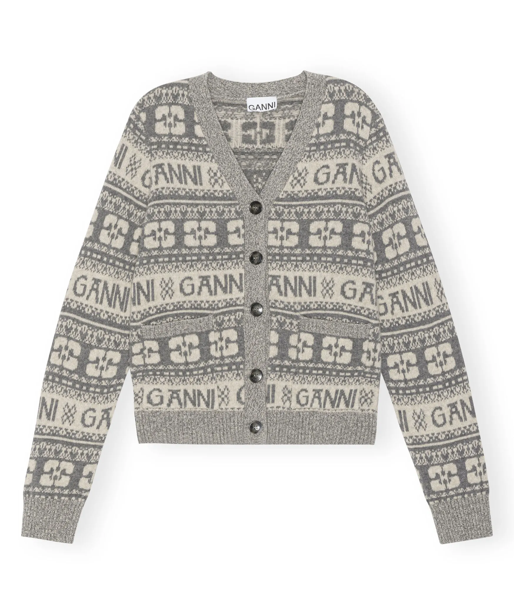 Gra Kofta Fran Ganni. Gjord I En Ullblanding Och Har Ett Logotypmonster Runt Plagget. Normal Passform Och V-Ringad Hals. Knappstangning Och Tva Framfickor.