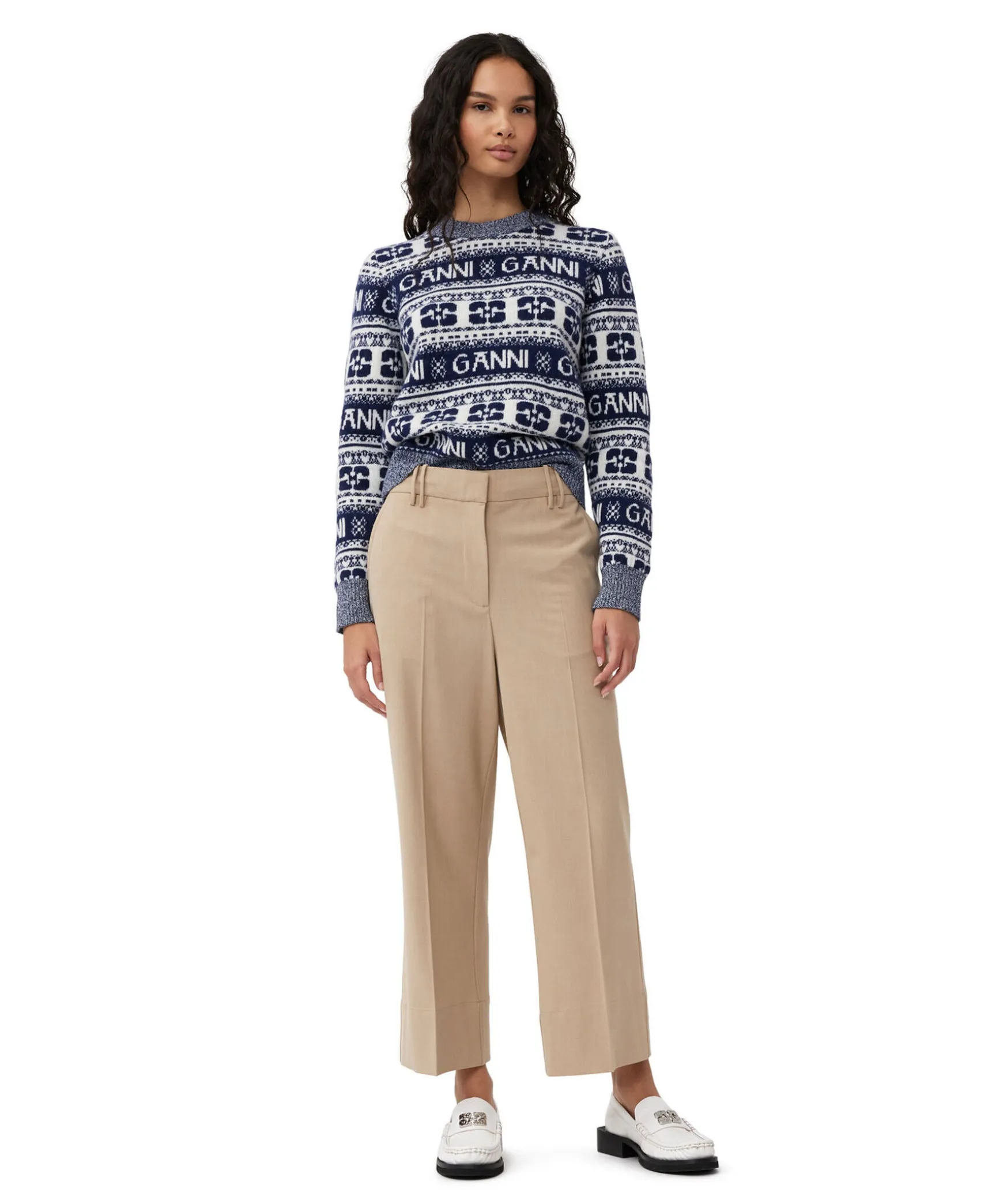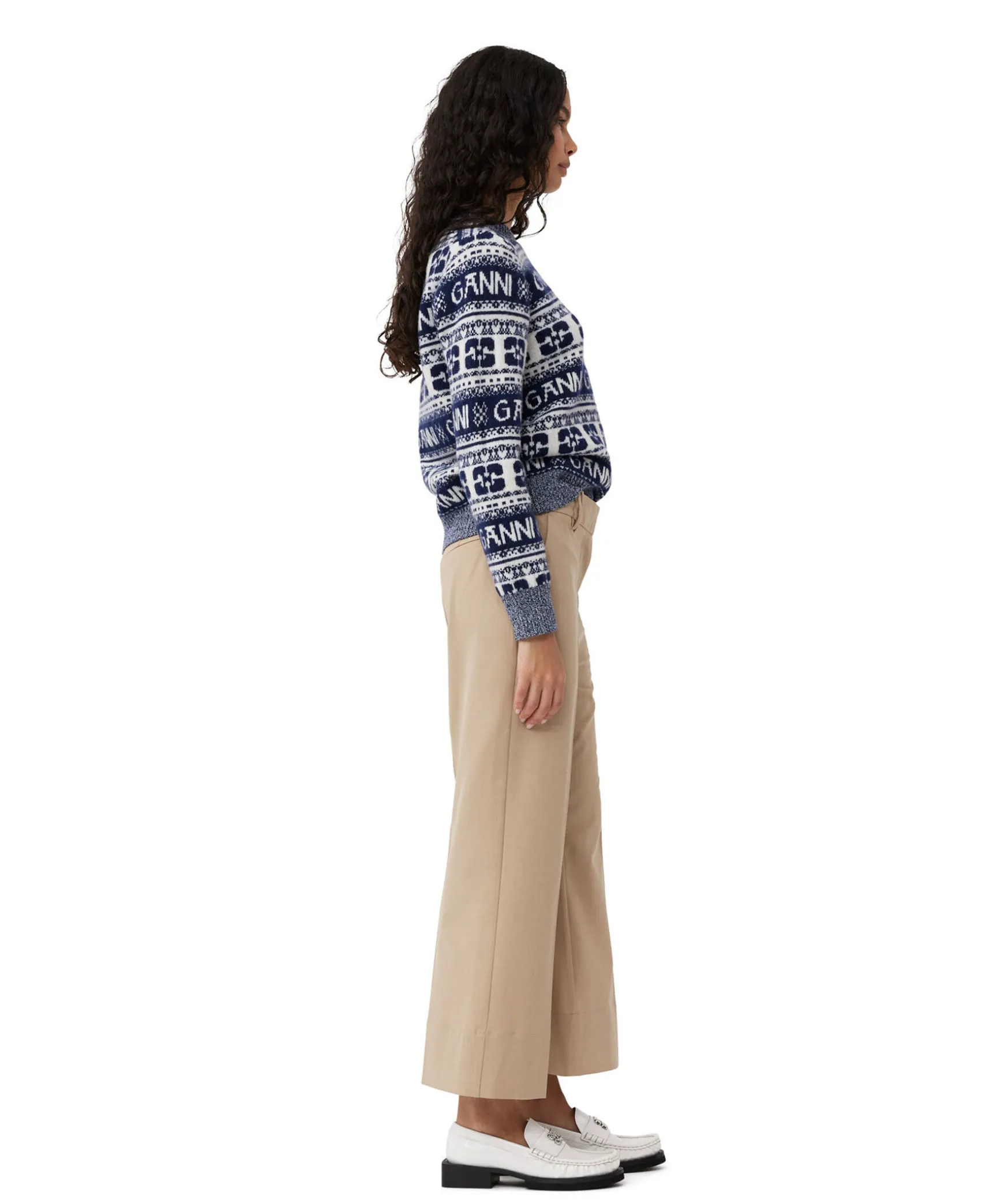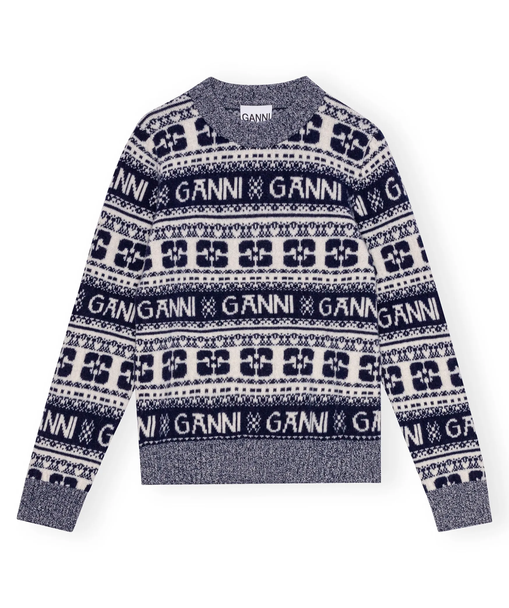 Blamonstrad Och Stickad Troja Ganni. Tillverkad Av Ull, Atervunnen Ull Och Atervunnen Polyamid. Trojan Ar Designad For En Normal Passform Och Har En Rund Halsringning, Ribbade Kanter Och Ett Grafiskt Ganni-Monster.