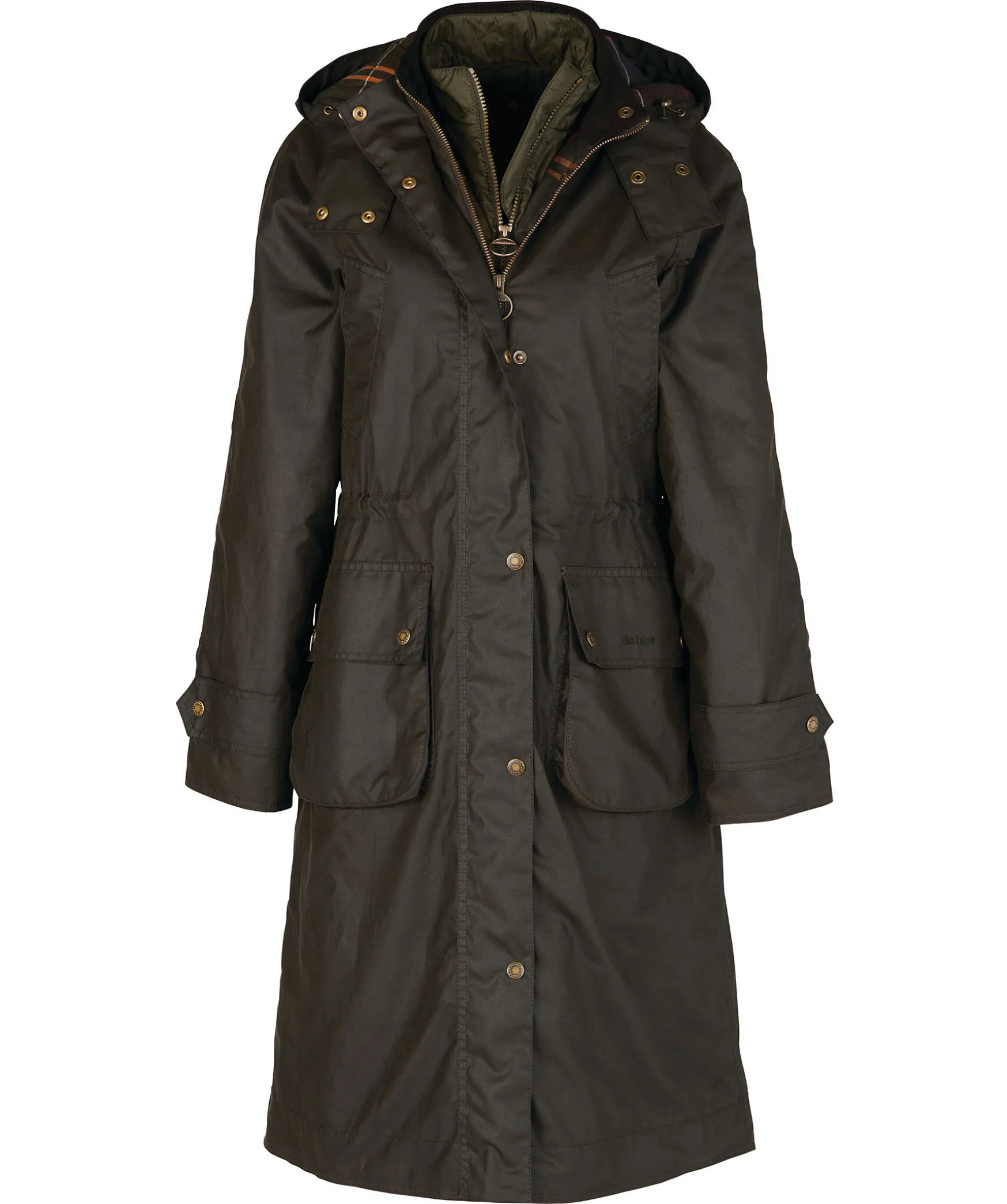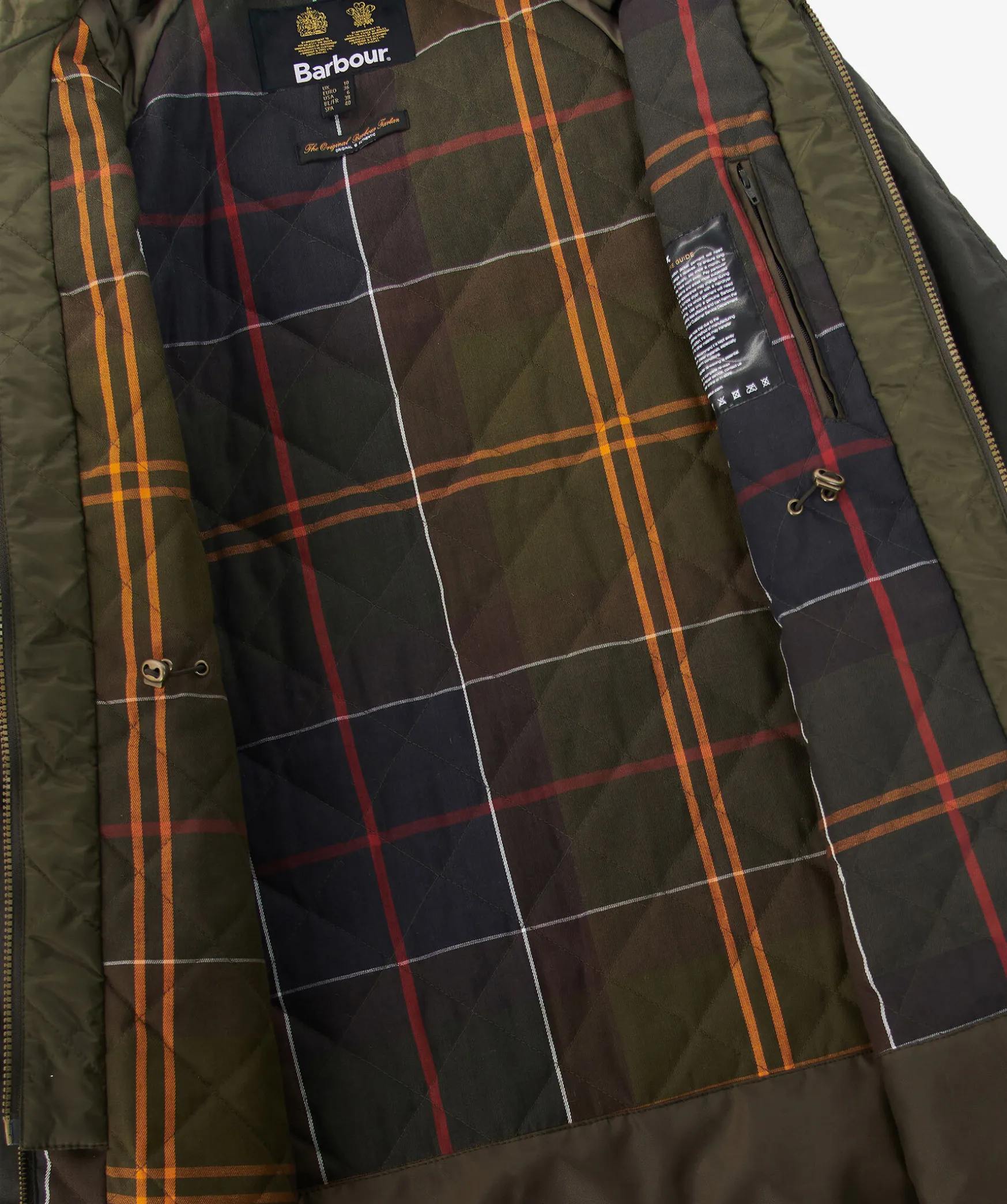 Parkas Fran Barbour Med Deras Klassiska, Vaxade Bomullstyg Pa Utsidan Och Quiltat, Extraforstarkning Pa Insidan Med Skyddande Krage. Lang Design, Fast Luva, Tva Stora Fickor Framtill Med Diskret Logotyp. Rutigt Foder, Dragsko I Midjan. Jackan Far Ej Tvattas.