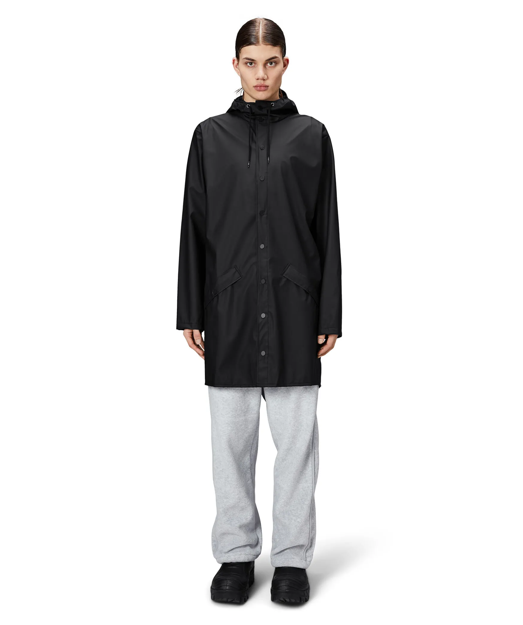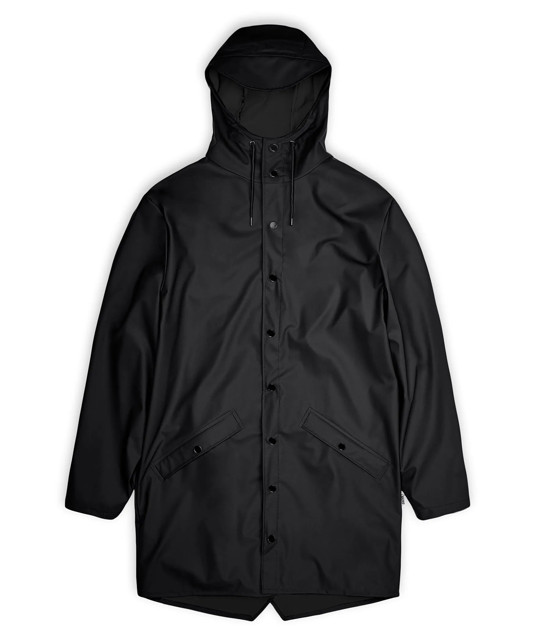 Svart Lang Regnjacka Fran Rains. Stangs Framtill Med Tryckknappar. Luva Med Dragsko. Snedstallda Fickor Som Stangs Med Tryckknappar.
