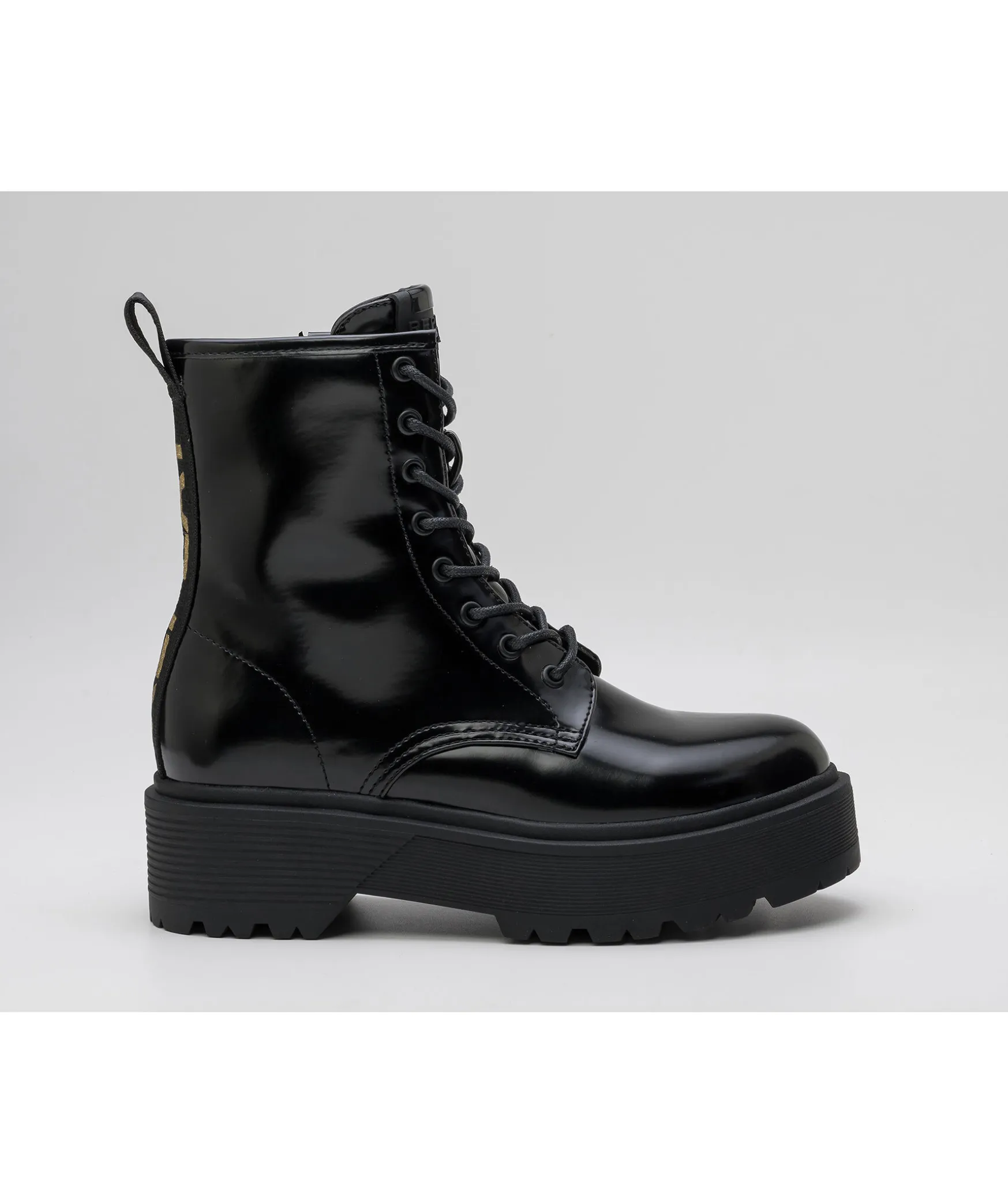 En Punk Inspirerad Militar Stovel Med En Ovandel Gjort Av Skinande Premuim Brush-Off Pu Och En Guld Loga Baktill. Med En Extra Komfort Ifran Ortholit Sulan.