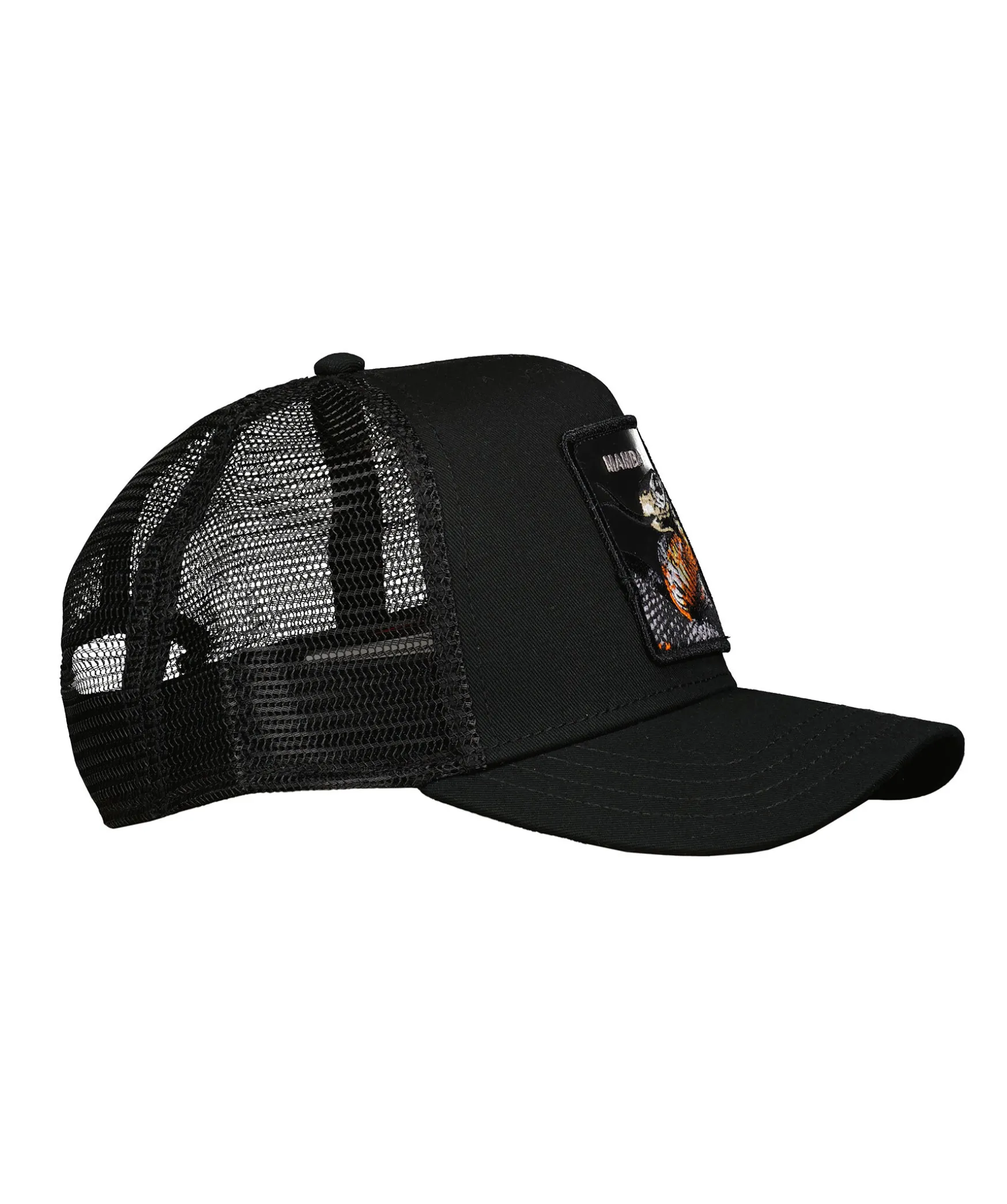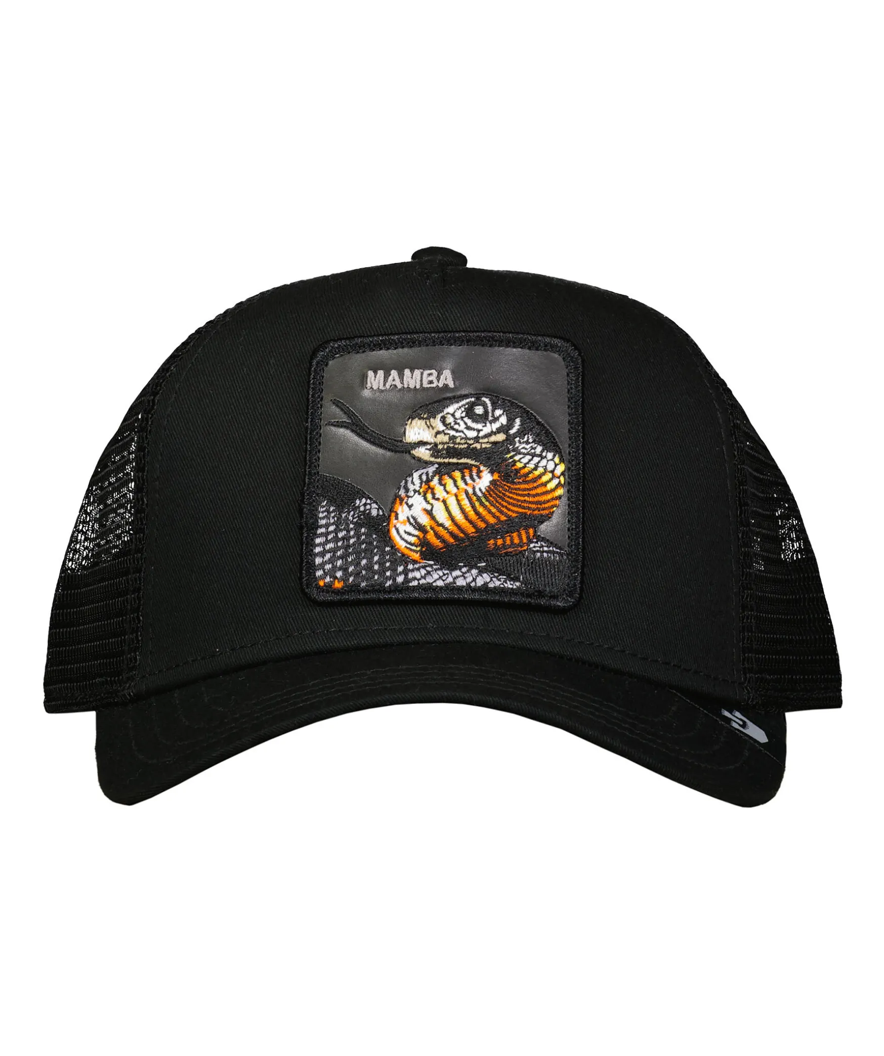 Svart Keps Med Meshtyg Baktill Fran Goorin Bros. Fyrkantig Patch Med En Orm Och En Text ”Mamba”. Onesize Modell Med Ett Justerbart 4-Snap-In-Rem. Tillverkad I En Polyesterblandning.