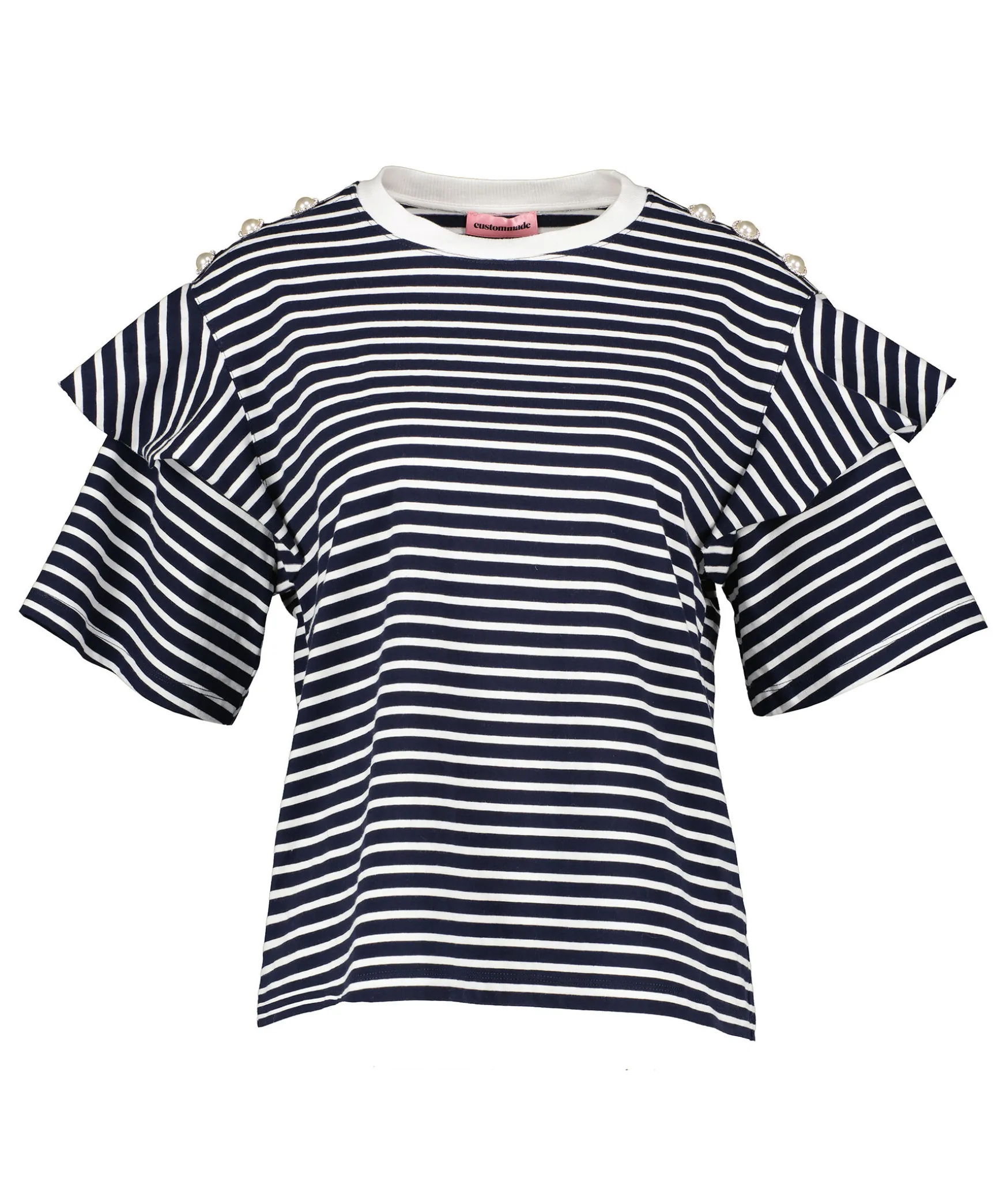 Marinbla Och Vitrandig T-Shirt I En Avslappnad Passform Fran Custommade. T-Shirten Har Tre Strassparlor Samt Volanger Pa Vardera Axel. Tillverkad I 100% Bomull.