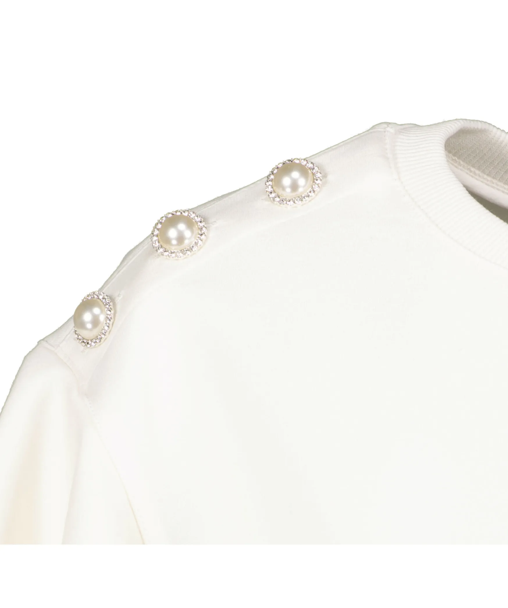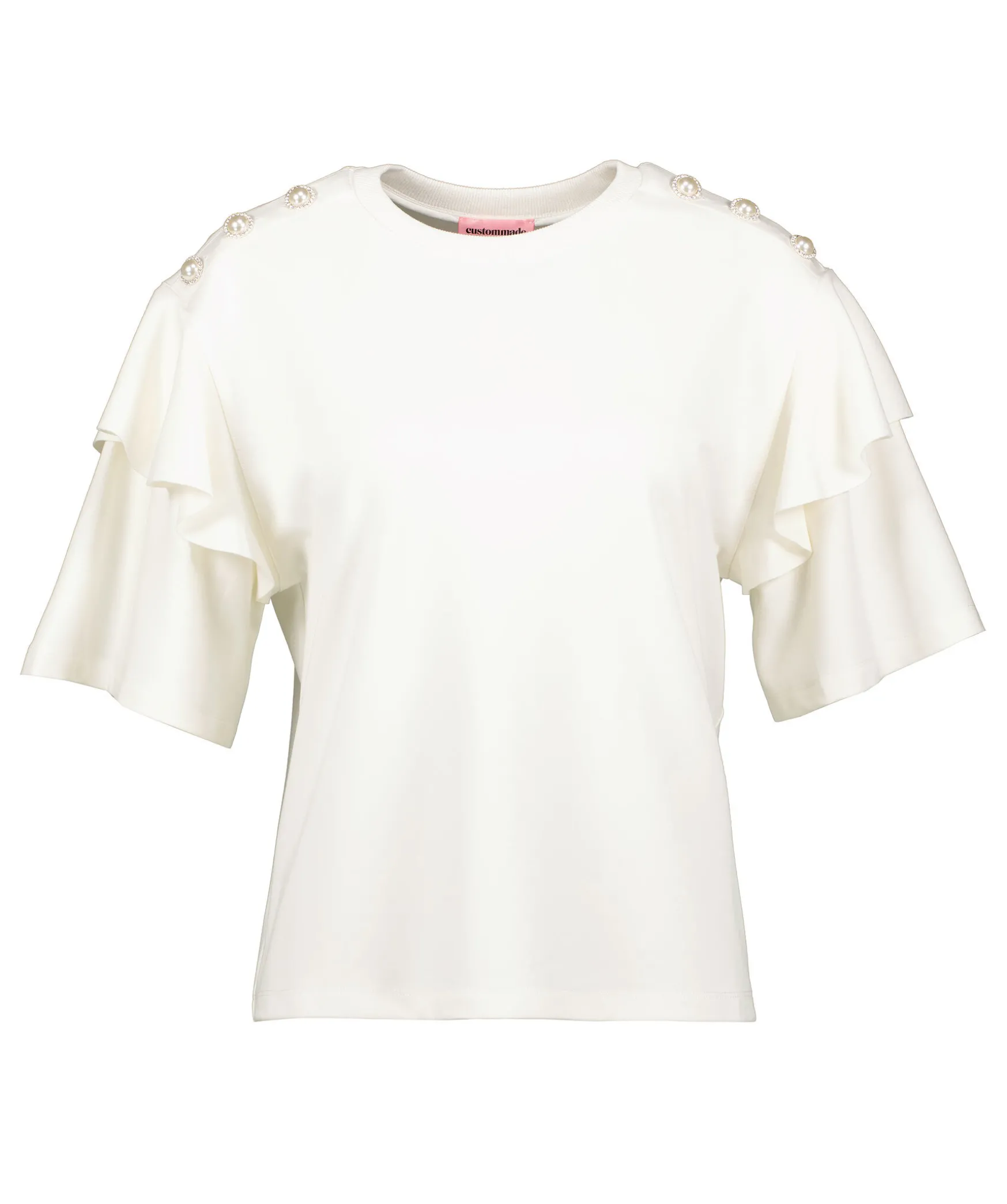 Kramvit T-Shirt Fran Custommade Med Volang Detaljer Vid Armarna. Toppen Ar Gjord I En Rayonblandning Och Har Strassbekladda Knappar Pa Axlarna. Det Korta Armarna Slutar Vid Armbagen.