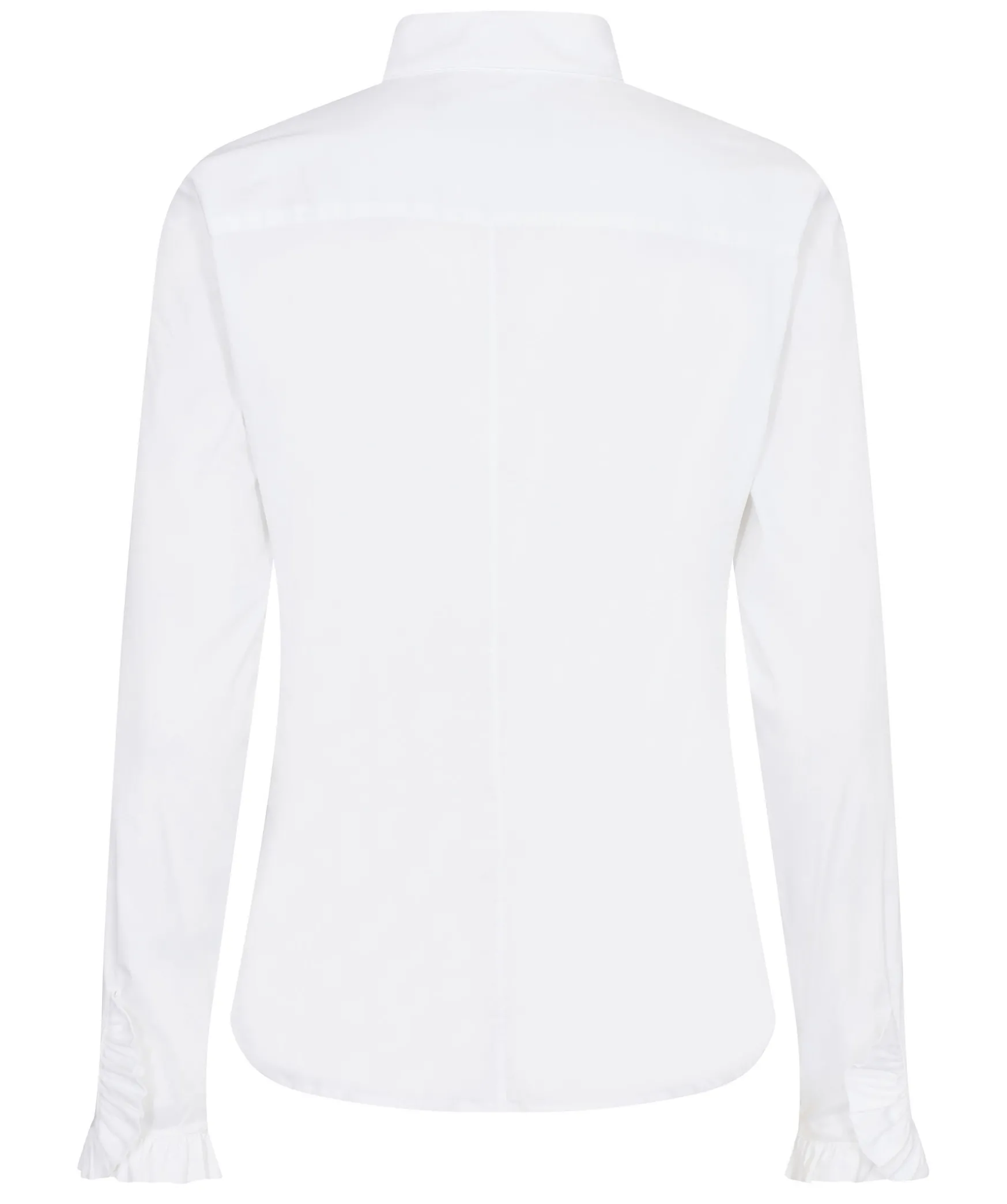 Vit Skjorta I Smickrande Och Smal Passform Fran Mos Mosh. Tillverkad I Mjukt, Stretchigt Tyg Med En Klassisk Krage. Feminina Volanger I Armslut Med En Knapp Och Dold Knappstangning Fram.