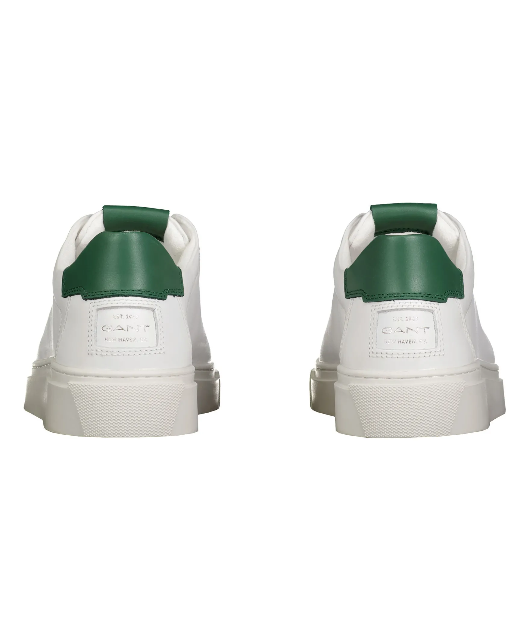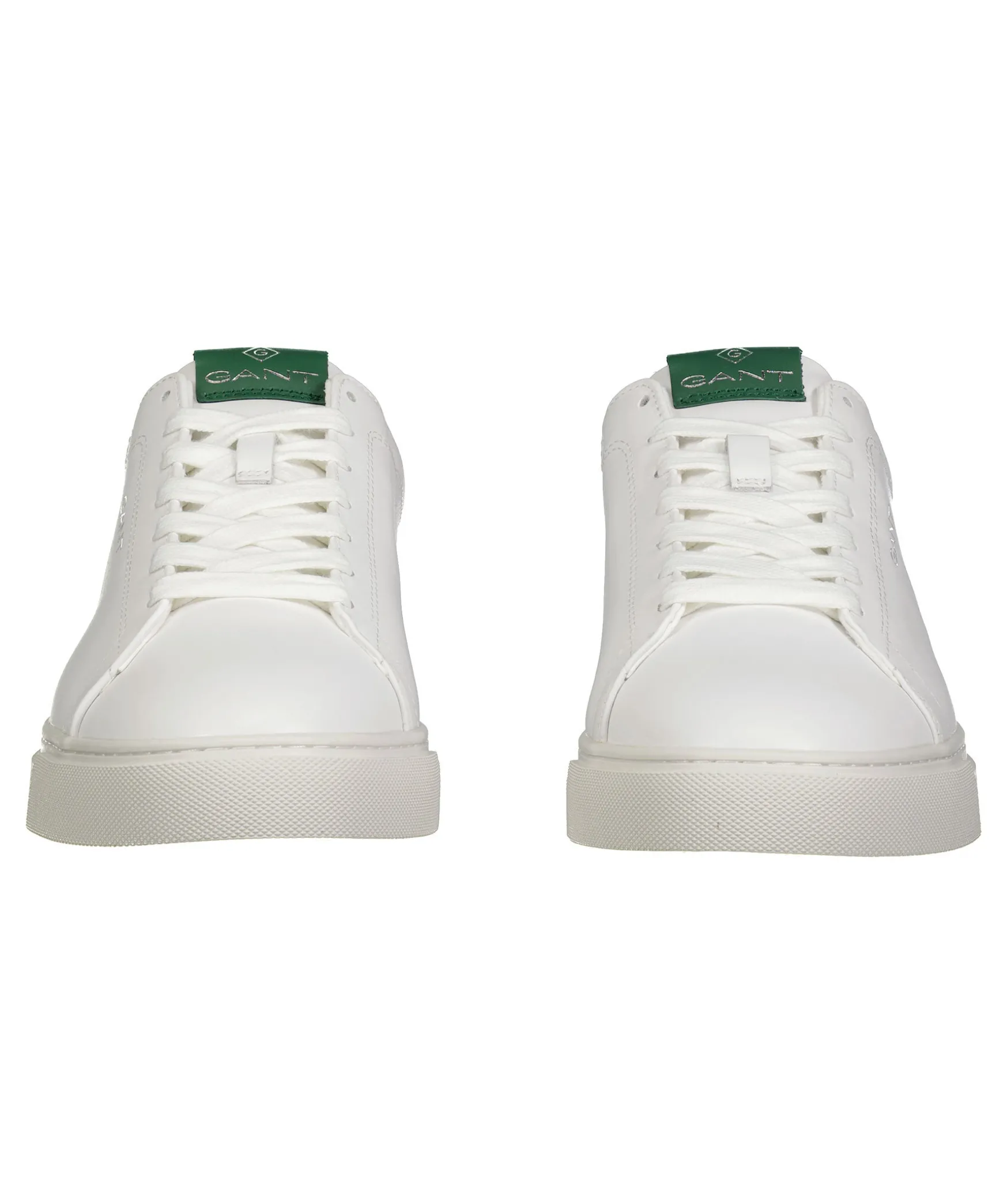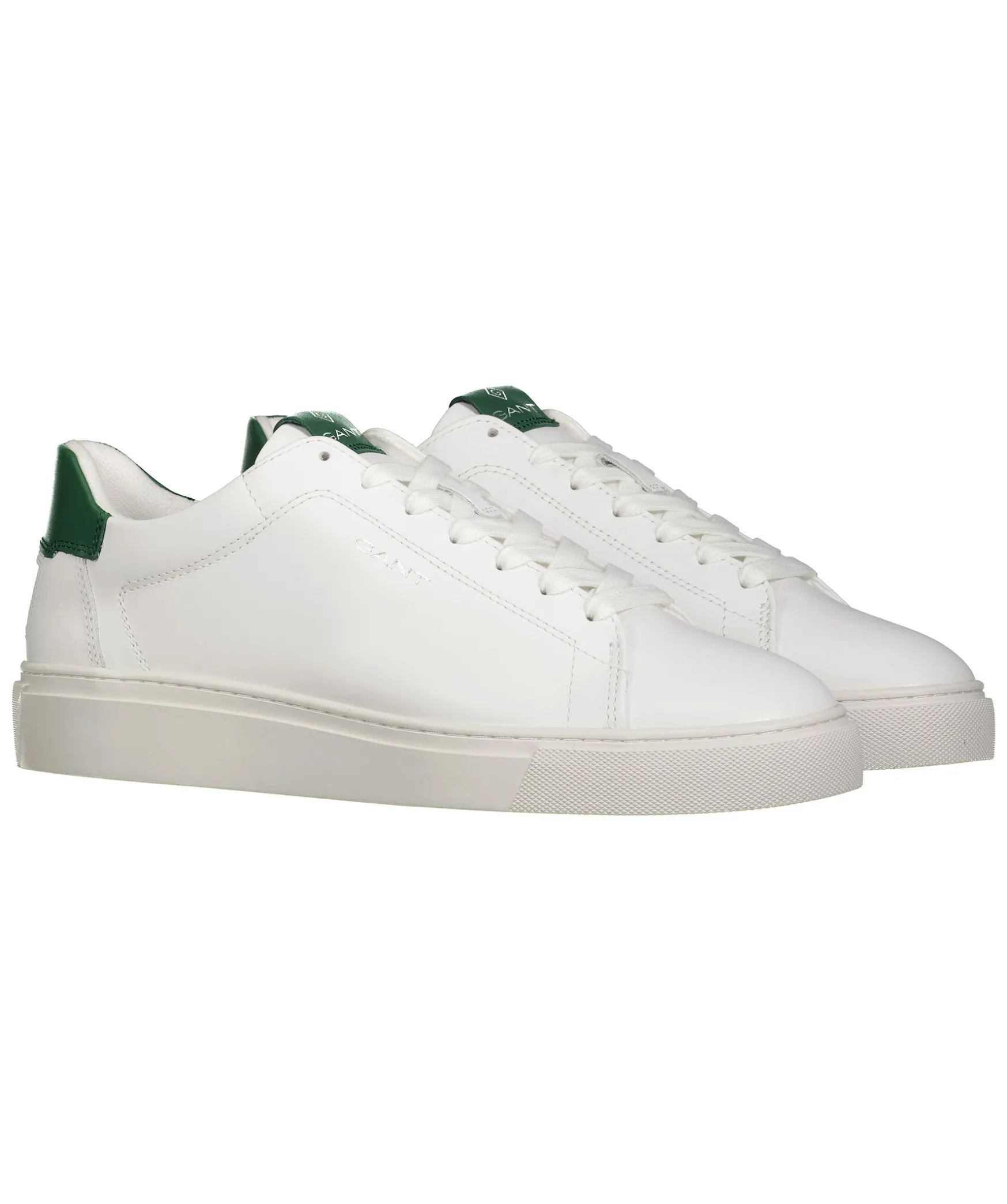 Vita Sneakers Fran Gant. Silverfargad Logotyp Pa Skons Yttersida, Bak Och Pa Plosen. Detalj I Morkgront Lader Pa Halen Samt Plosen. Foder I Textil Och Memory Foam. Vit Gummisula Och Vit Detalj Pa Halen I Lader. Vita Skosnoren.