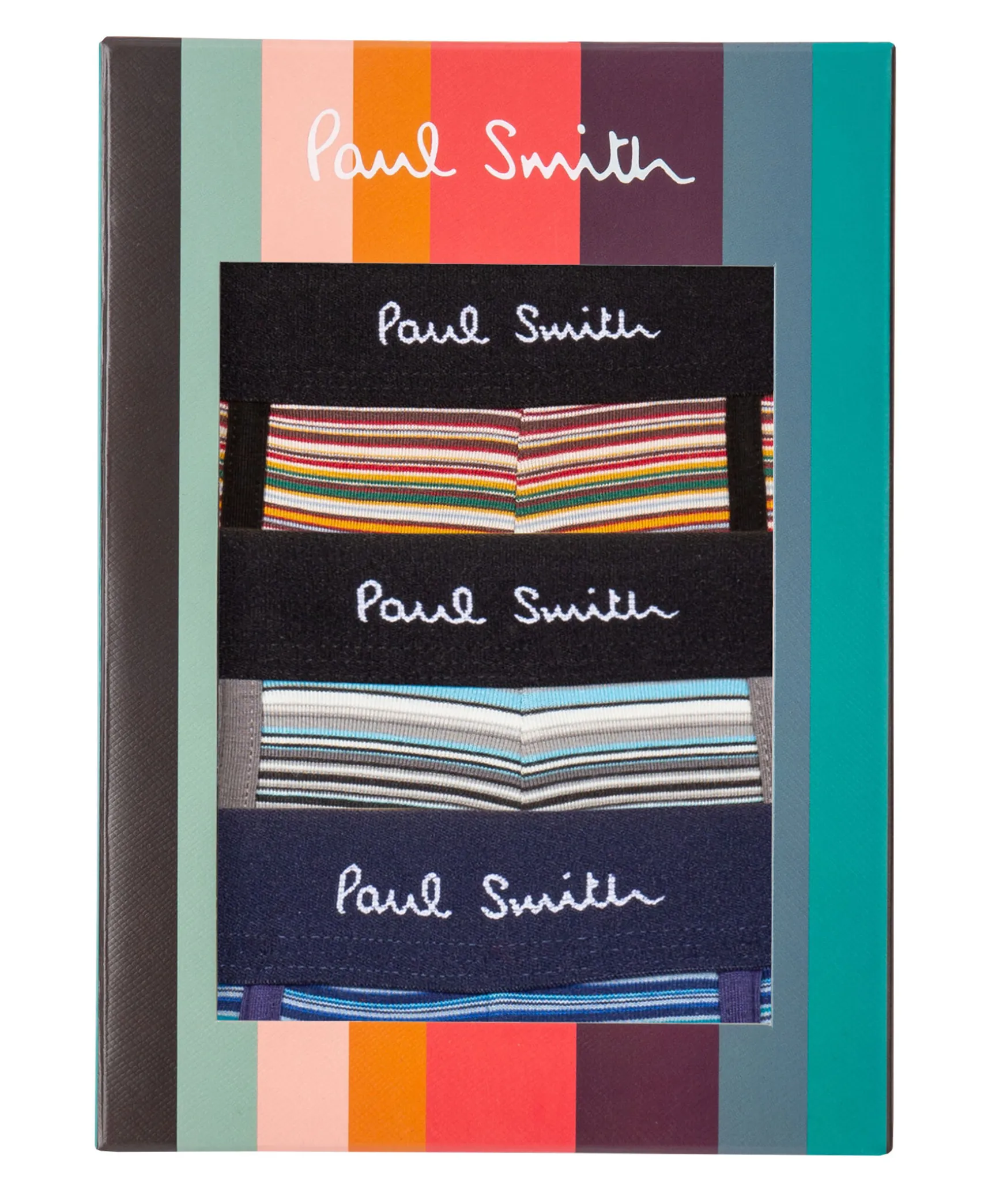 Tre Pack, Randiga Kalsonger I Boxermodell Fran Ps Paul Smith. Randiga I Paul Smiths Signatur Rander I Olika Farger. Svart Mudd I Midjan Med Vit Logotyp Pa.