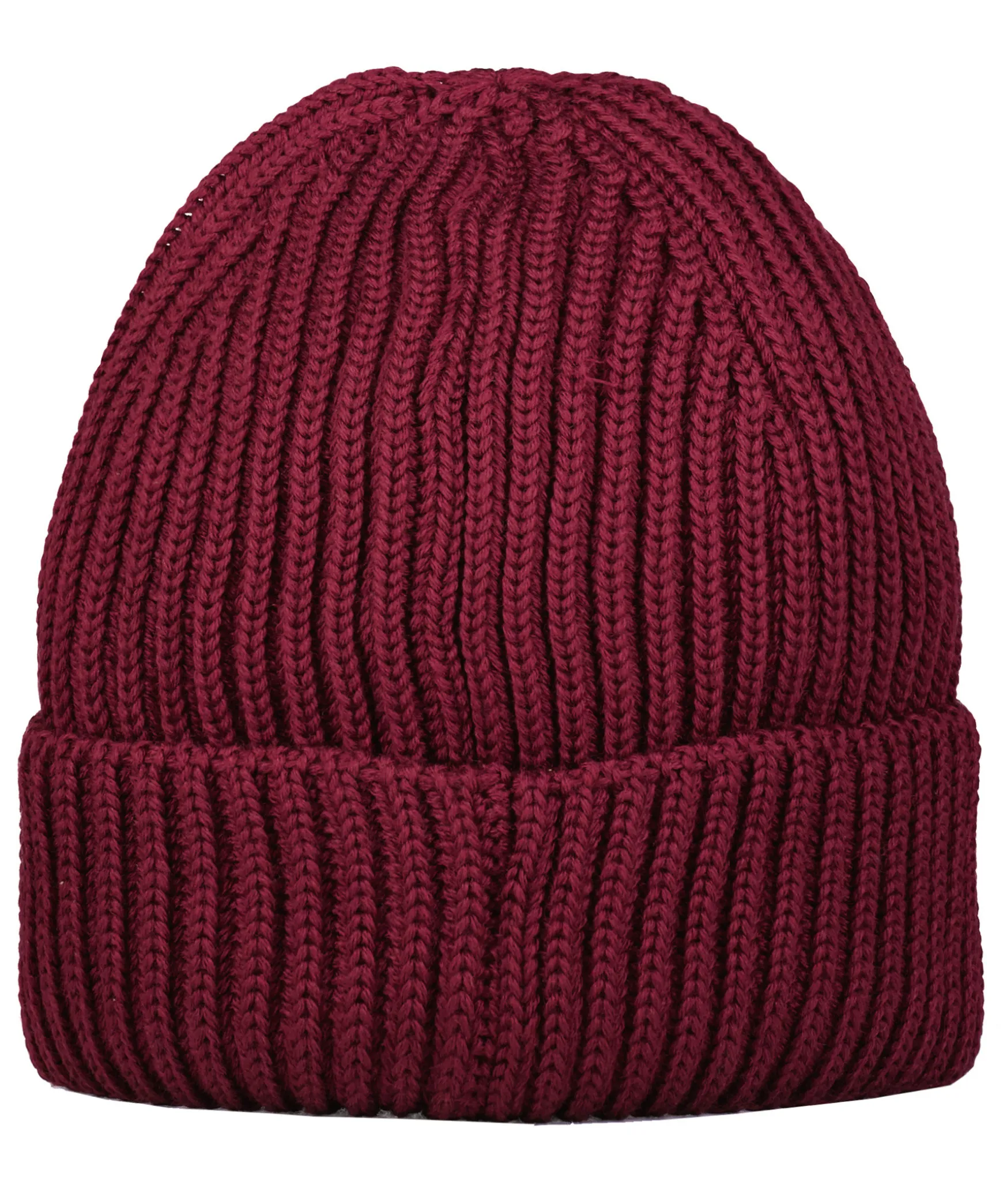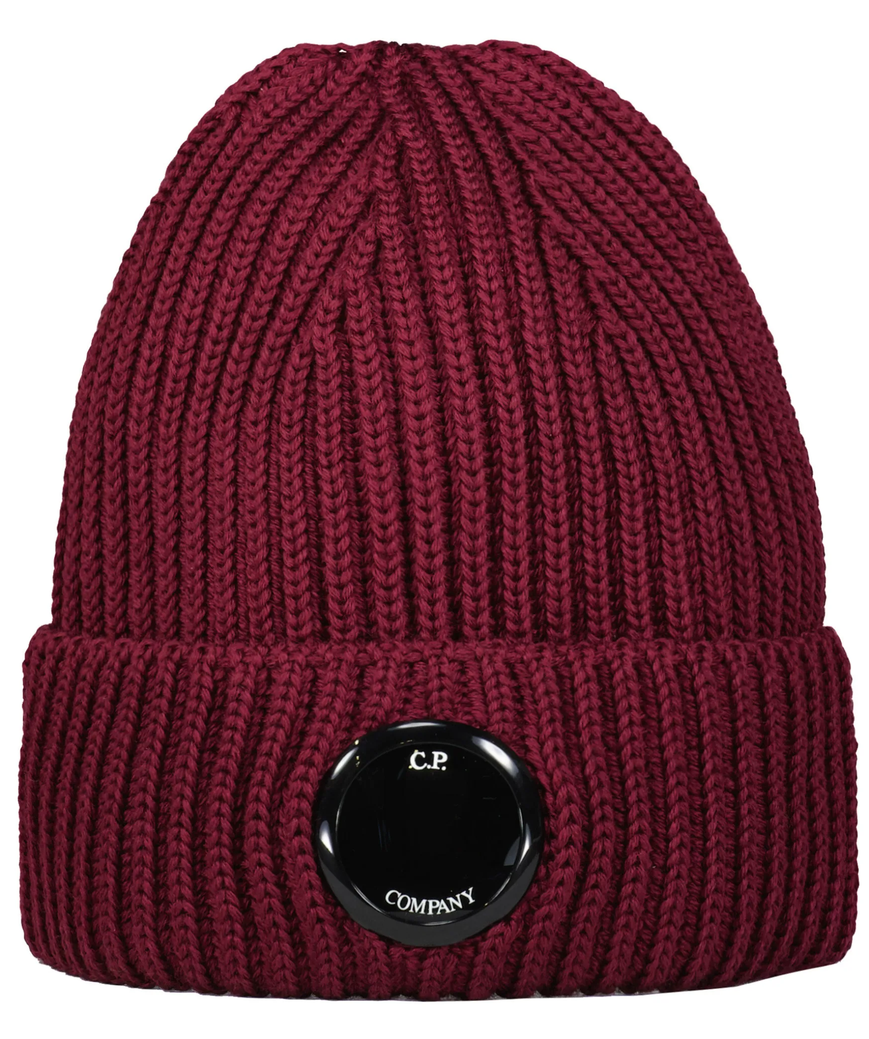 Bordeauxfargad Ribbstickad Mossa I Ull Fran C.P Company. Mossan Har En Uppvikt Kant Med Logga I Svart Plast Pa Framsidan.
