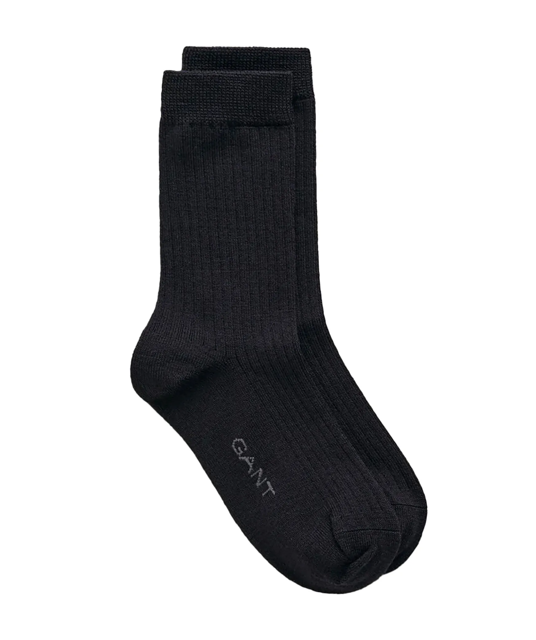 Svarta, Vadlanga Strumpor Fran Gant I Tjock Ullblandning Med Ribbstickad Struktur Samt Deras Klassiska Gant-Logotyp Under Foten.