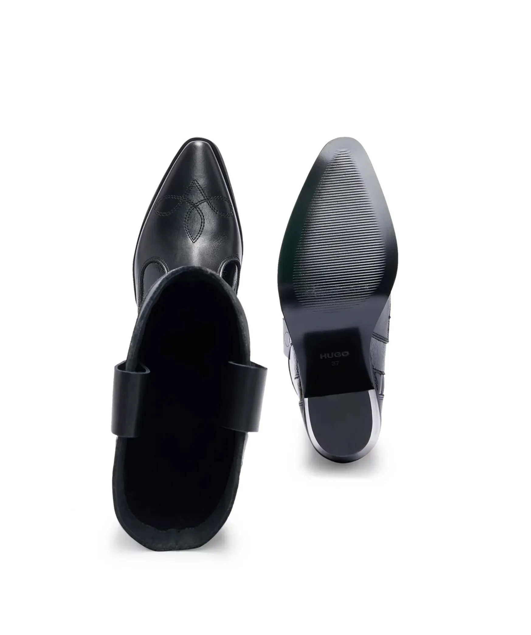 Svarta Cowboy Inspirerade Boots Med Klack Och Strass Fran Hugo. Tillverkade I Konstlader Med En Glansig Finish. Oglor Med Embossad Logotyp Pa Skaften. Stor Detalj Med Strass Framtill Och Baktill Pa Skon. Dekorativa Sommar Pa Skons Ta. Matt Konstlader Pa Skons Ta Och Hal. Klackens Hojd Ar 8Cm.