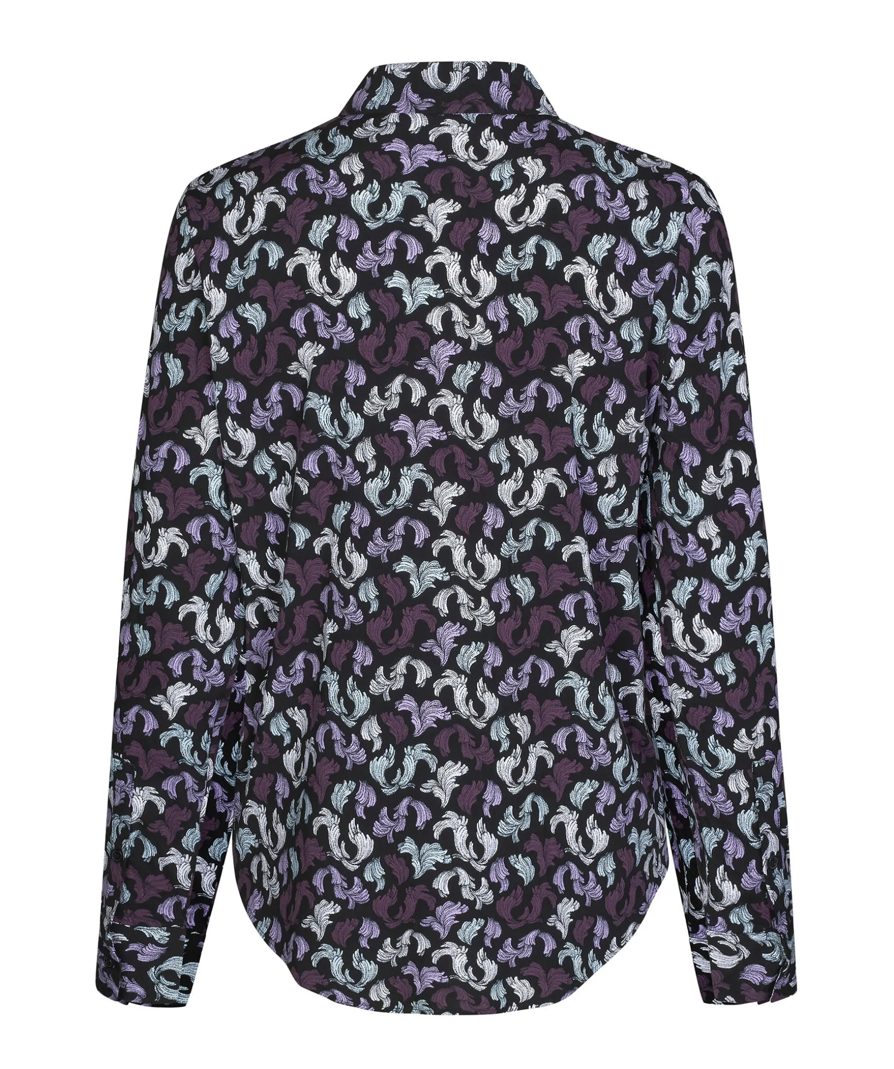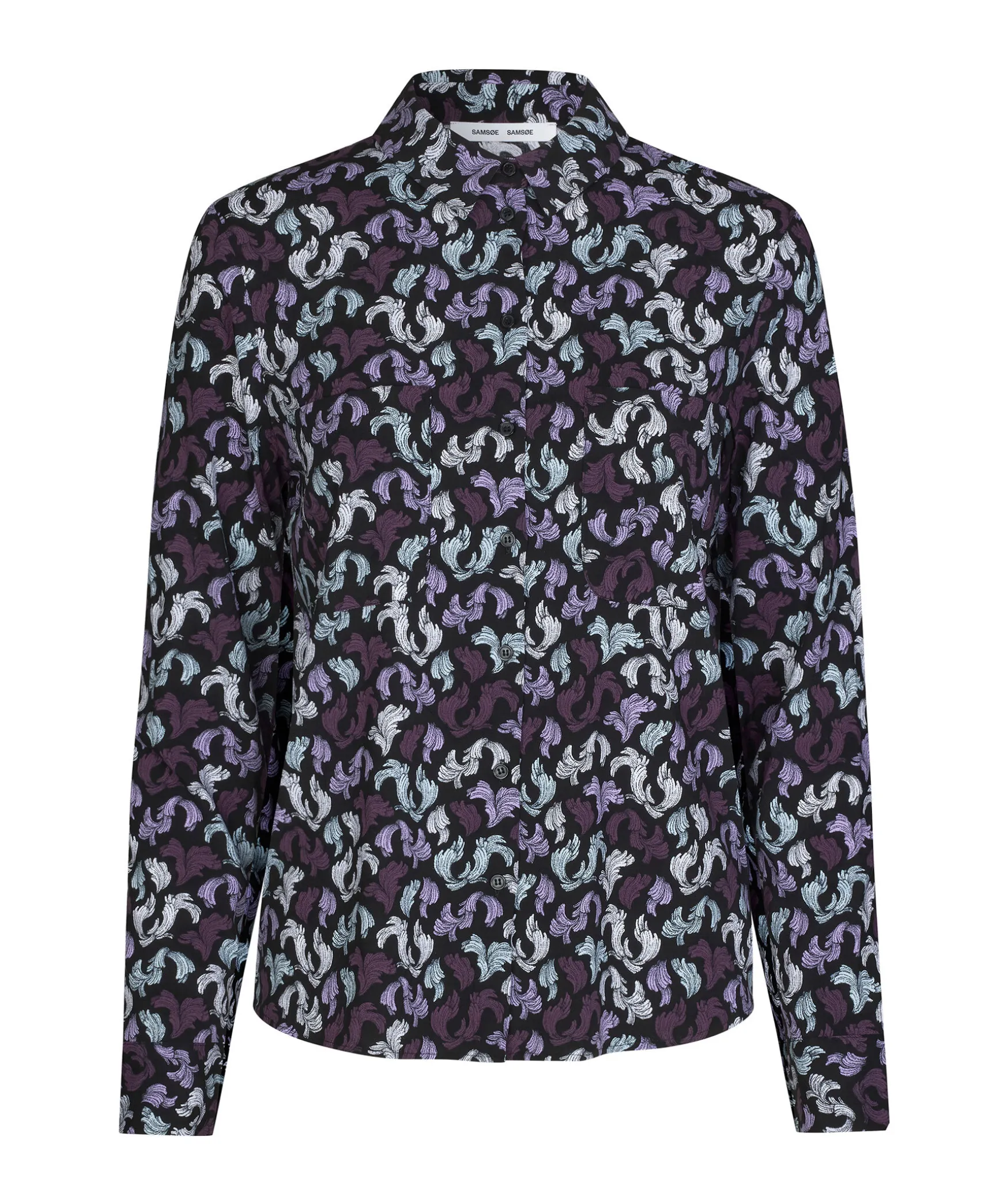 Svart Langarmad Skjorta Fran Samsoe Samsoe. Snygg Spetsig Krage, Brostfickor. Knappning Mitt Fram Och Armslut. Bojd Fall. Lenzing Viskostyg Vavt Med Extra Stretch. Tryckt Konstmonster I Lila.