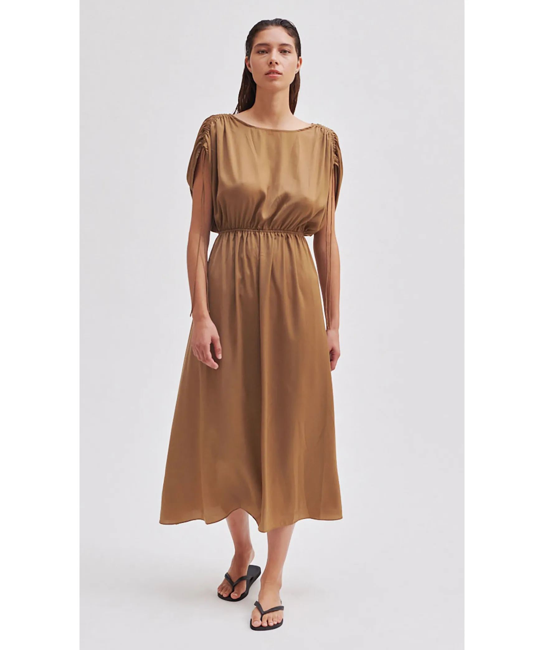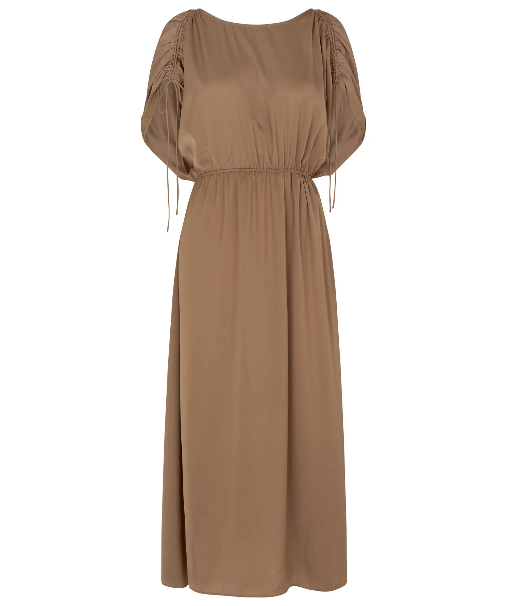 Kamelfargad Lang Satinklanning Fran Second Female. Tillverkad I Silkesmjuk Och Flytande Atervunnen Polyester. Med Rund Hals Fram Och Oppen Rygg Med Utskuren Detalj Och Dragsko Med Knytband. Resar I Midjan Och Dragsko Med Knytband Vid Axlarna. Avslappnad Passform.