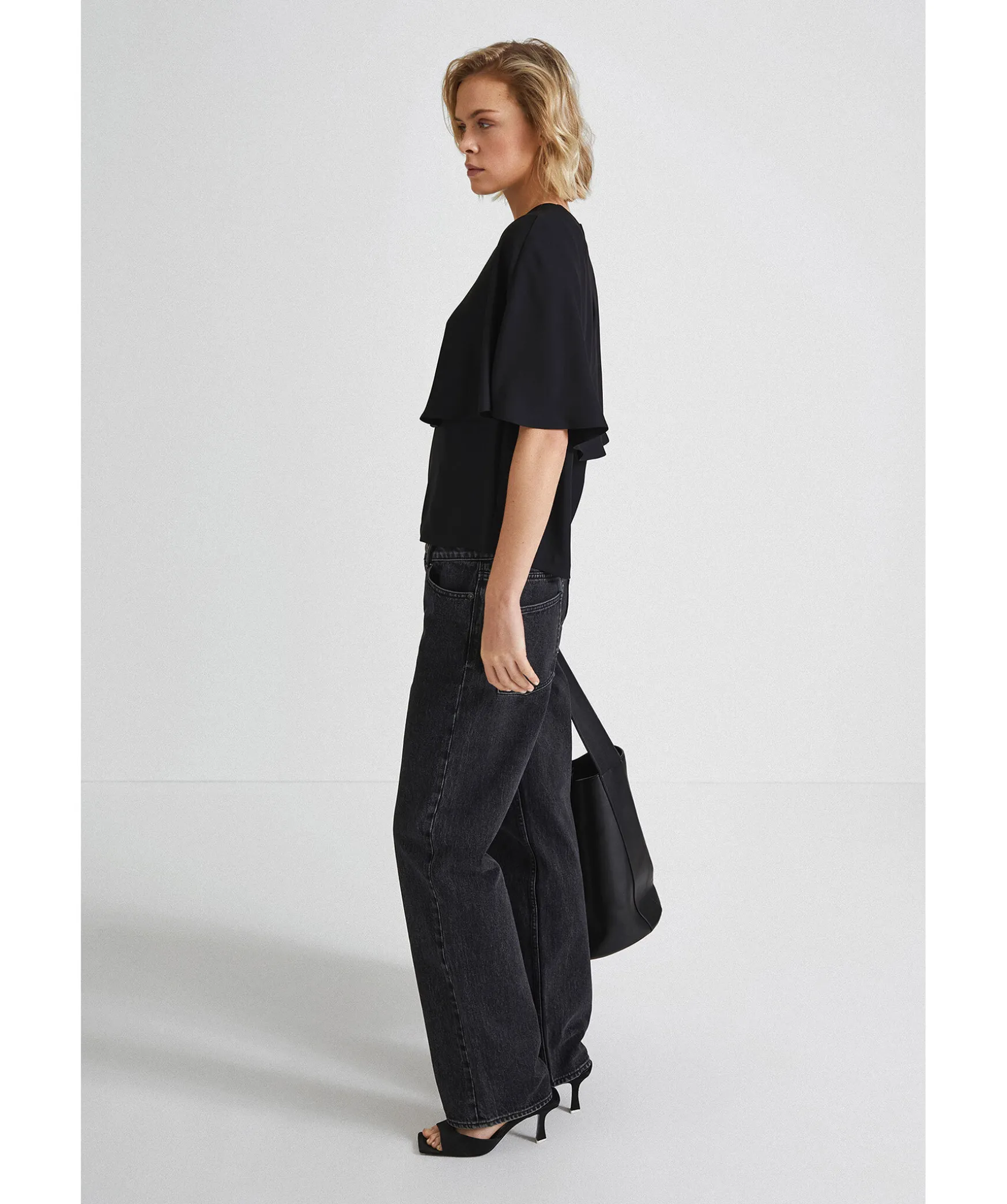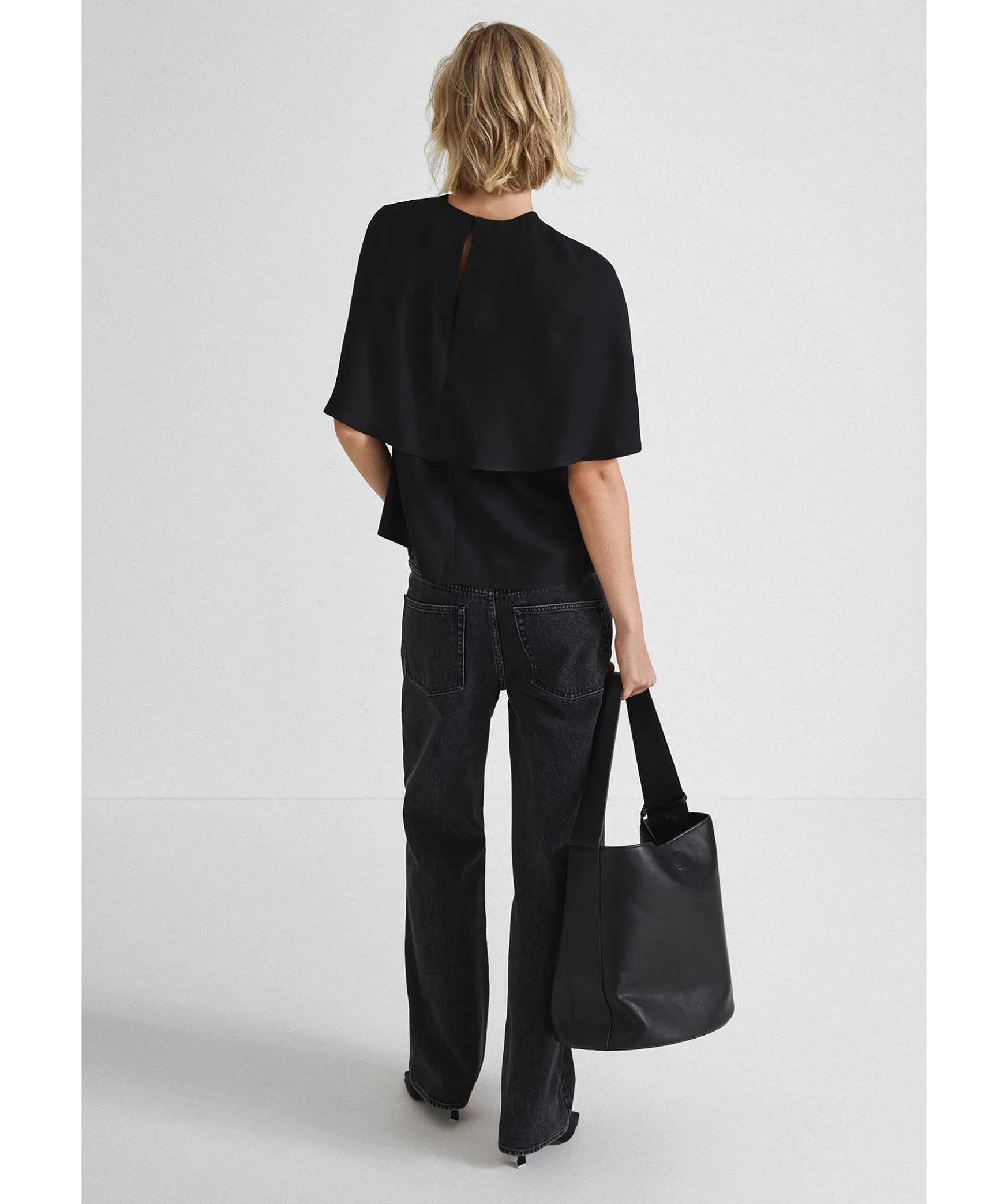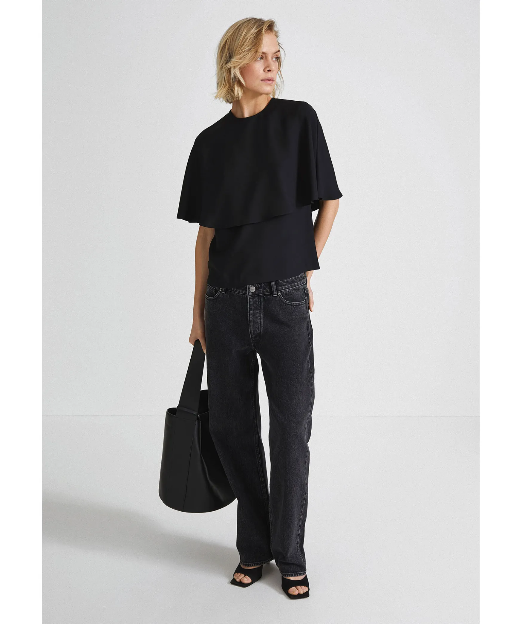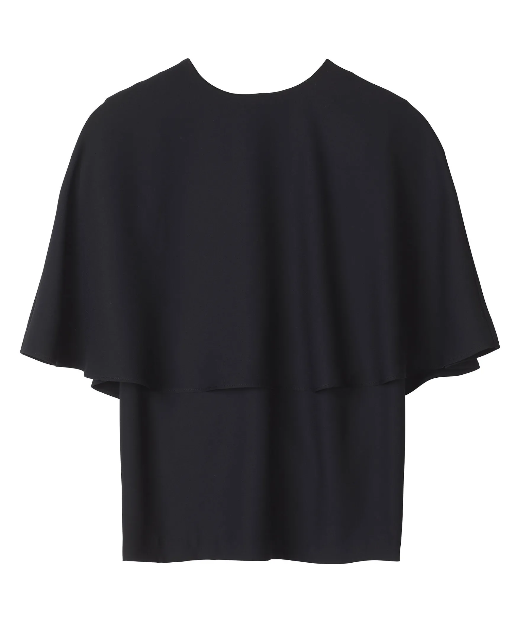 Svart Blus Fran Stylein. Blusen Ar Armlos Och Har Har Utsvangt Tygstycke Som Ligger Draperat Som En Cape. Knappstangning I Nacken. Rak Passform.