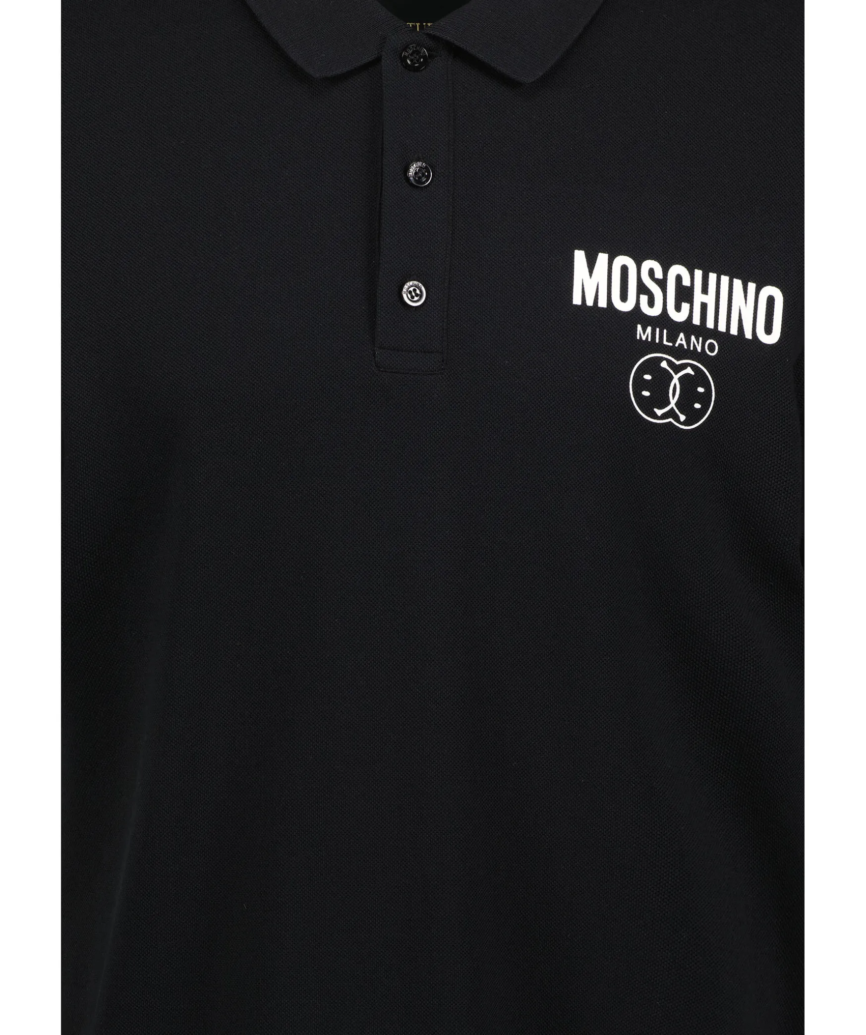 Svart Pike Fran Moschino. Vit Tryckt Logotyp Pa Vanster Brost. Ribbstickad Krage Och Mudd Vid Armslut. Korta Slitsar I Sidorna. Tillverkad I 100% Bomull.