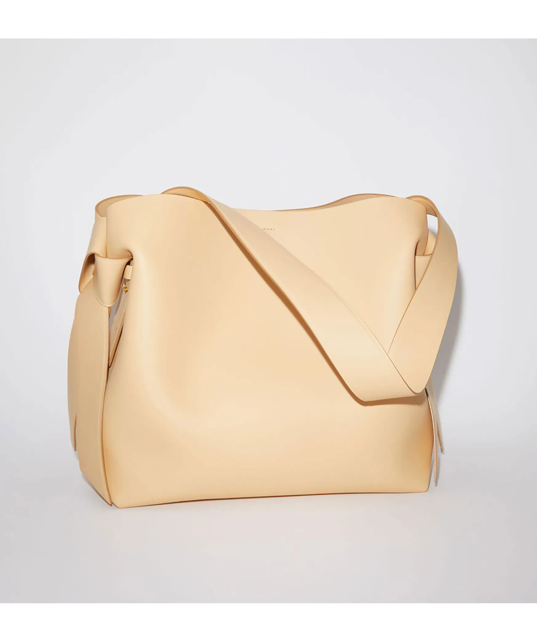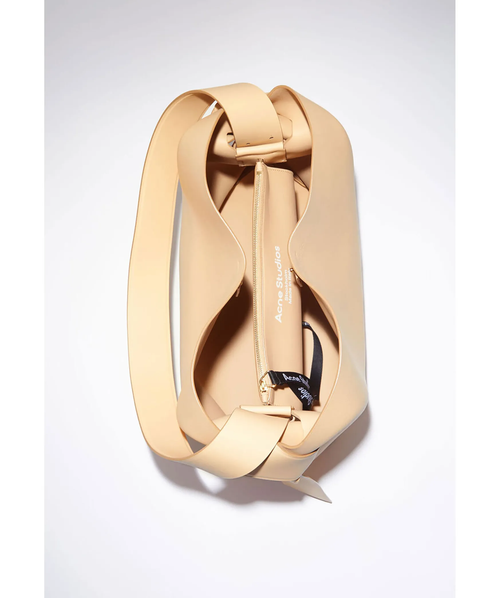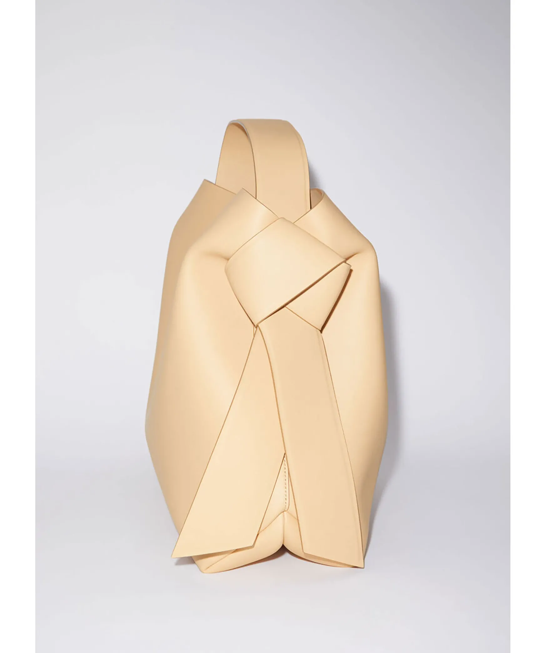 Beige Vaska I Medium Storlek Fran Acne Studios. Har Vridna Knutar Inspirerade Av Traditionella Japanska Obi-Skarp Pa Sidorna. Den Har En Praglad Logotyp Fram Och Tryckknappsstangning, Som Oppnas For Att Avsloja Ett Blixtlasfack For Forvaring Av Sma Saker. Vaskans Matt: Hojd: 35 Cm, Langd: 35 Cm, Bredd: 16 Cm.