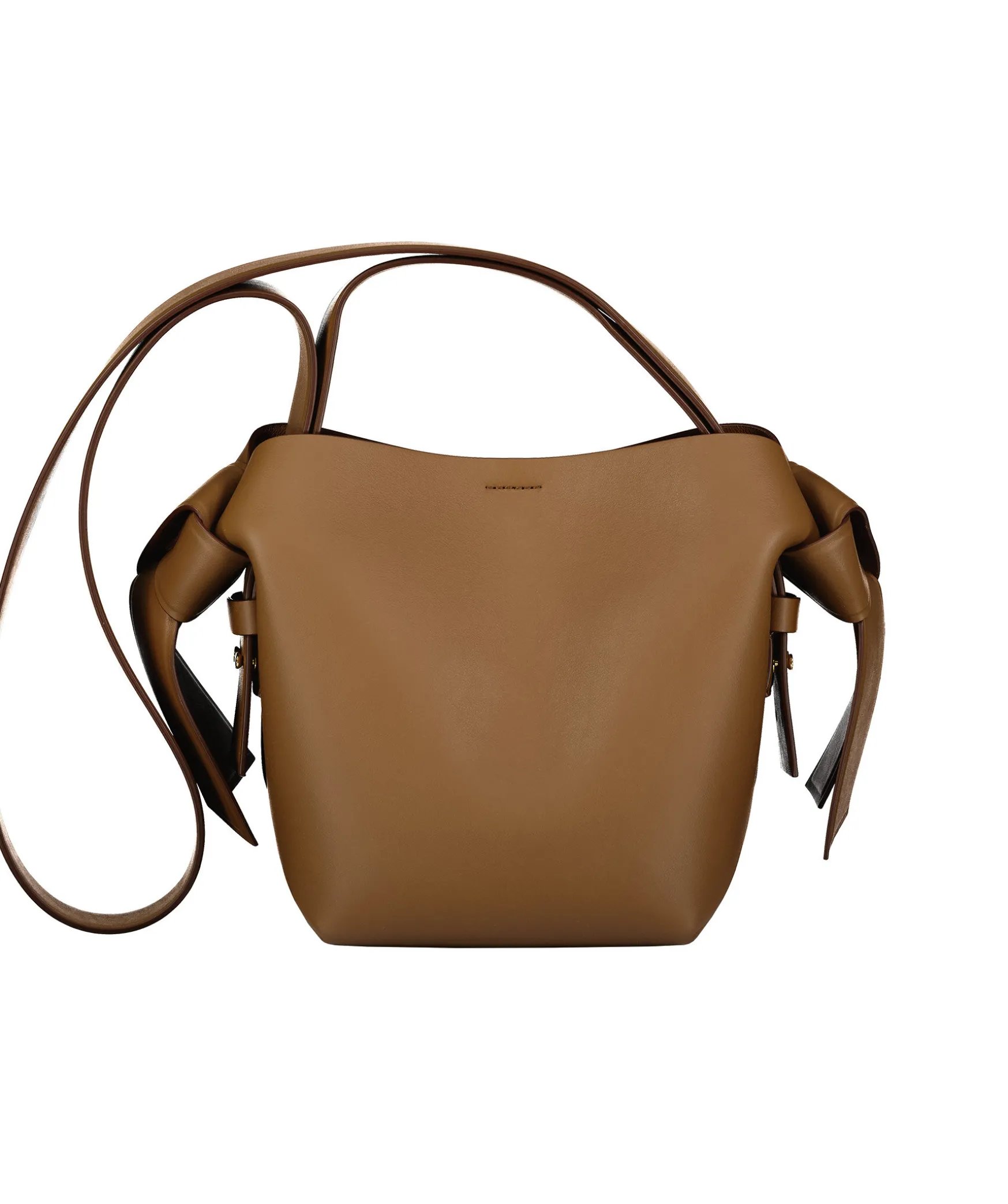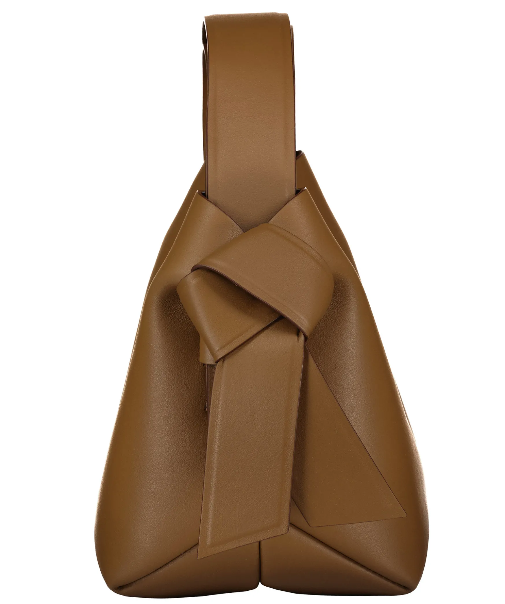 Brun Vaska Med Svart Insida I Mini Storlek Fran Acne Studios. Har Vridna Knutar Inspirerade Av Traditionella Japanska Obi-Skarp Pa Sidorna. Den Har En Praglad Logotyp Fram Och Tryckknappsstangning, Som Oppnas For Att Avsloja Ett Blixtlasfack For Forvaring Av Sma Saker. Matt: 21,5 Cm X 20,5 Cm X 15,5 Cm.