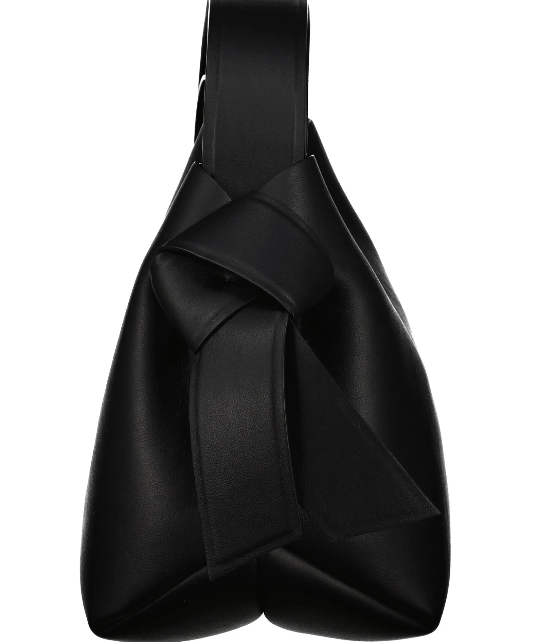 Svart Vaska I Mini Storlek Fran Acne Studios. Har Vridna Knutar Inspirerade Av Traditionella Japanska Obi-Skarp Pa Sidorna. Den Har En Praglad Logotyp Fram Och Tryckknappsstangning, Som Oppnas For Att Avsloja Ett Blixtlasfack For Forvaring Av Sma Saker. Matt: Hojd: 21 Cm, Langd: 15 Cm, Bredd: 15 Cm.