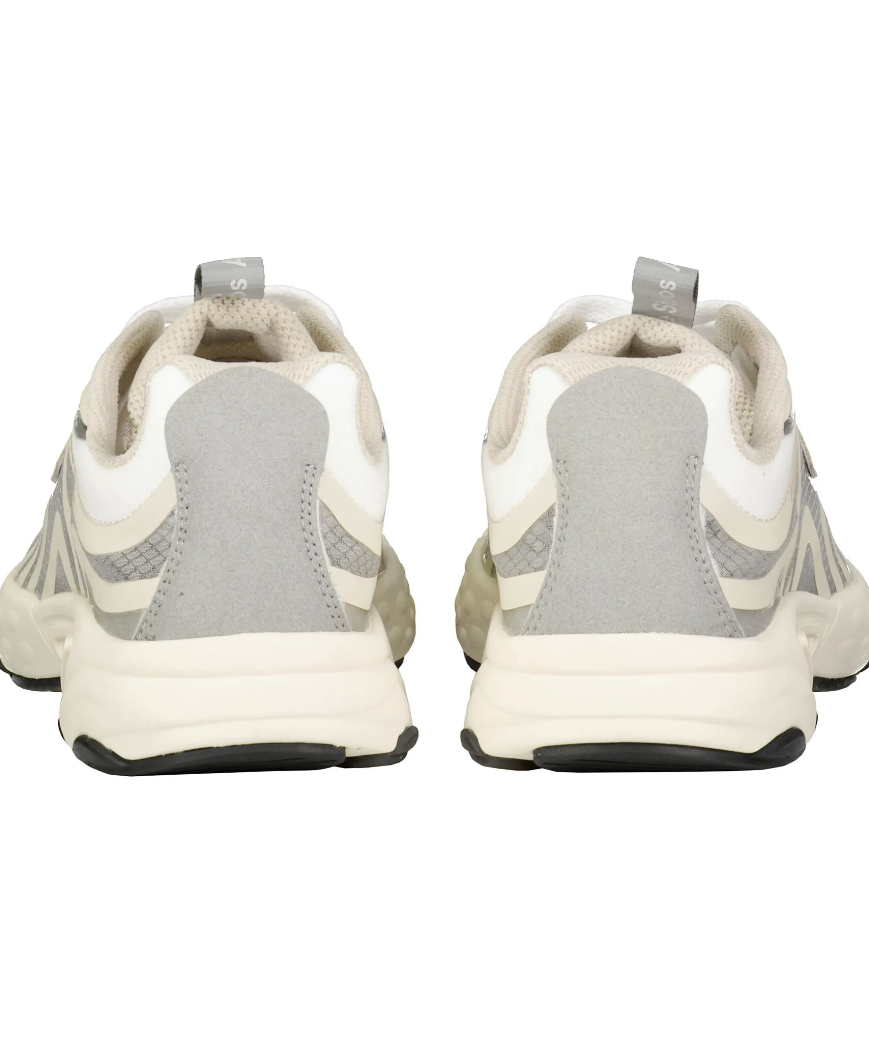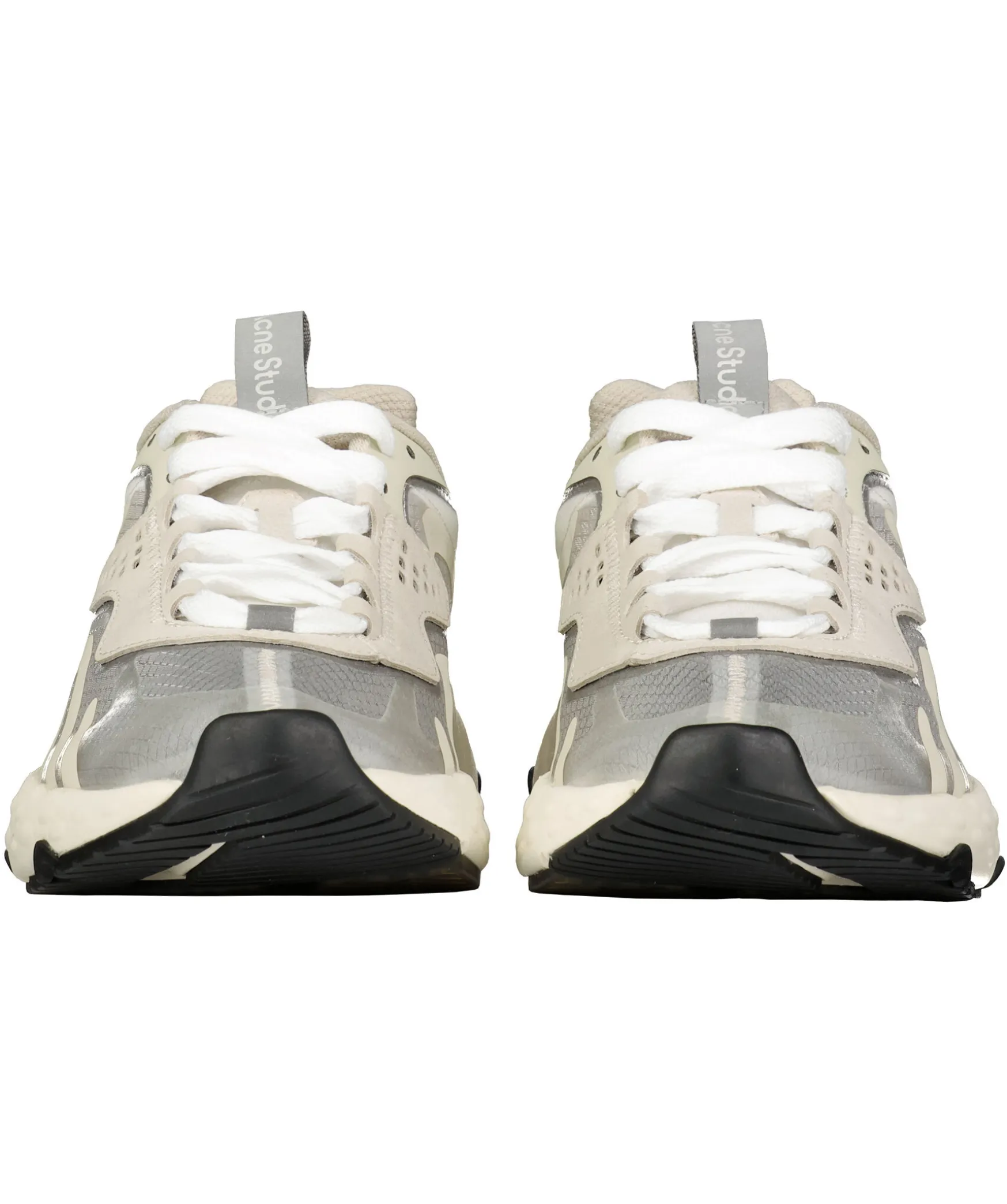 Sneakers Fran Acne Studios I Vitt Och Beige. Har Ett Transparant Meshfoder Och Latta Vita Gummisulor Med Svarta Detaljer Under. Ogla Med Logotyp Och Reflex Pa Plosen.
