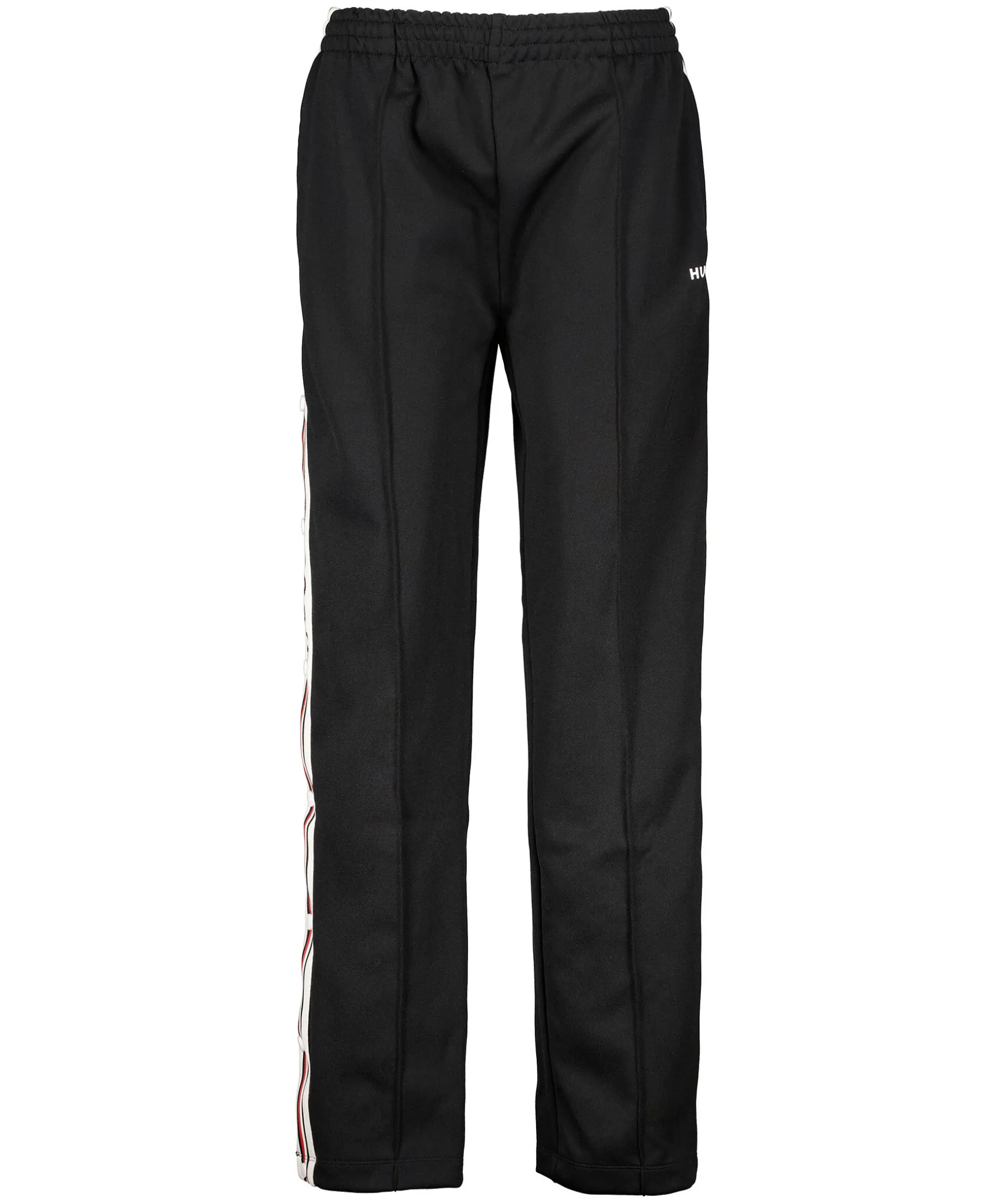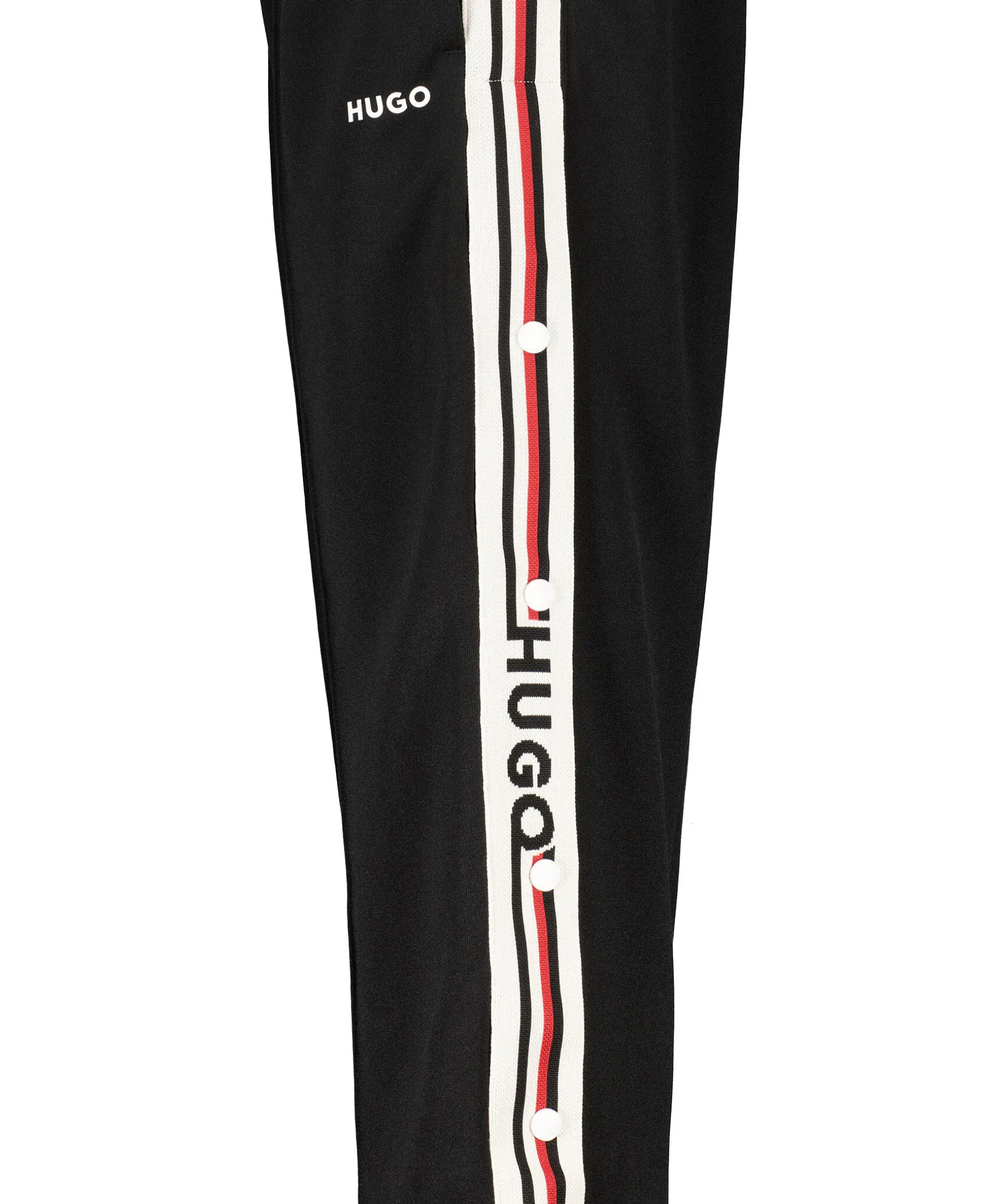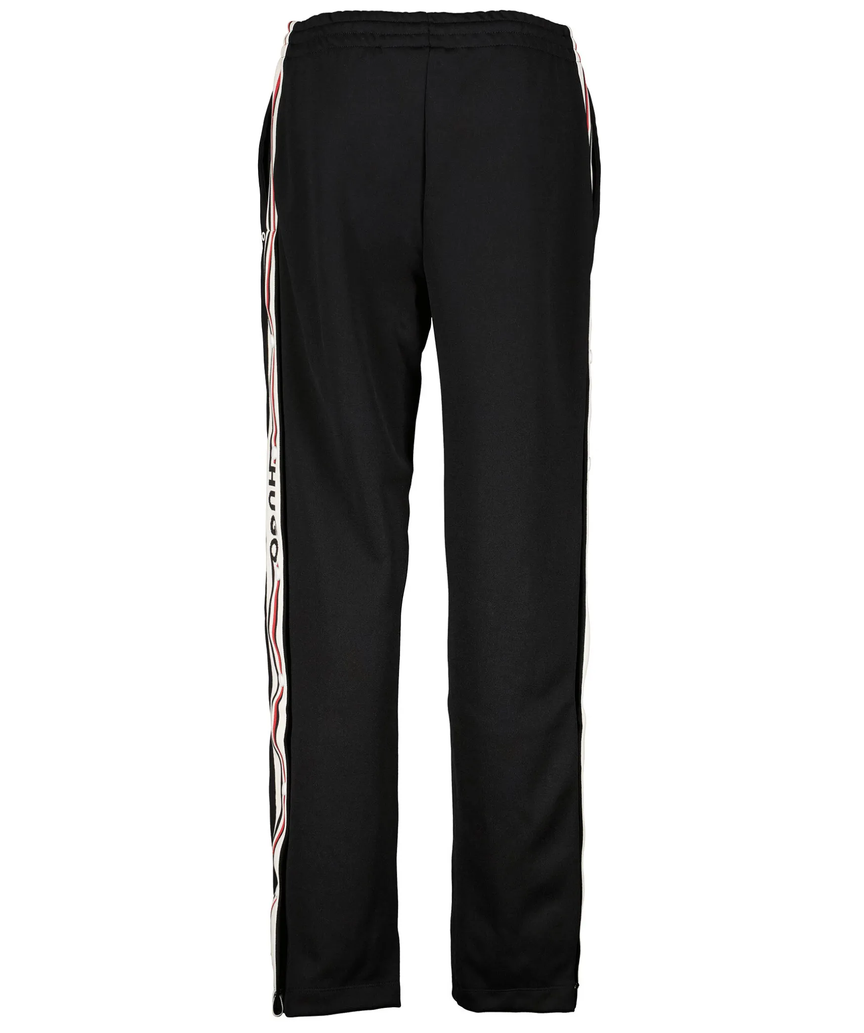 Svarta Tracksuitbyxor Fran Hugo Womenswear. Logotyprevarer Langs Sidorna I Beige, Rott Och Svart Med Knappar Som Gor Att Byxbenet Gar Att Oppna Upp. Tva Sidfickor Och En Vit Gummerad Logotyp Under Vanster Ficka. Elastisk Midja Med Snorning. Pressveck. Normal Passform. Tillverkade I En Polyester- Och Bomullsblandning.