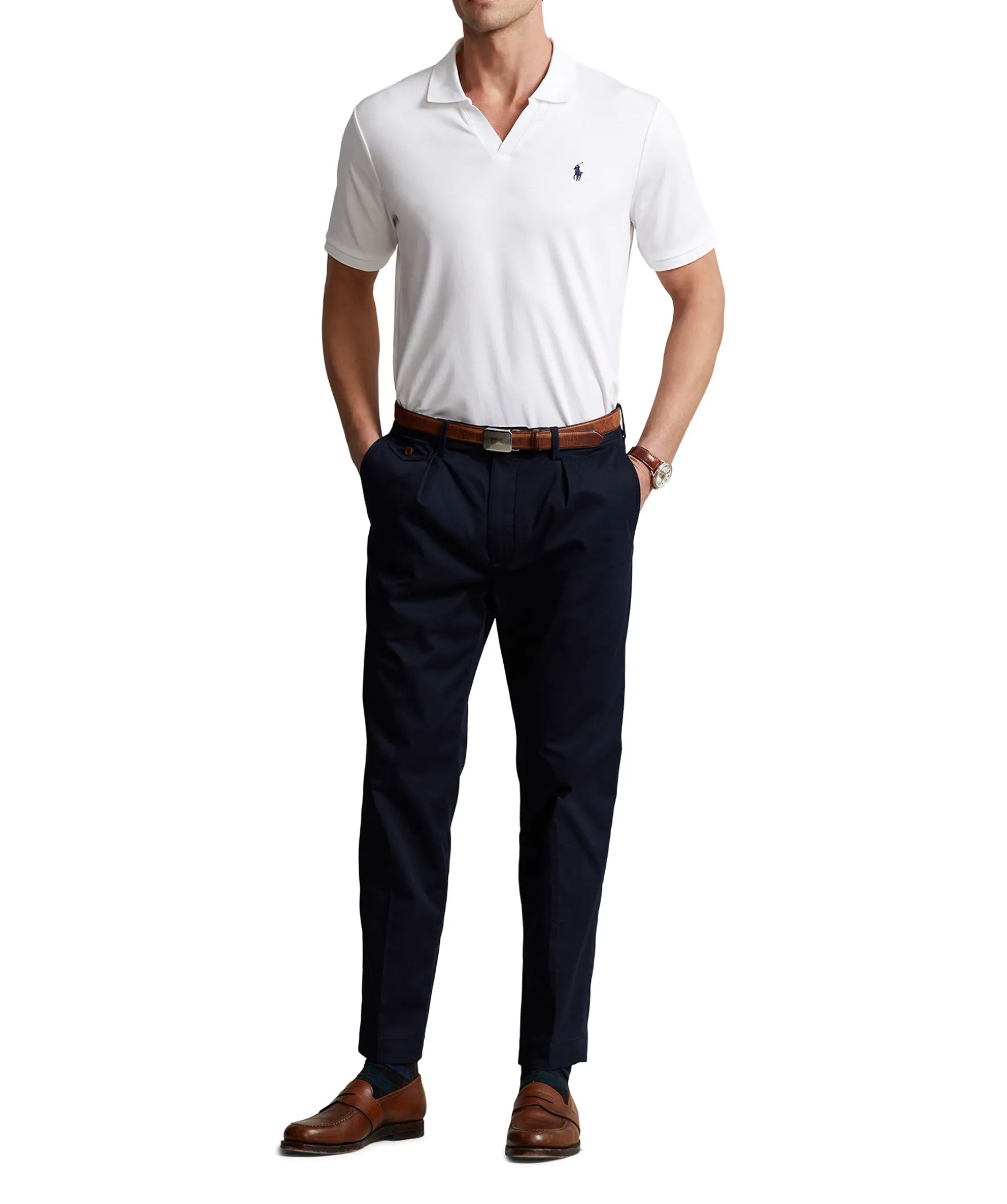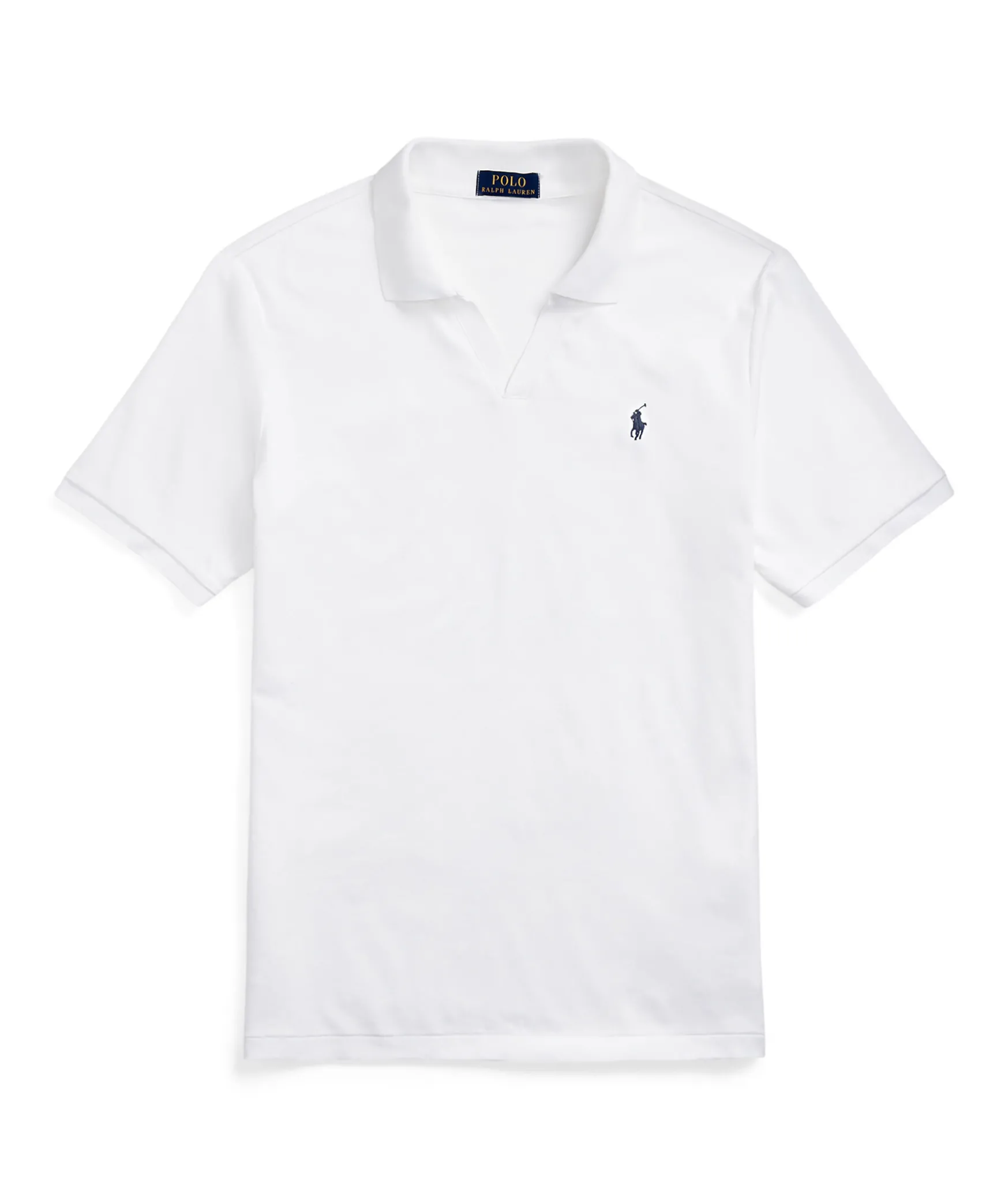 Vit Kortarmadpike Fran Polo Ralph Lauren Med En Oppen V-Ringad Krage. Trojan Ar Gjord I En Lyxigt Och Mjuk Bomullsmaterial. Broderad Polohast Pa Brostet. Custom Slim Fit Passform. Modellen Ar 185Cm Lang Och Har Pa Sig Storlek M.