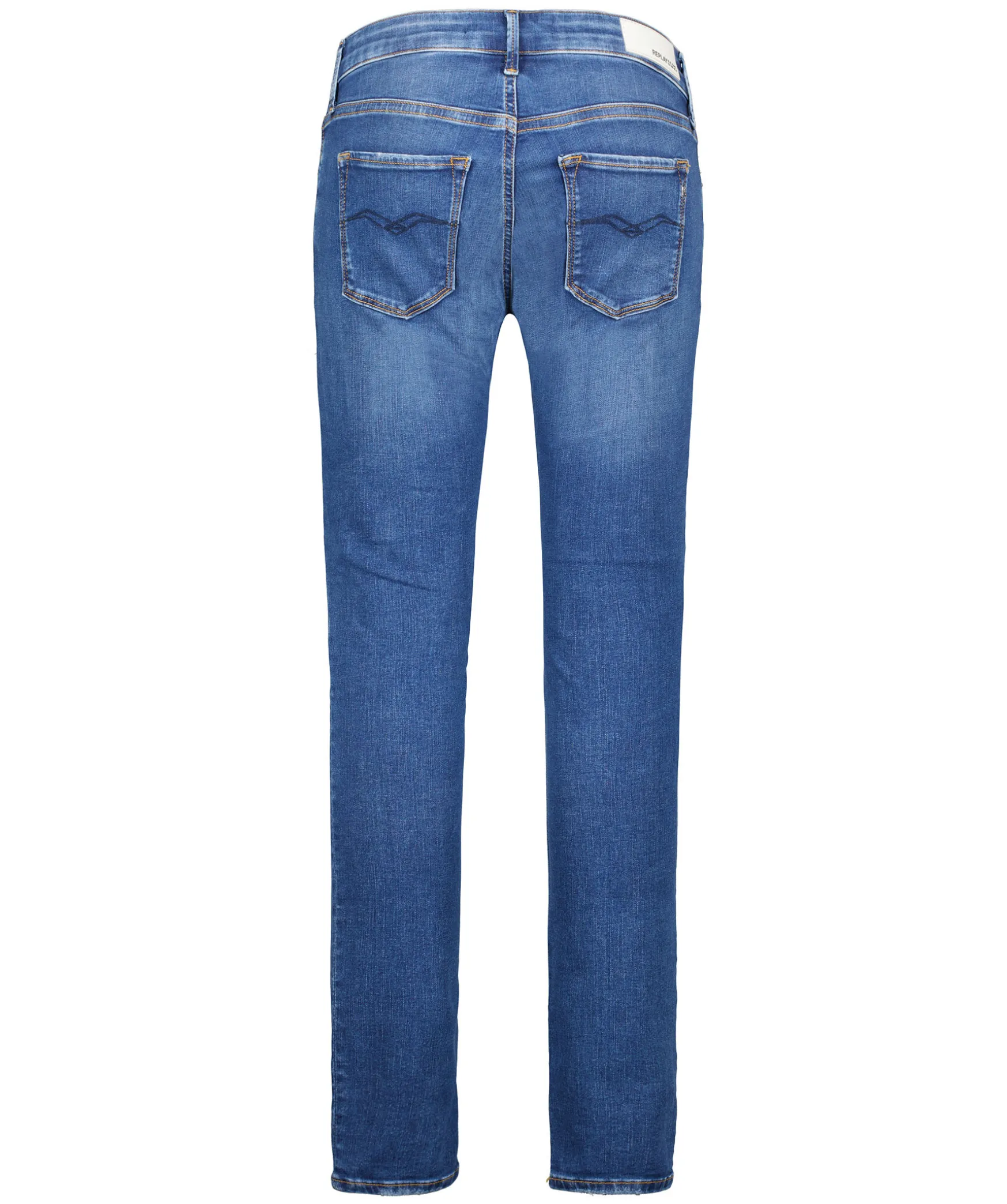 Morkblaa Skinny Fit Jeans Med Vanlig Midja Och Smala Ben Fran Replay. Plagget Ar Tillverkat Av 10,5 Oz Hyperflex Re-Used Rodgjuten Indigo-Stretchbomull Med En Stentvattad Mork Tvatton. Byxorna Ar I Femficksmodell. Dragkedja Och Knappgylf.