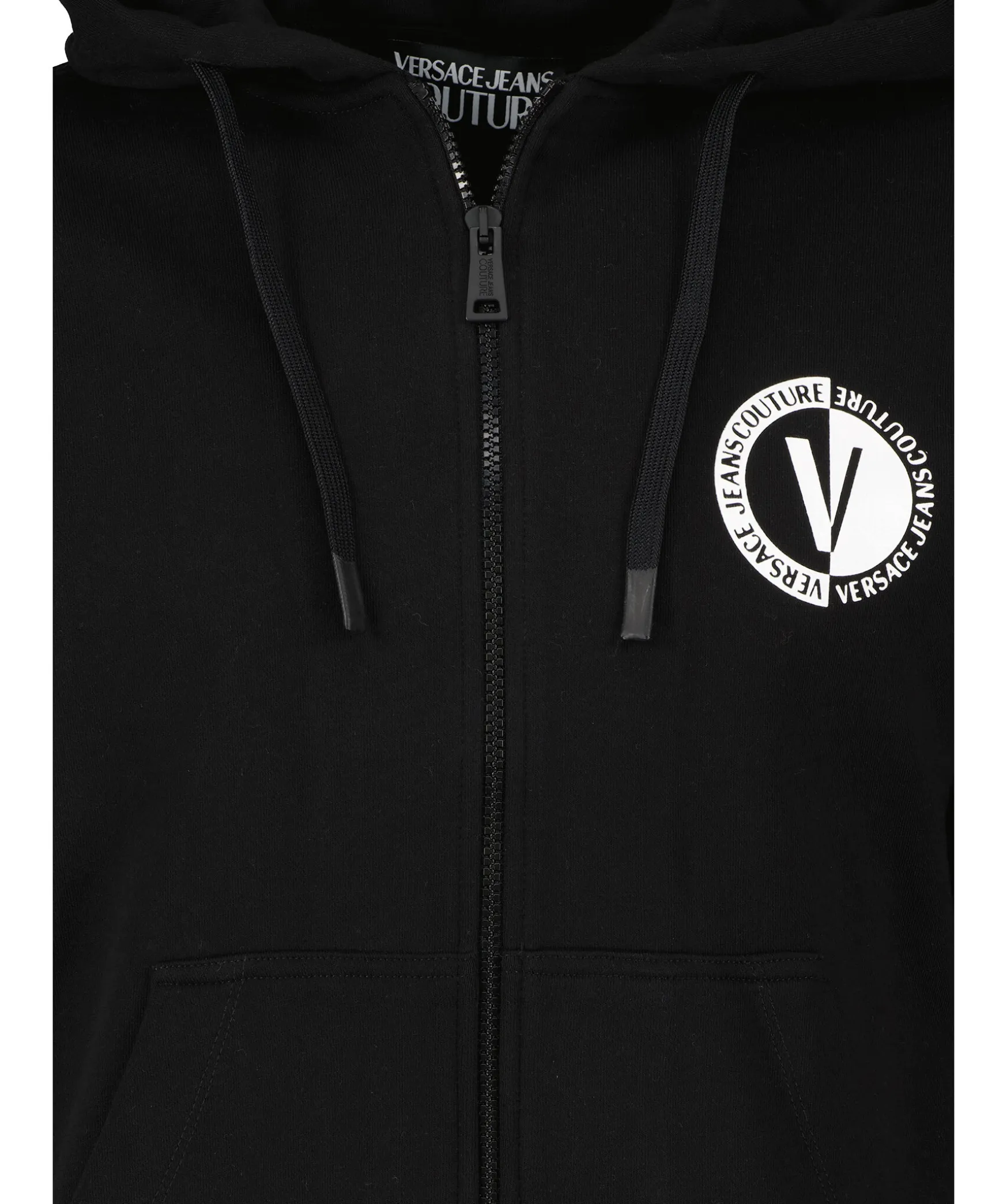 Svart Hoodie Fran Versace Jeans Couture Tillverkad I Kraftigt Bomullstyg. Stangs Med Dragkedja Fram Och Har En Luva Med Snorning. Stort Gummerat Tryck Med En Rund Logotyp Pa Ryggen Och Ett Mindre Likadant Tryck Pa Vanster Sida Av Brostet. Muddar Vid Arm Och Plaggslut Och Fickor I Sidorna.