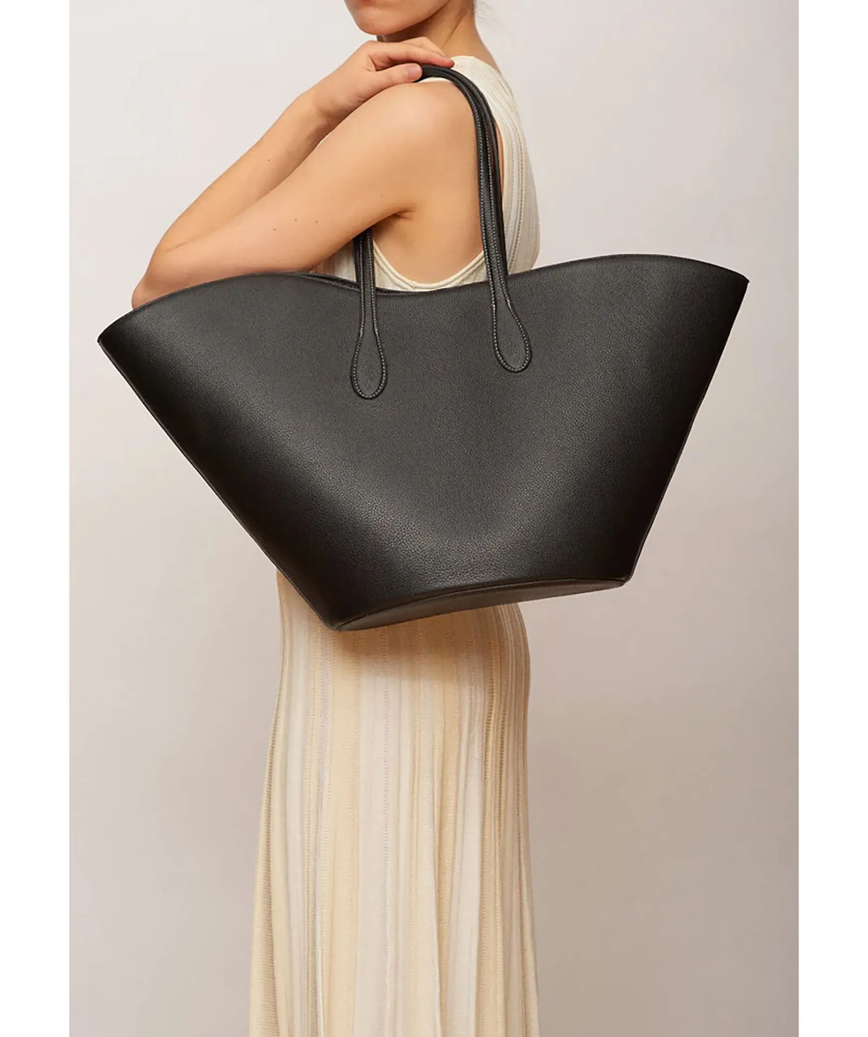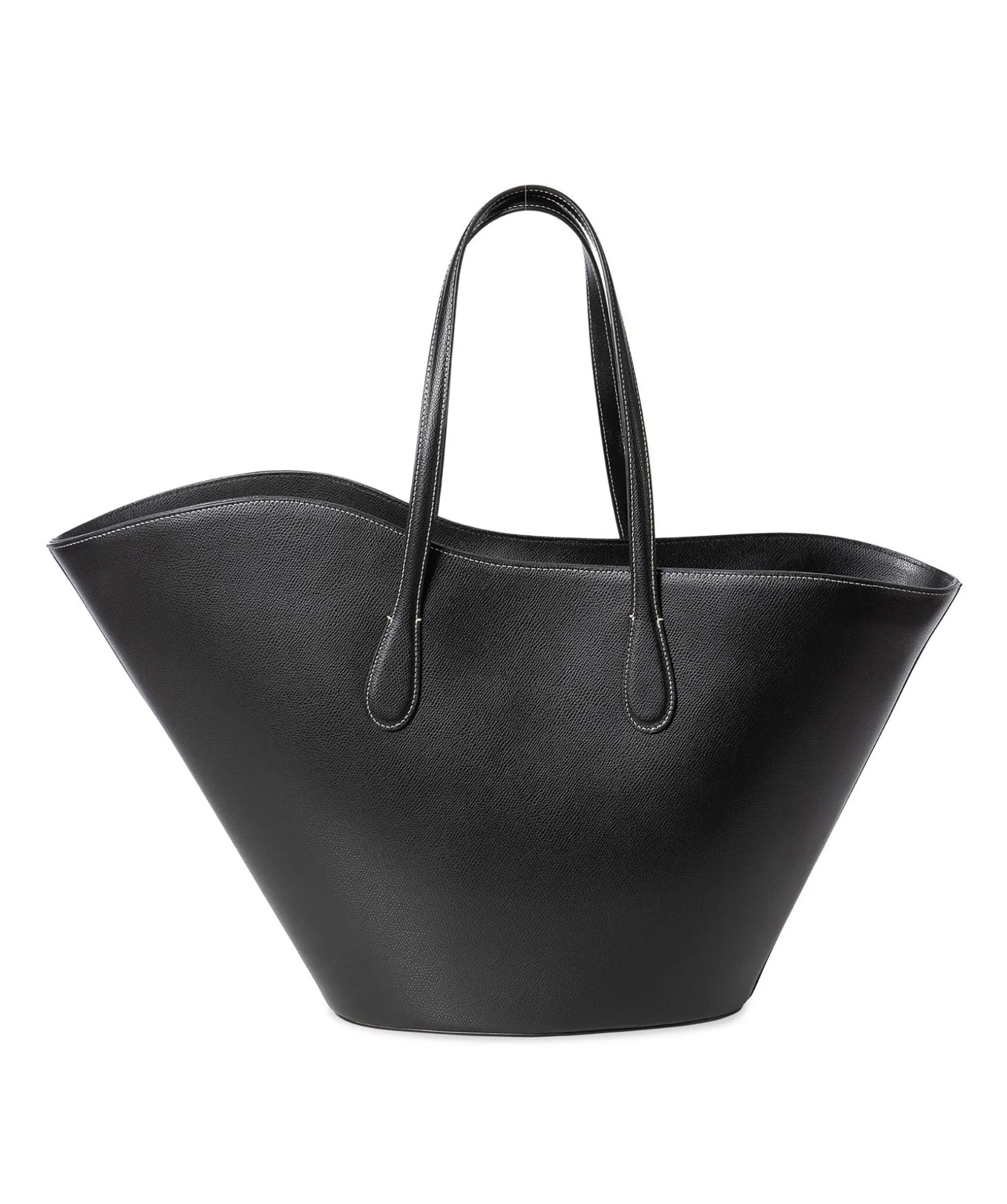 Svart Stor Totebag Fran Little Liffner. Vaskan Har Platta Handtag Och Ar Tankt Att Baras Pa Axeln. Ar En Storre Modell Av Deras Klassiska Tulip Tote. Ett Stort Innerfack, Mindre Fack Som Stangs Med Dragkedja Och Tva Sma Oppna Fickor. Gjord I Lader Och Har Vita Synliga Stygn. H: 35 X B: 55 (Overst) X D: 16 Cm