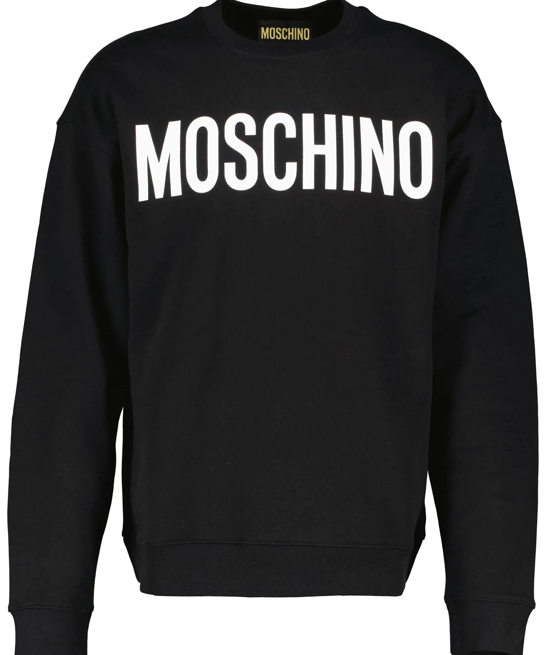 Svart Sweatshirt Fran Moschino. Stor Logotyp I Vitt Over Brostet. Rundad Halsringning, Ribbstickade Muddar Pa Halsringningen, I Armslut Och Plaggslut. Tillverkad I 100% Bomull.