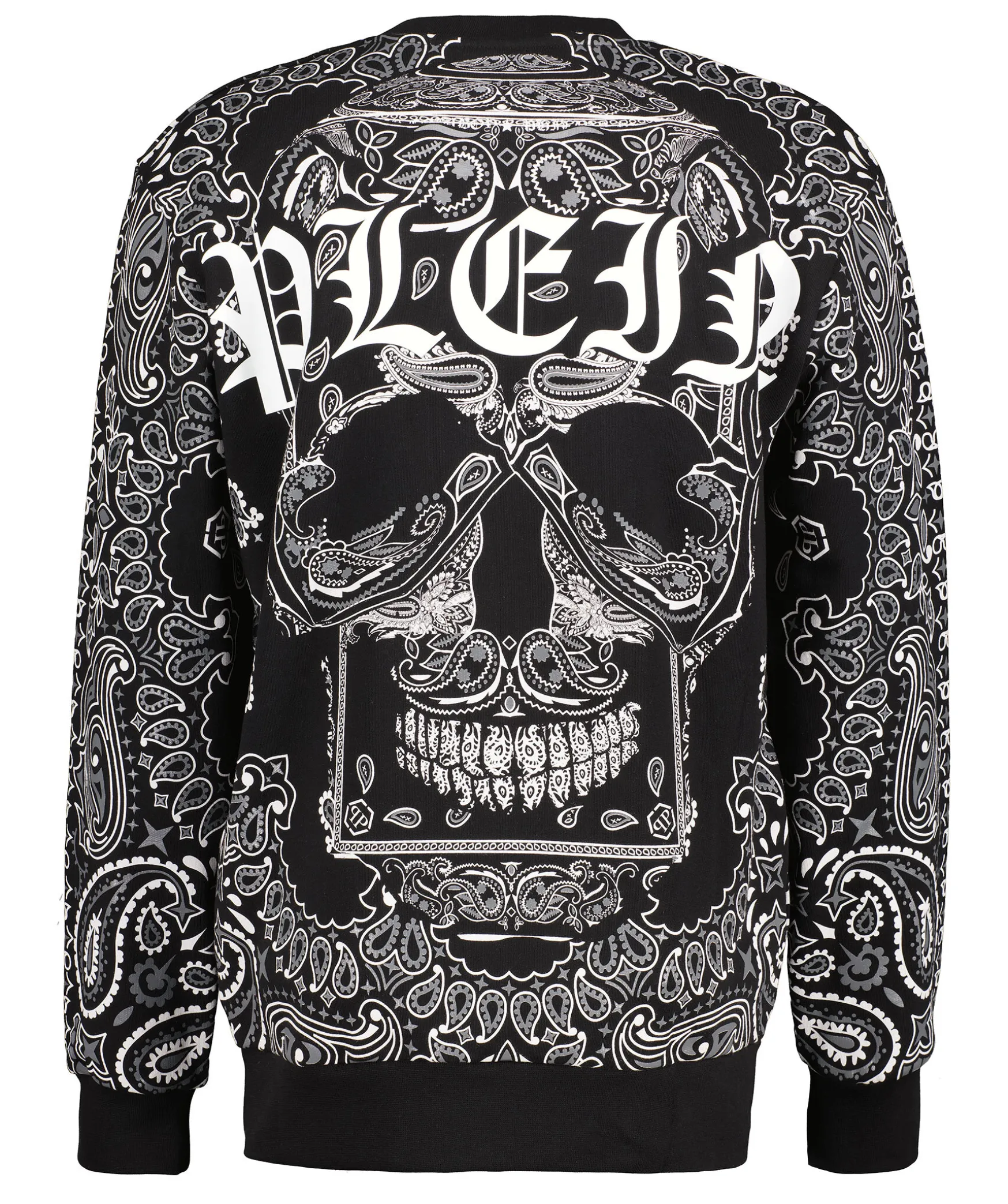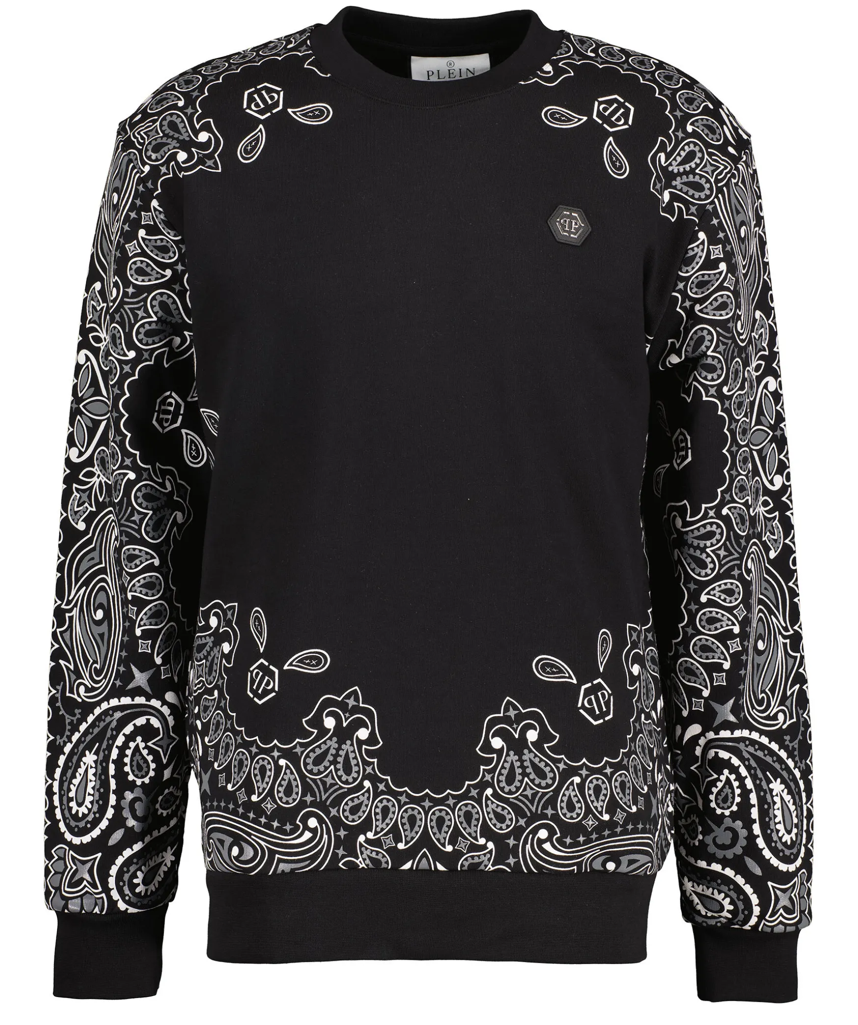 Svart Sweatshirt Med Placerat Paisley-Tryck I Bandana-Stil Fran Philipp Plein. Pp Hexagon Pa En Saffian Laderlapp Sys Pa Vanster Brost. Ribbstickad Halsringning Och Muddar Vid Arm- Och Plaggslut. Tillverkad I 100% Bomull.