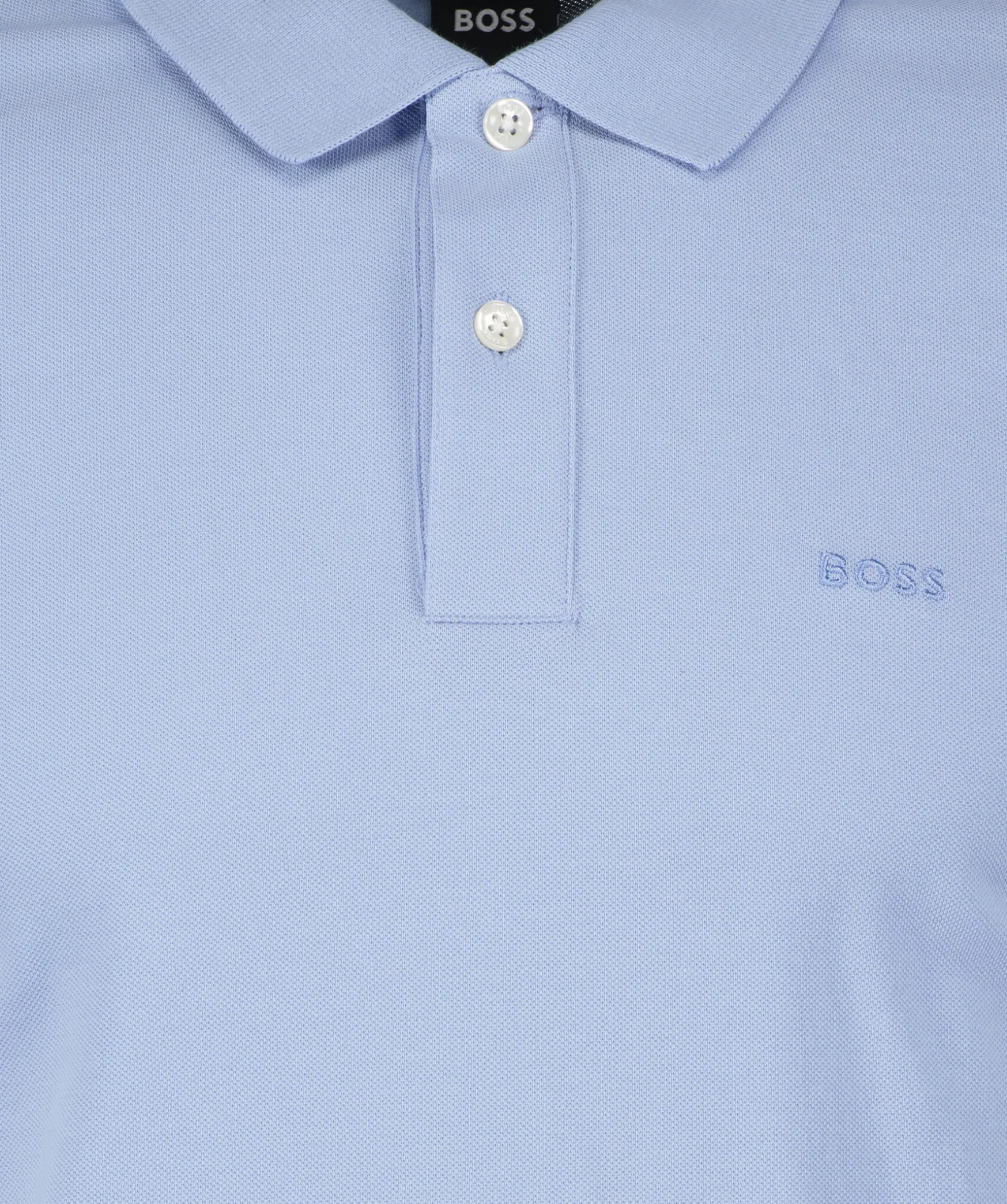 Ljusbla Kortarmadpike Fran Boss Black Gjord I 100% Bomull. Knappsla Med Tva Knappar, Ribbade Krage Och Mudd Vid Armslut. Liten Ton-I-Ton Logotyp Broderad Pa Brostet. Sma Sidoslitsar.