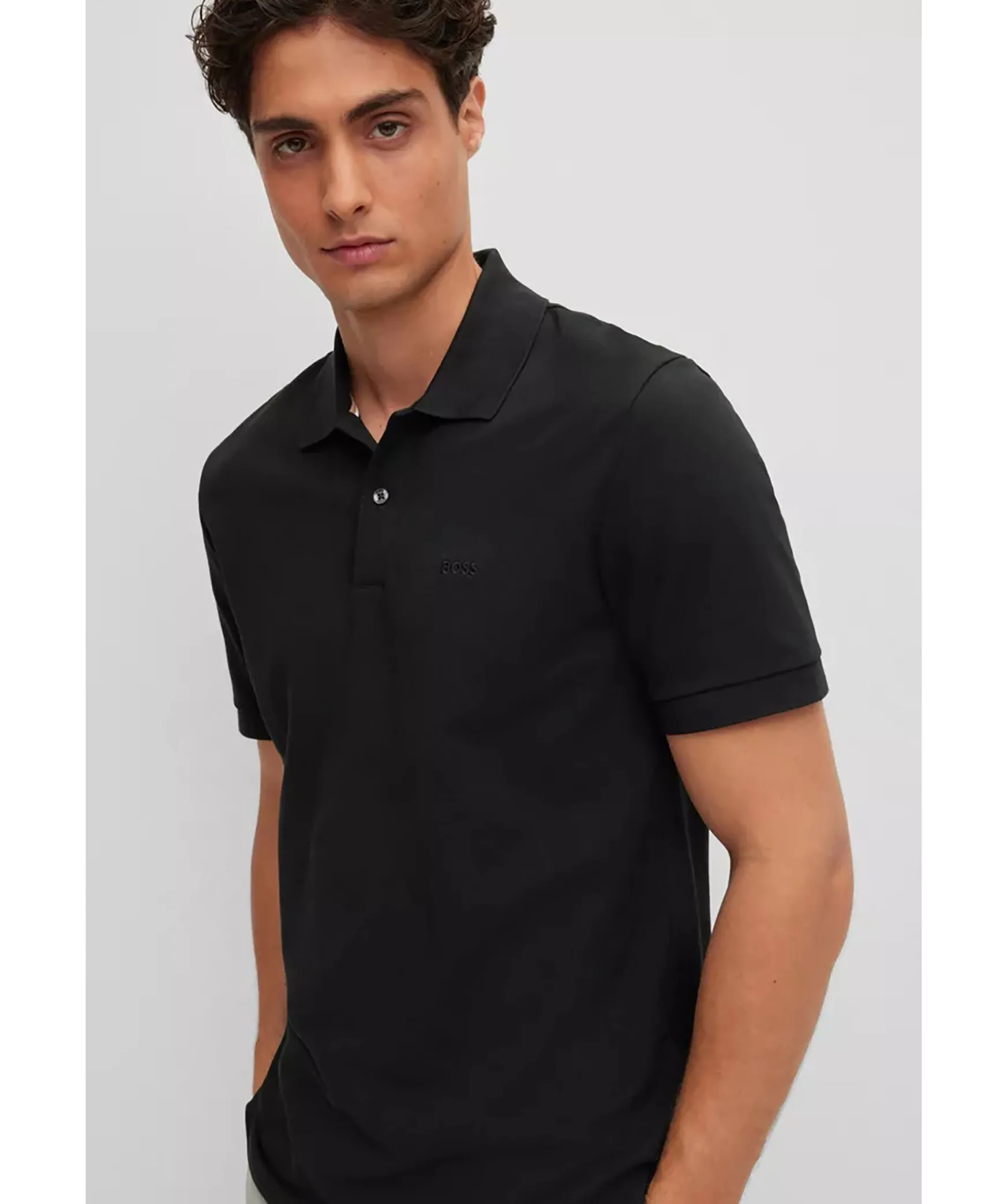 Svart Kortarmadpike Fran Boss Black Gjord I 100% Bomull. Knappsla Med Tva Knappar, Ribbad Krage Och Mudd Vid Armslut. Liten Ton-I-Ton Logotyp Broderad Pa Brostet. Sma Sidoslitsar.
