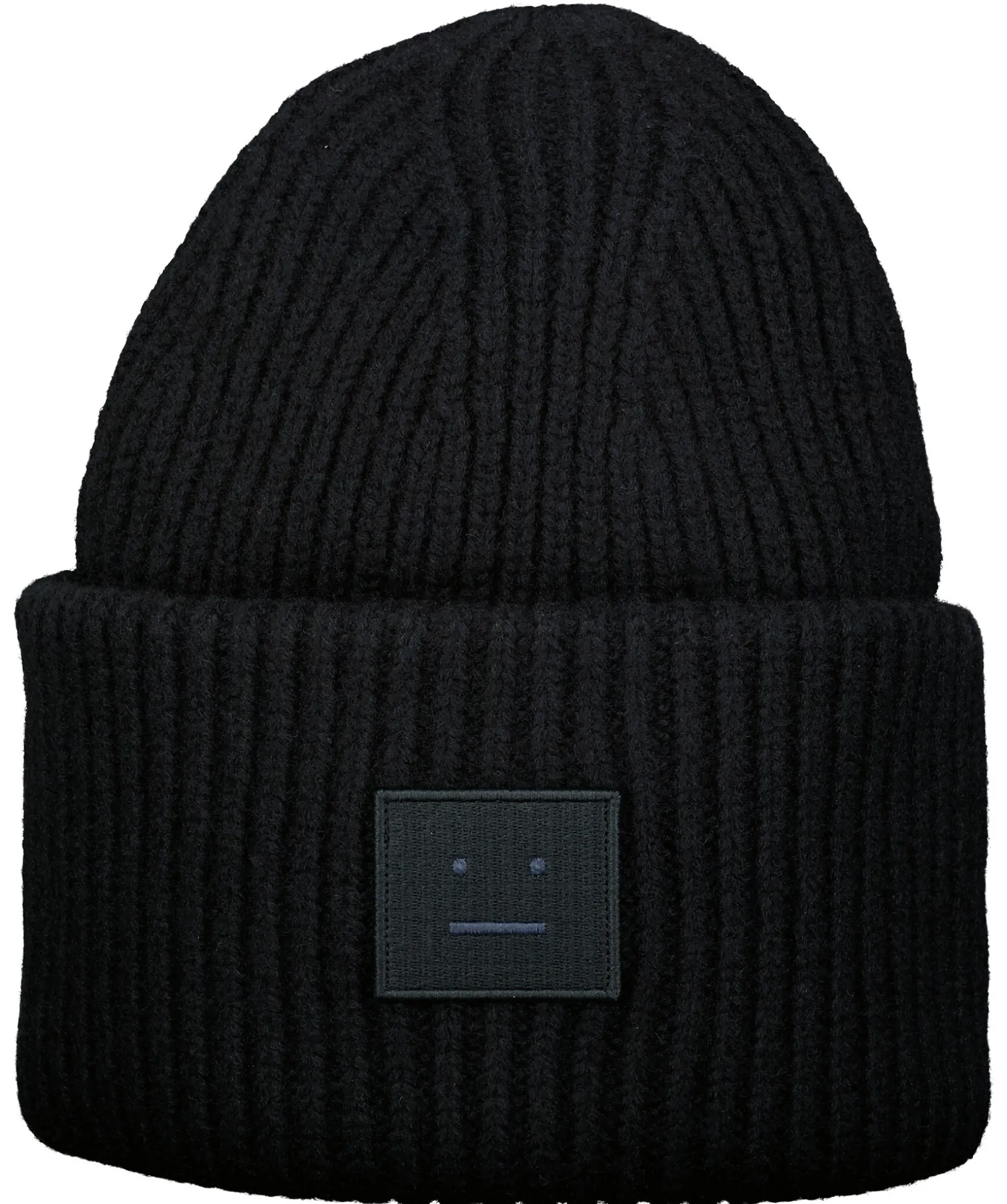 Svart, Ribbstickad Oversizemossa Fran Acne Studios. Tillverkad Av Mjuk Ull, Har En Bred Uppvikt Kant Och En Broderad Patch Med Acnes Ikoniska Face-Logga Fram.