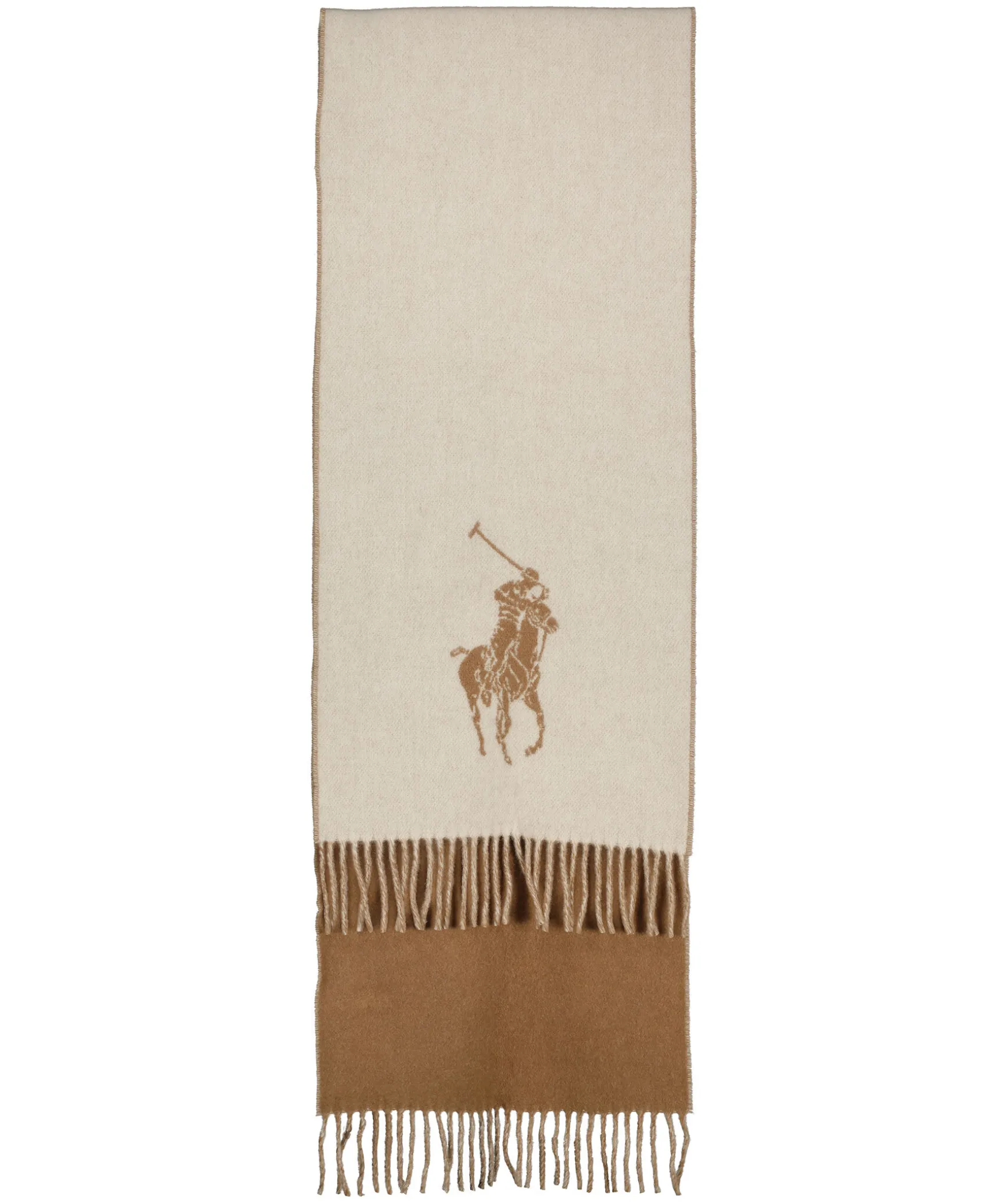 Kamelfargad Halsduk Fran Polo Ralph Lauren. Stor Logotyp Med Deras Signatur Pony. Tillverkad I En Ull Och Nylonblandning. Halsdukens Matt Inklusive Fransar; 195Cm X 38 Cm