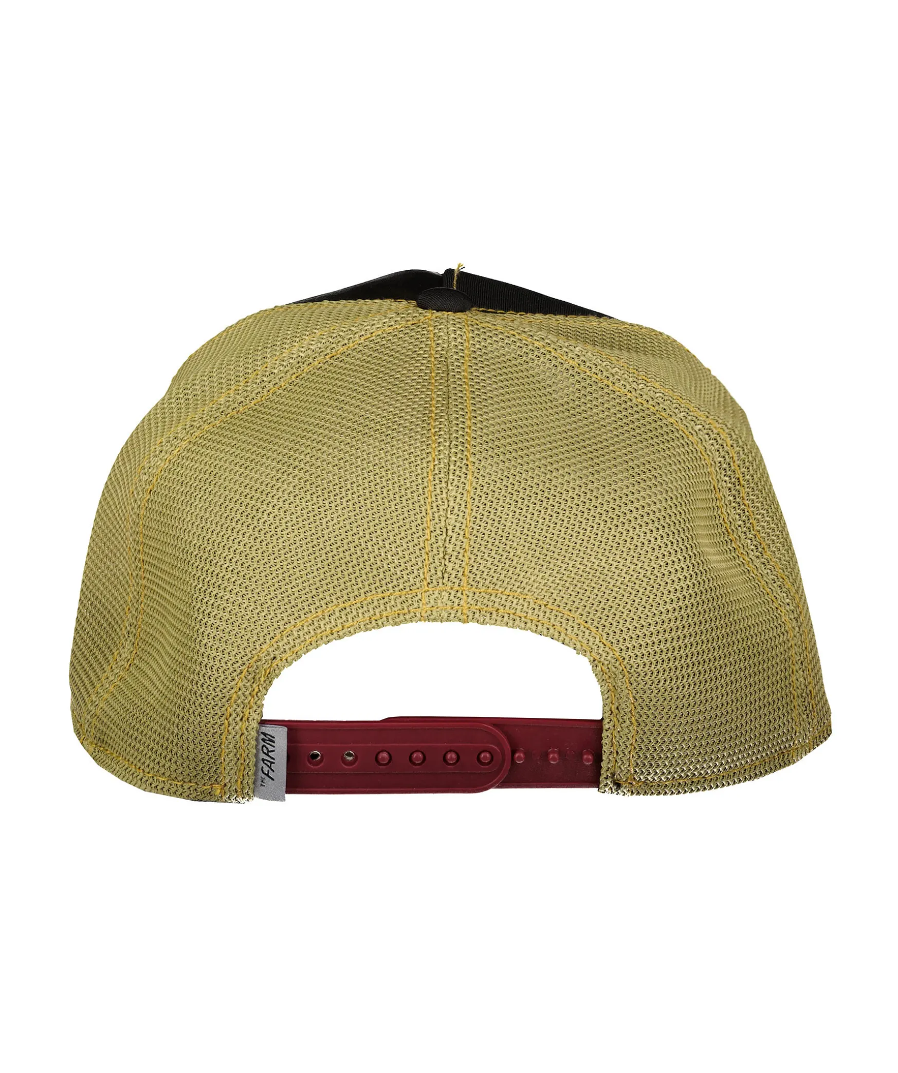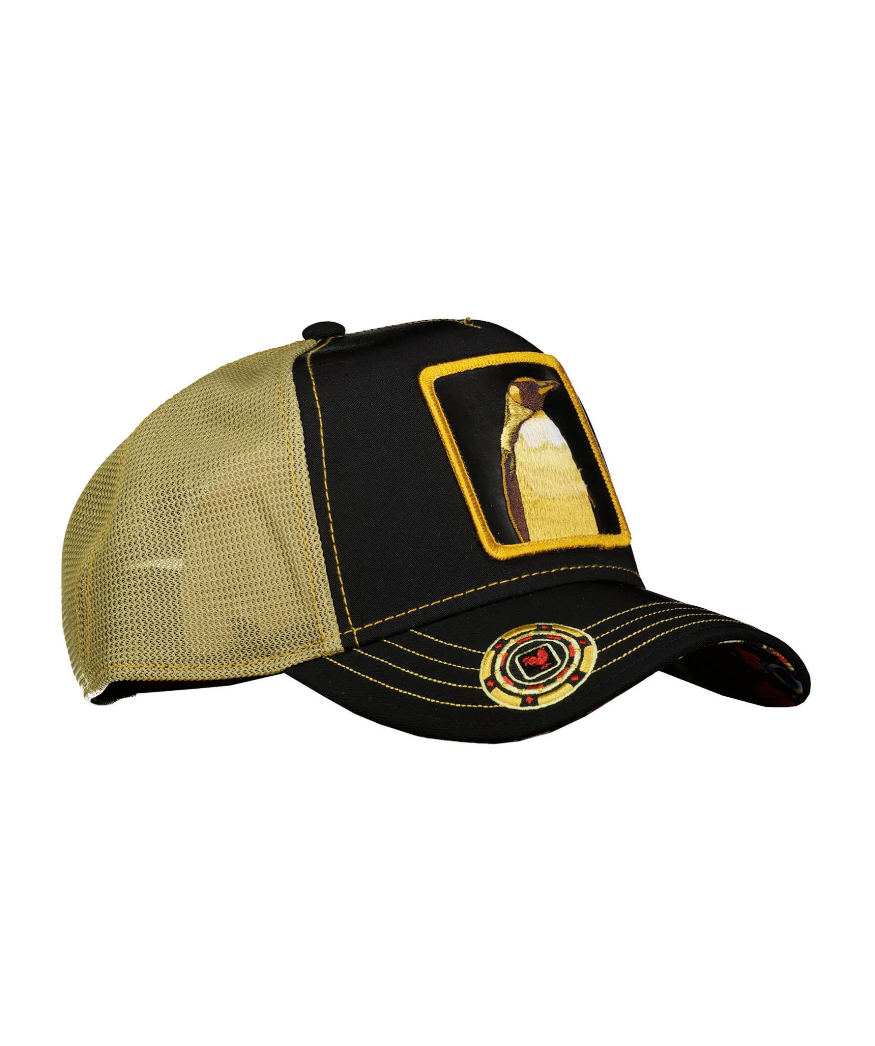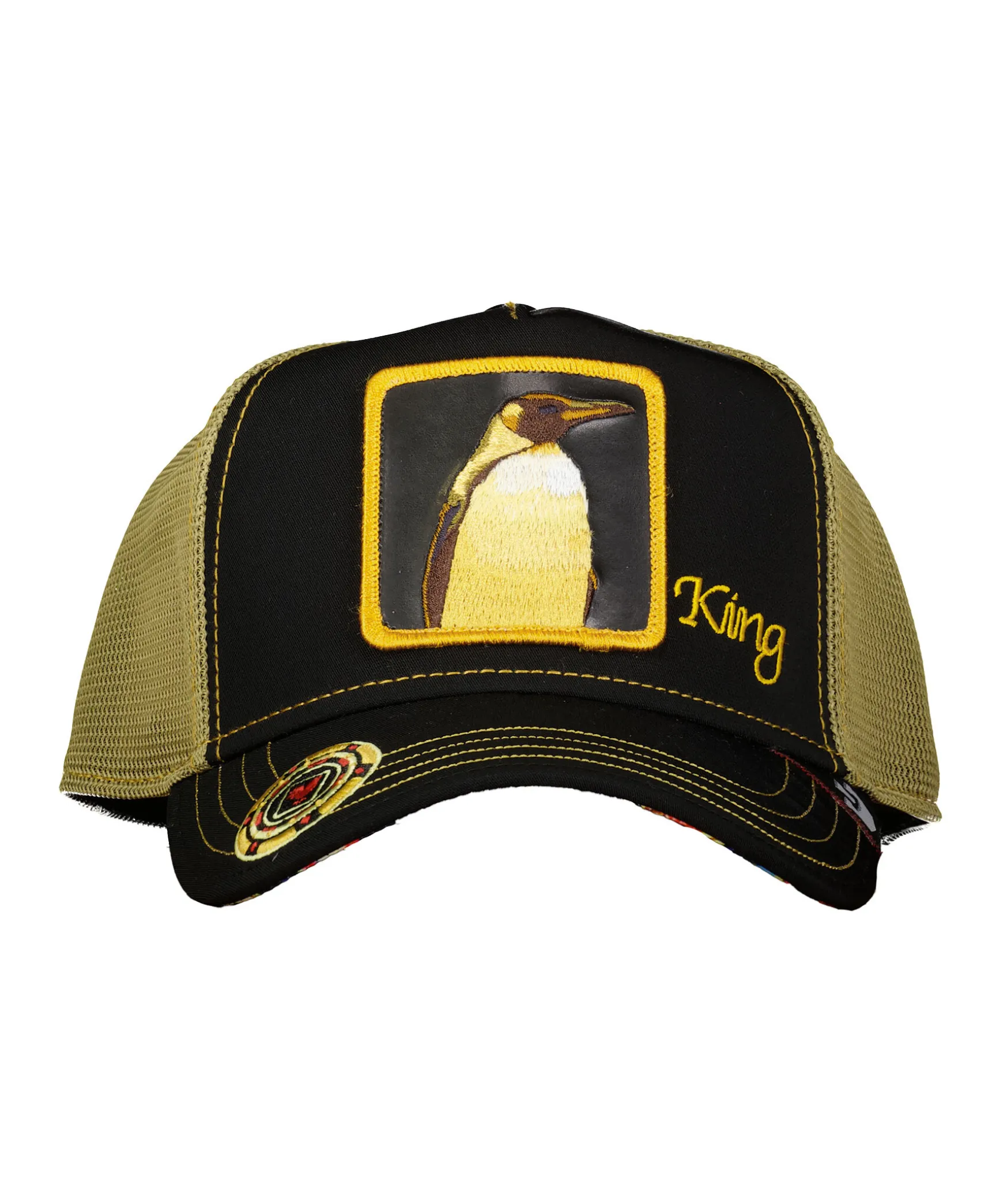Svart Keps Med Gront Meshtyg I Trucker-Basebollmodell Fran Goorin Bros. Fyrkantig Patch Med En Pingvin. Tryck I Mork Blatt Med Spelmotiv I Olika Farger Pa Skarmens Undersida. Broderat Marke Pa Skarm. Broderad Text ”King” Framtill. Gula Sommar. Onesize Modell Med Ett Justerbart 4-Snap-In-Rem.