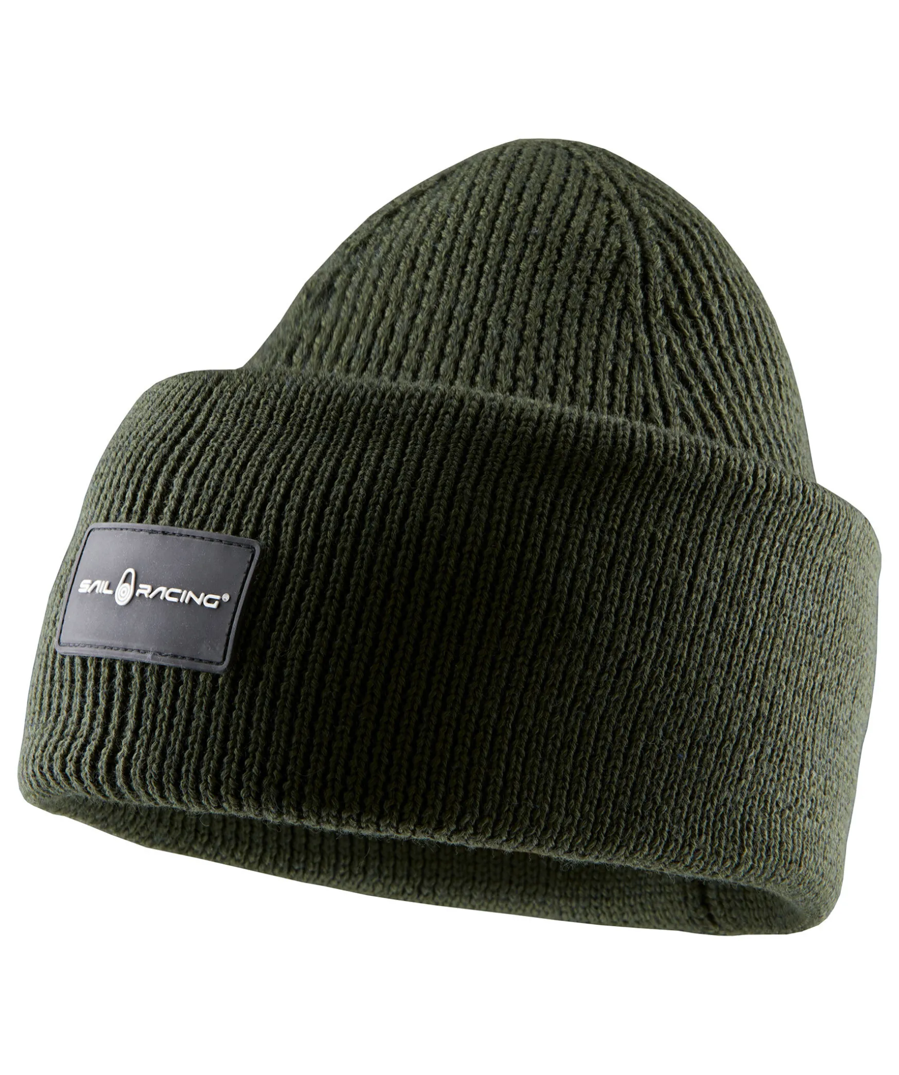 Skogsgron Mossa Tillverkad I Ullblandning Fran Sailracing. Uppvikt Kant Och Svart Patch Med Logga Centrerad Pa Den Vikta Delen.