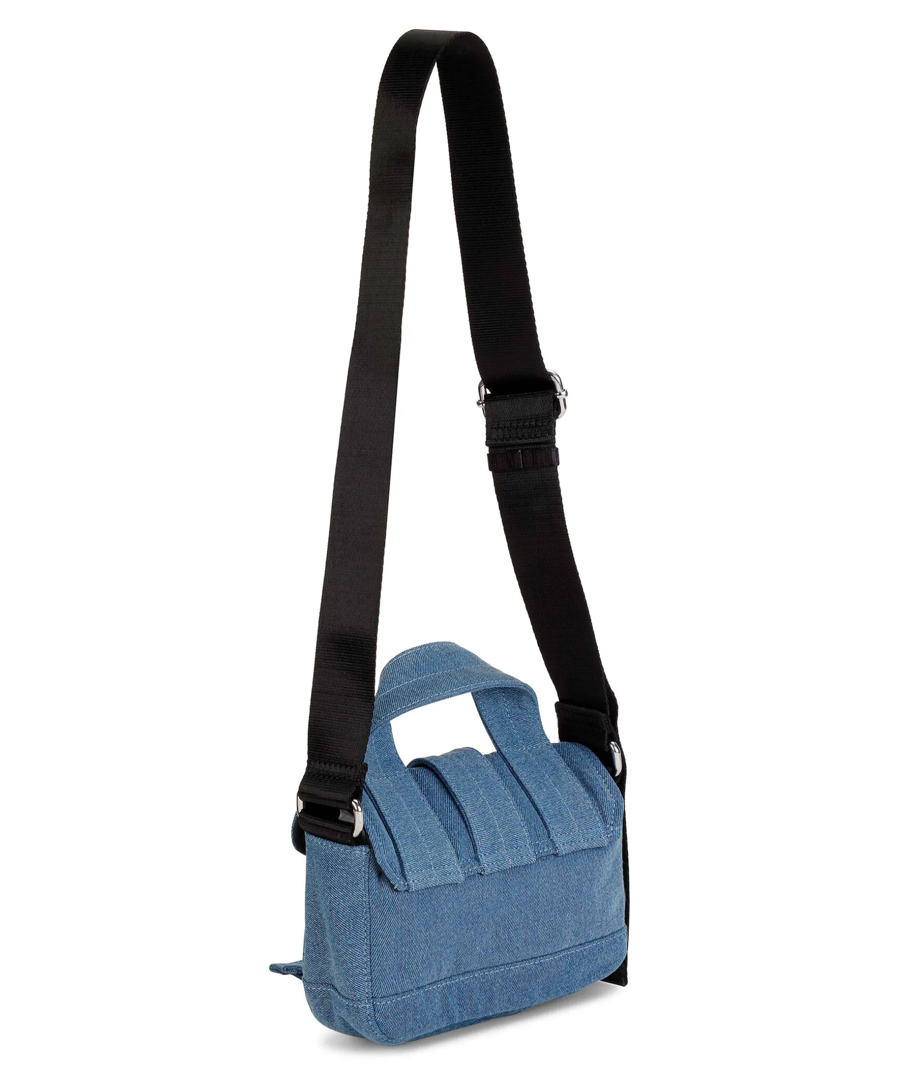 Minivaska Fran Ganni I Denimmaterial. Denna Recycled Denim Mini Satchel Vaska Ar Tillverkad Av Bomull Med Ett Polyesterfoder. Vaskan Har Ett Topphandtag, En Framklaff Med Ganni Butterfly-Spanne, En Justerbar Axel-/Crossbodyrem Och Banddetaljer Med Ganni-Logotyp.