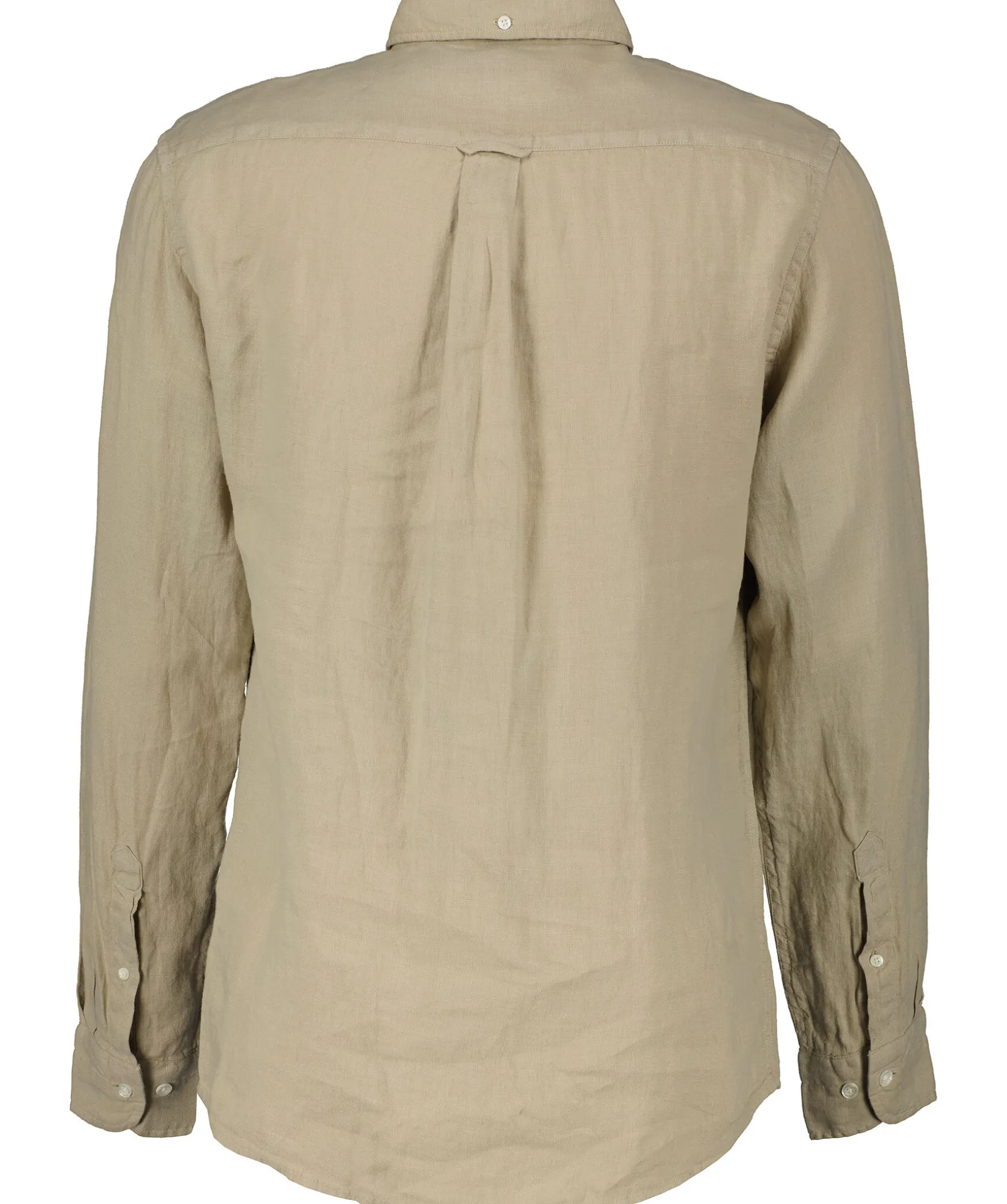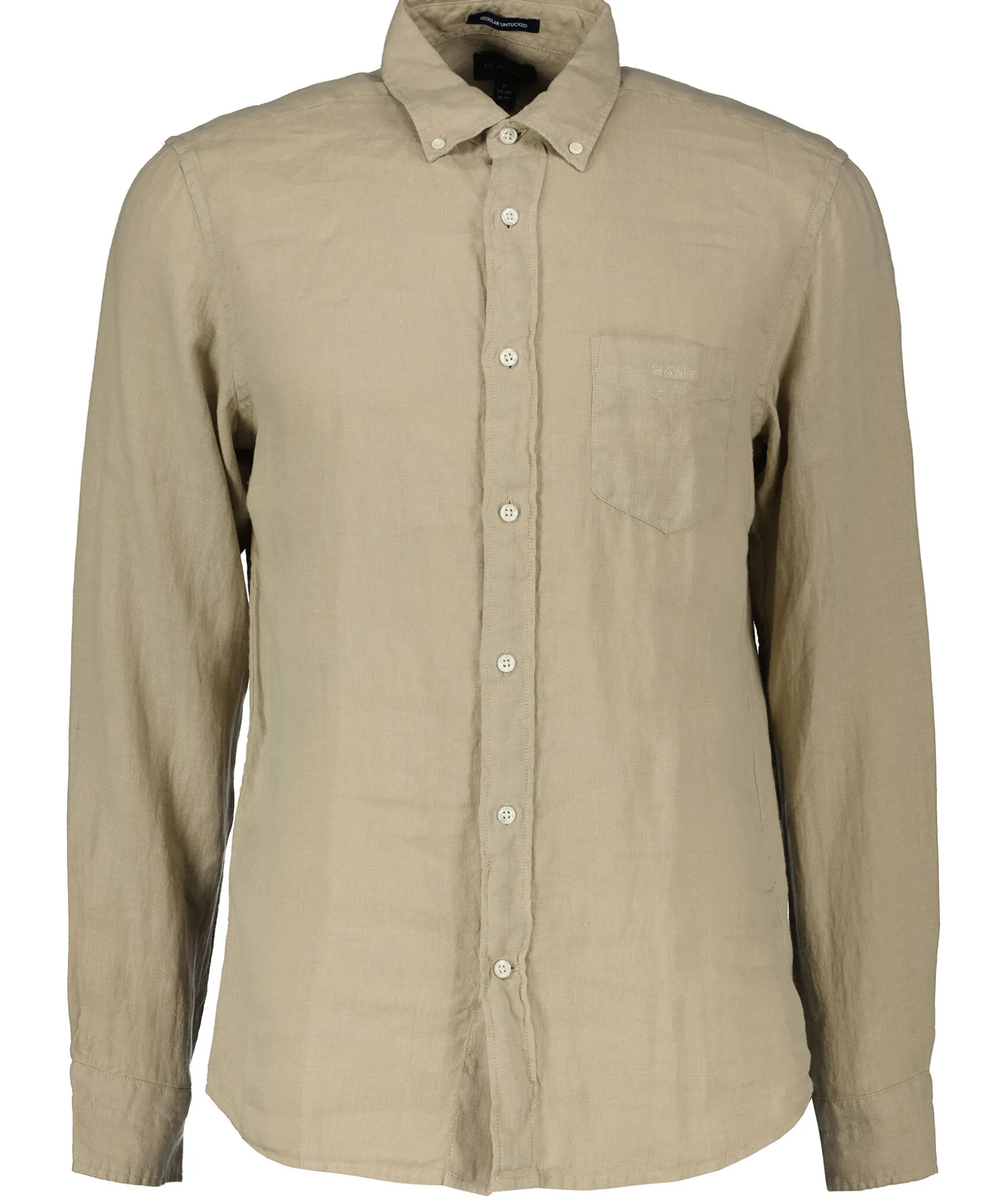 Beige Skjorta I Regular Fit Fran Gant. Tillverkad 100% Linnetyg. Har Vita Knappar Hela Vagen Fram, Button Down Krage Och Dubbla Manschetter. Liten Broderad Logotyp Pa Vanster Brost.