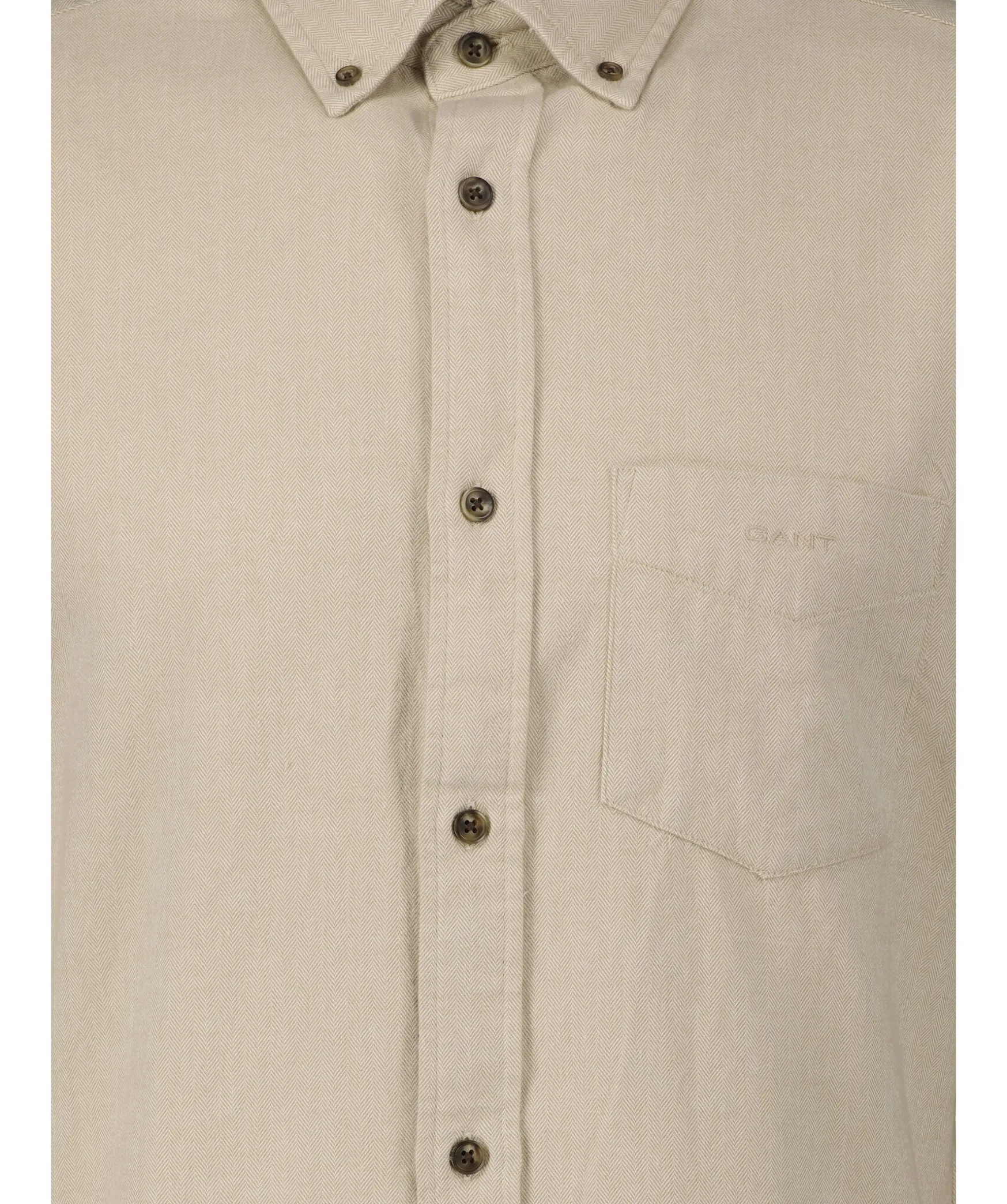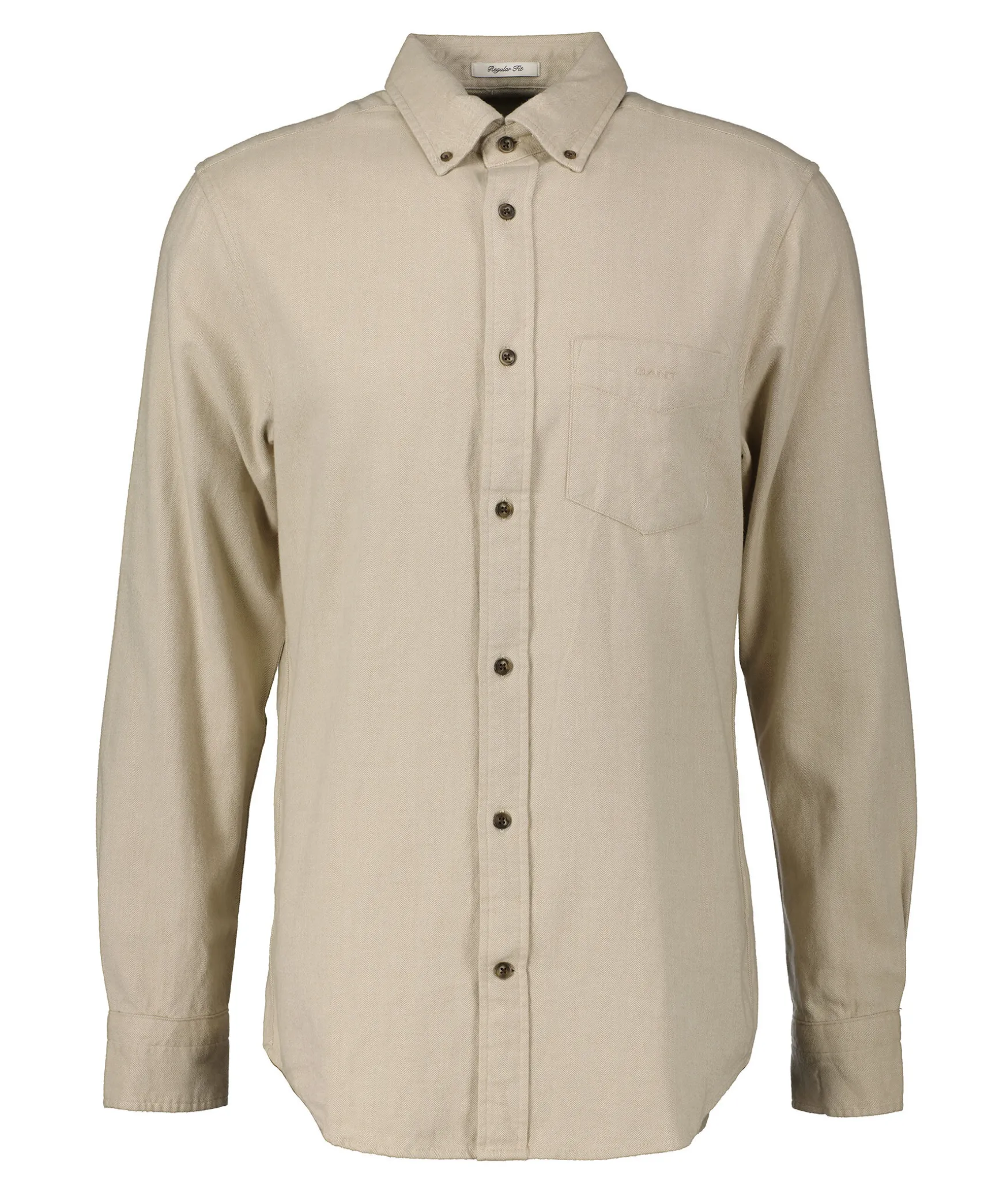 Beige Fiskbensmonstrad Flanellskjorta Fran Gant. Brostficka Pa Vanster Sida Med Broderad Logotyp. Enkla Manschetter. Button Down-Krage. Tillverkad I 100% Bomull. Boxpleat Med Locker Loop I Ryggen.